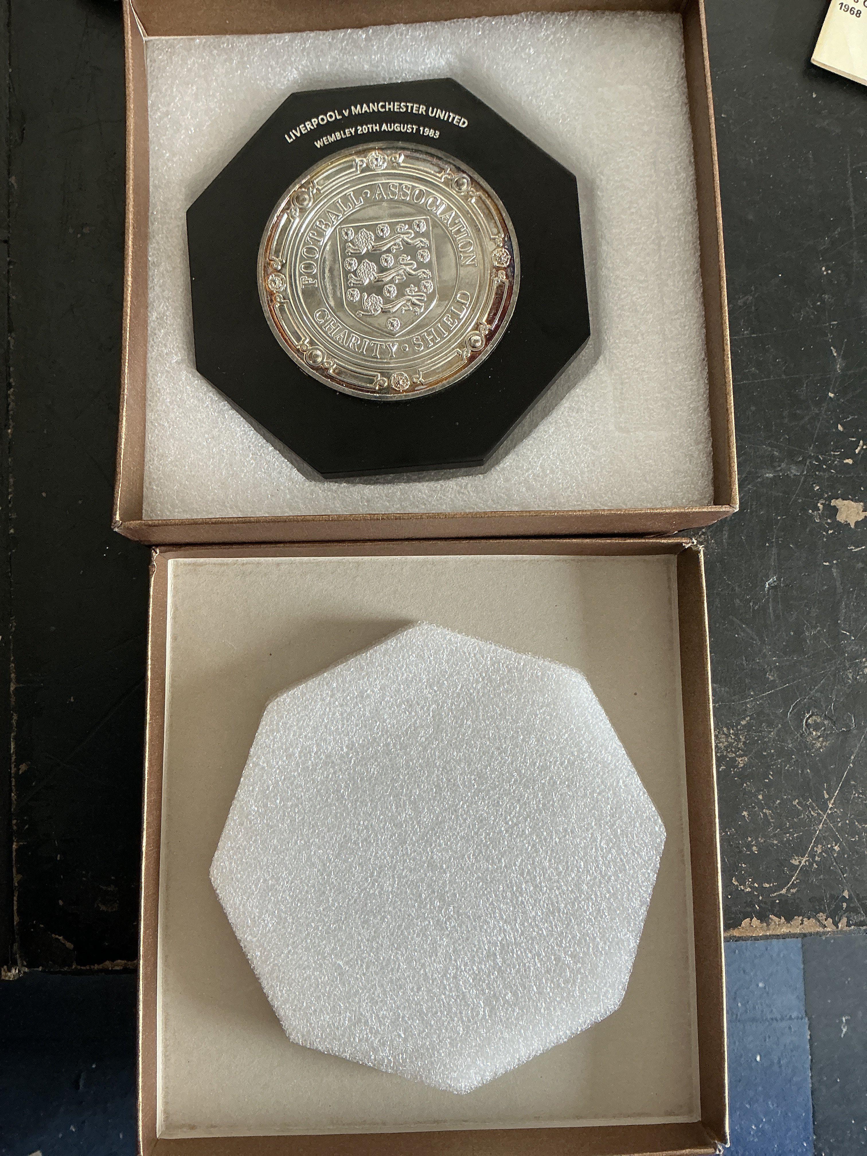 1983 Replica Charity Shield Manchester United v Liverpool Plaque: Identical to ones handed to players that have fixture and date to top. Slight tarnishing to edge of metal. Manchester United won 2-0. Comes in presentation box.