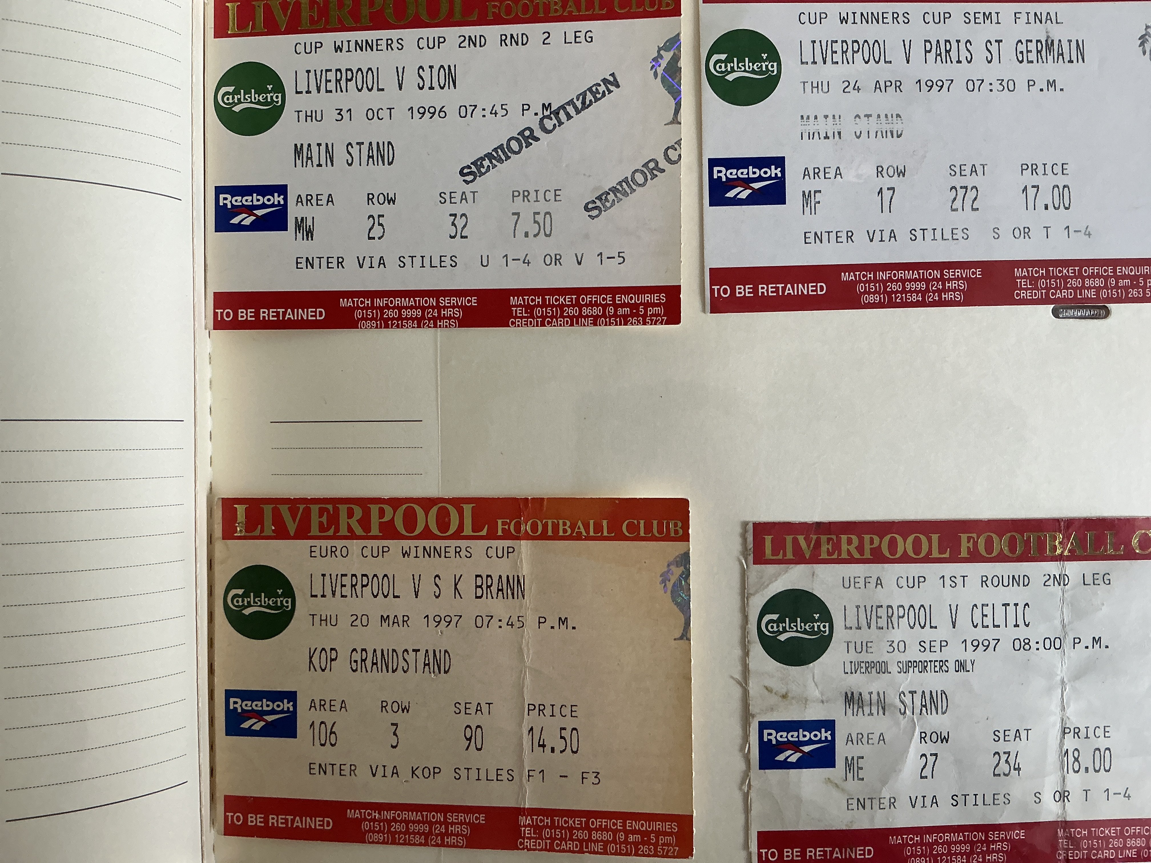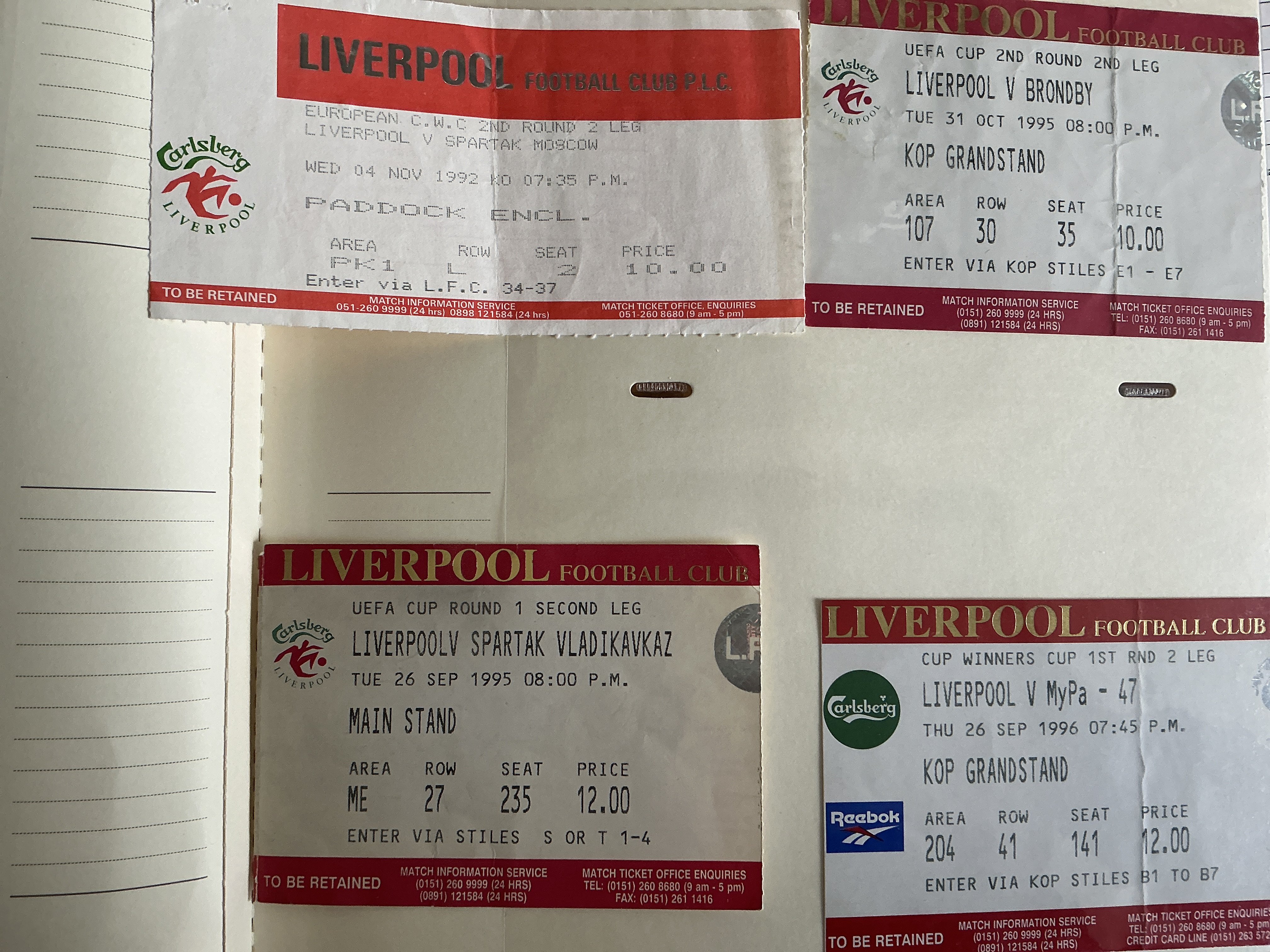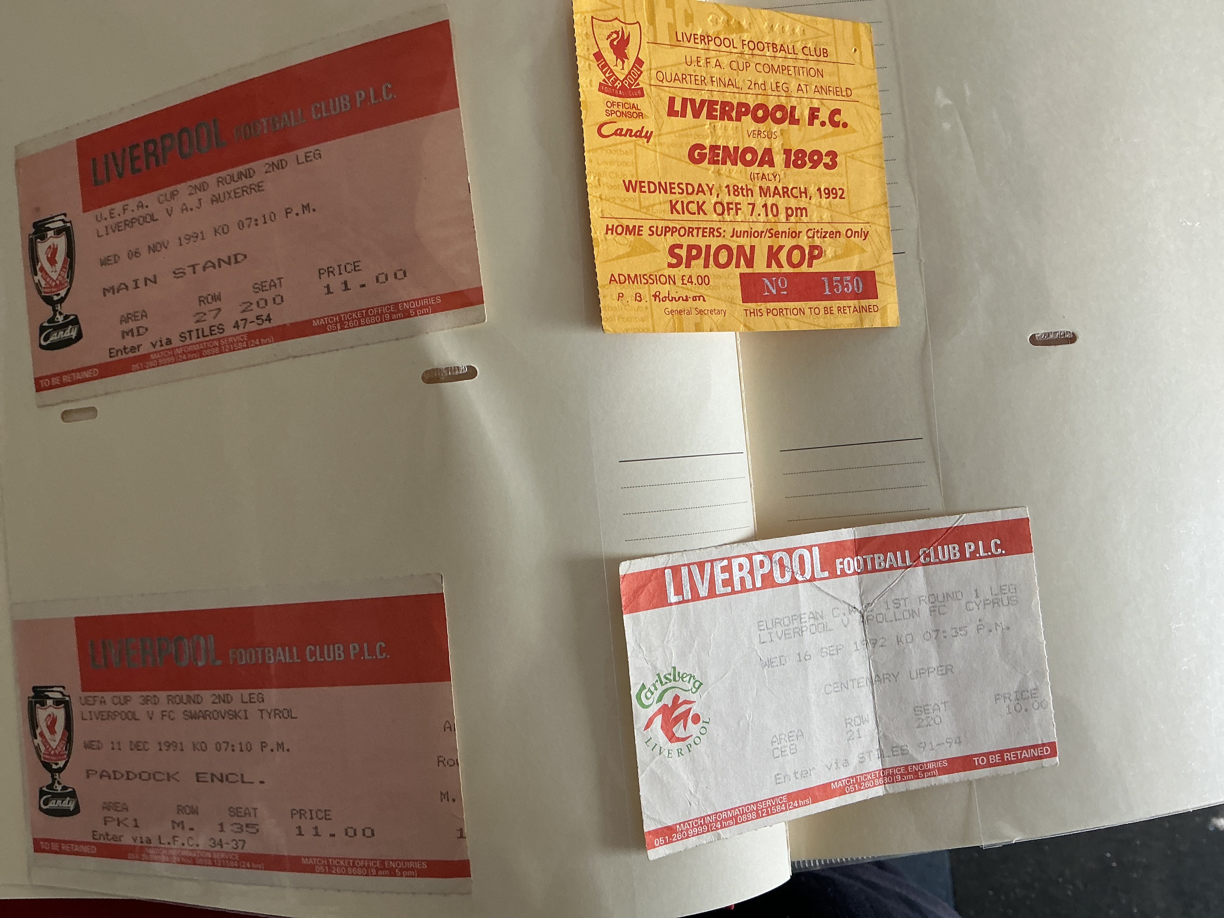 Liverpool Complete European Football Ticket Collection: Complete run of all European home tickets from 1991 - 1992 to 2015 - 2016. Neatly displayed in folder and in good condition. (106)