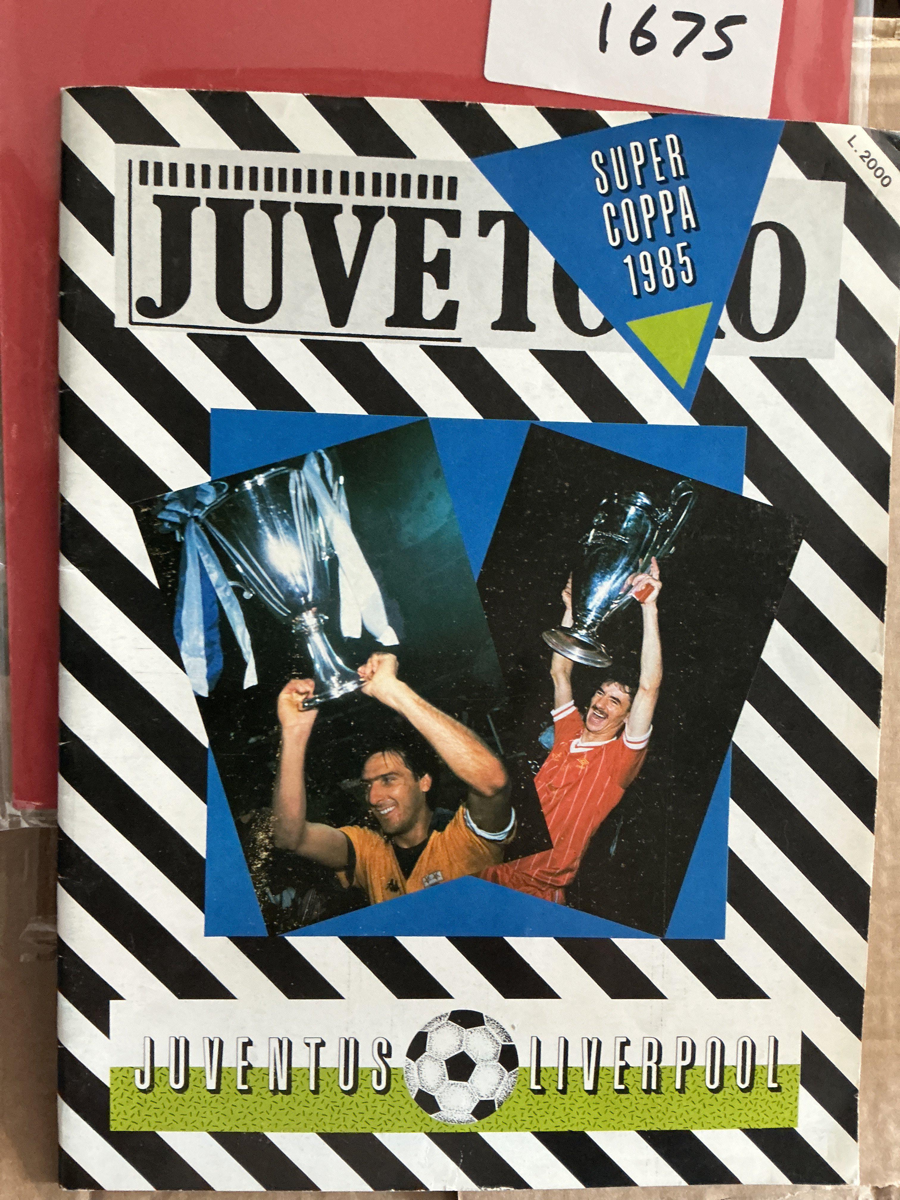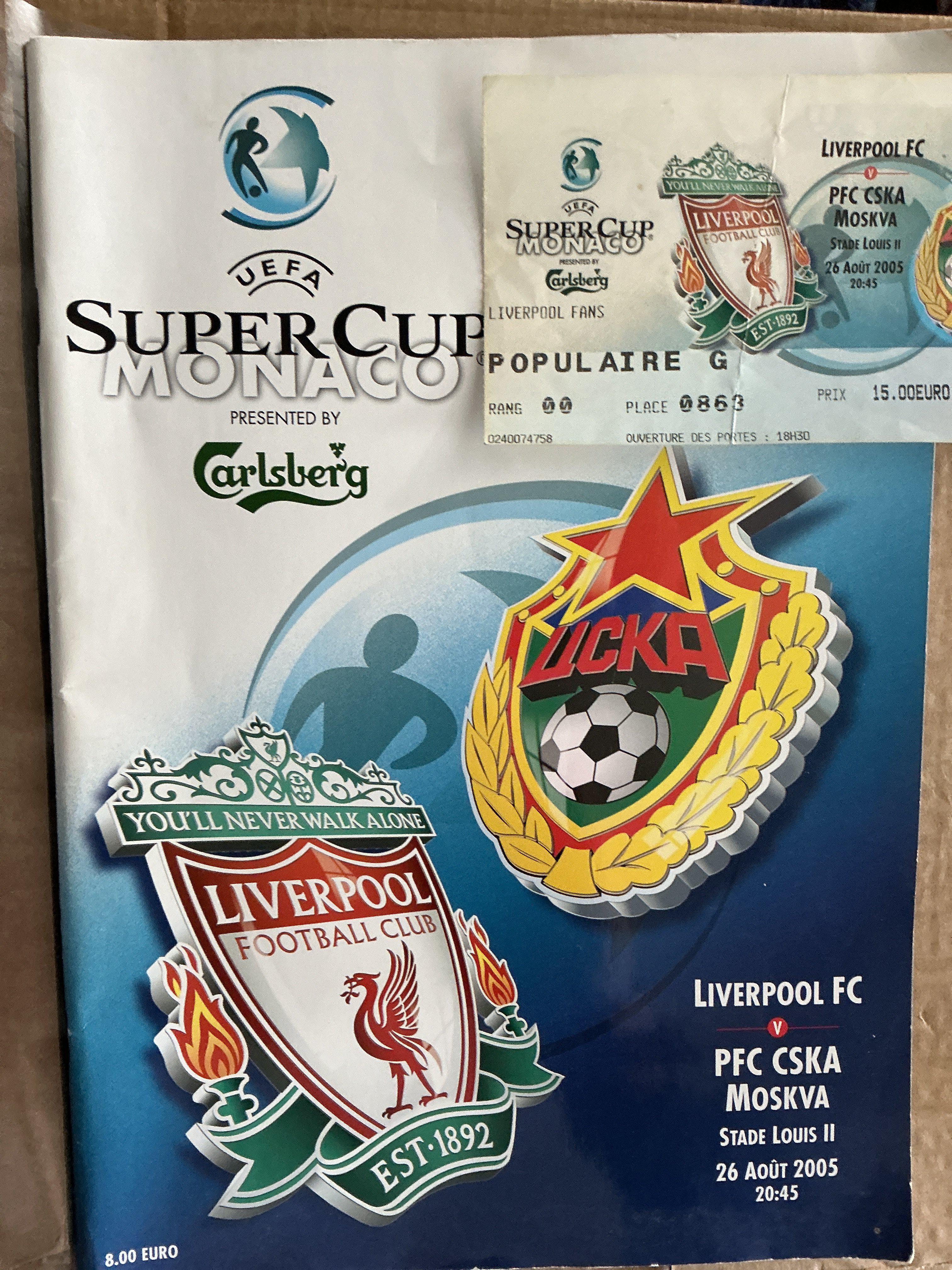 1985 Super Cup Final Football Programme: Juventus v Liverpool in good condition with no team changes. Light fold. C/W 2005 Super Cup Final programme + ticket CSKA Moscow v Liverpool. Programme in very good condition with no team changes. Ticket has fold. (3)
