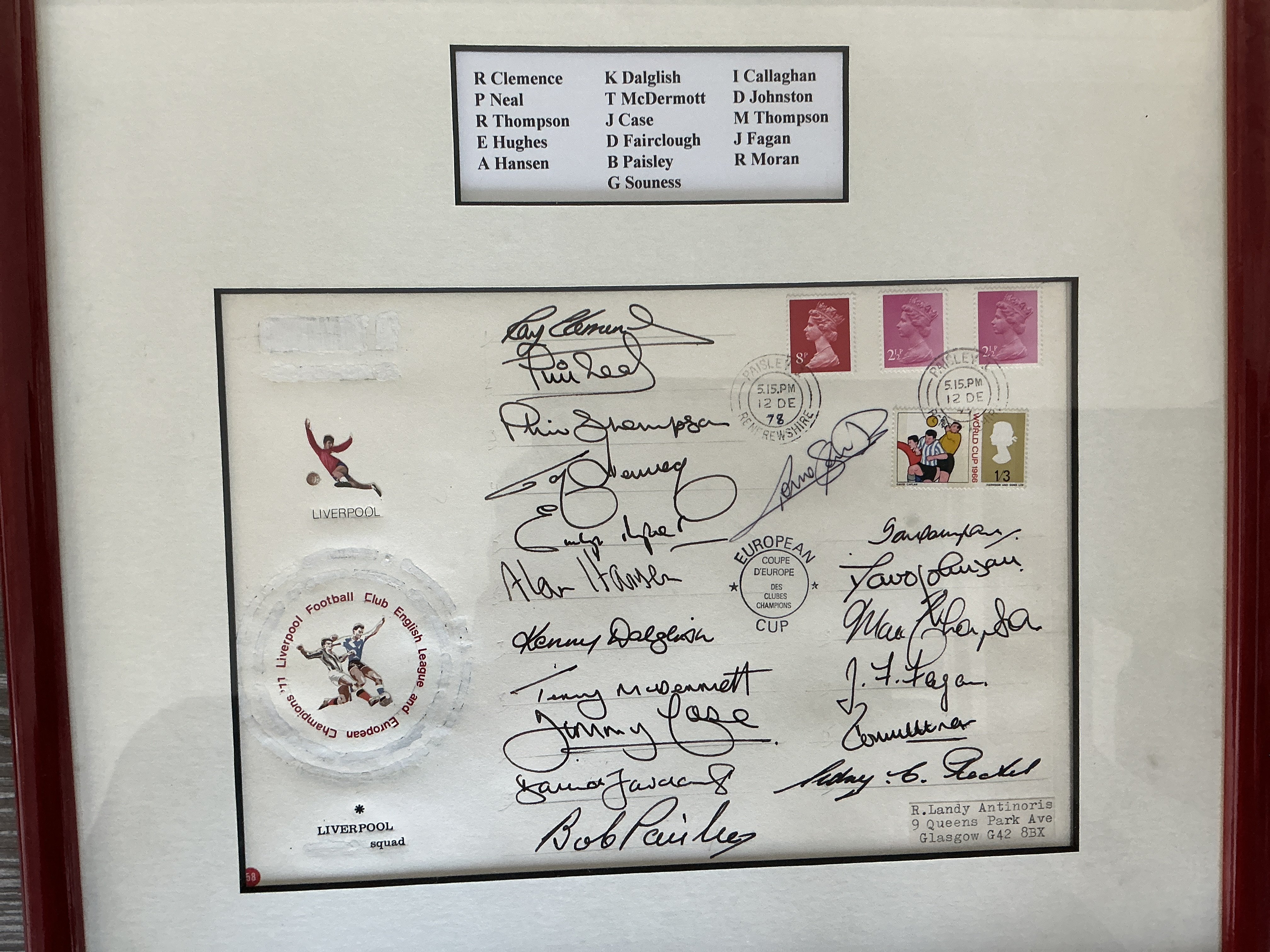 1978 Liverpool European Cup Winners Fully Signed Display: Below Liverpool team group with the European Cup is a large signed first day cover. Plaque names all the 16 that have signed. Full list is Clemence Neal Hughes Hansen Dalglish McDermott Case Fairclough Paisley Souness Callaghan Johnston Thompson Fagan and Moran. Beautifully framed in red with white boards.