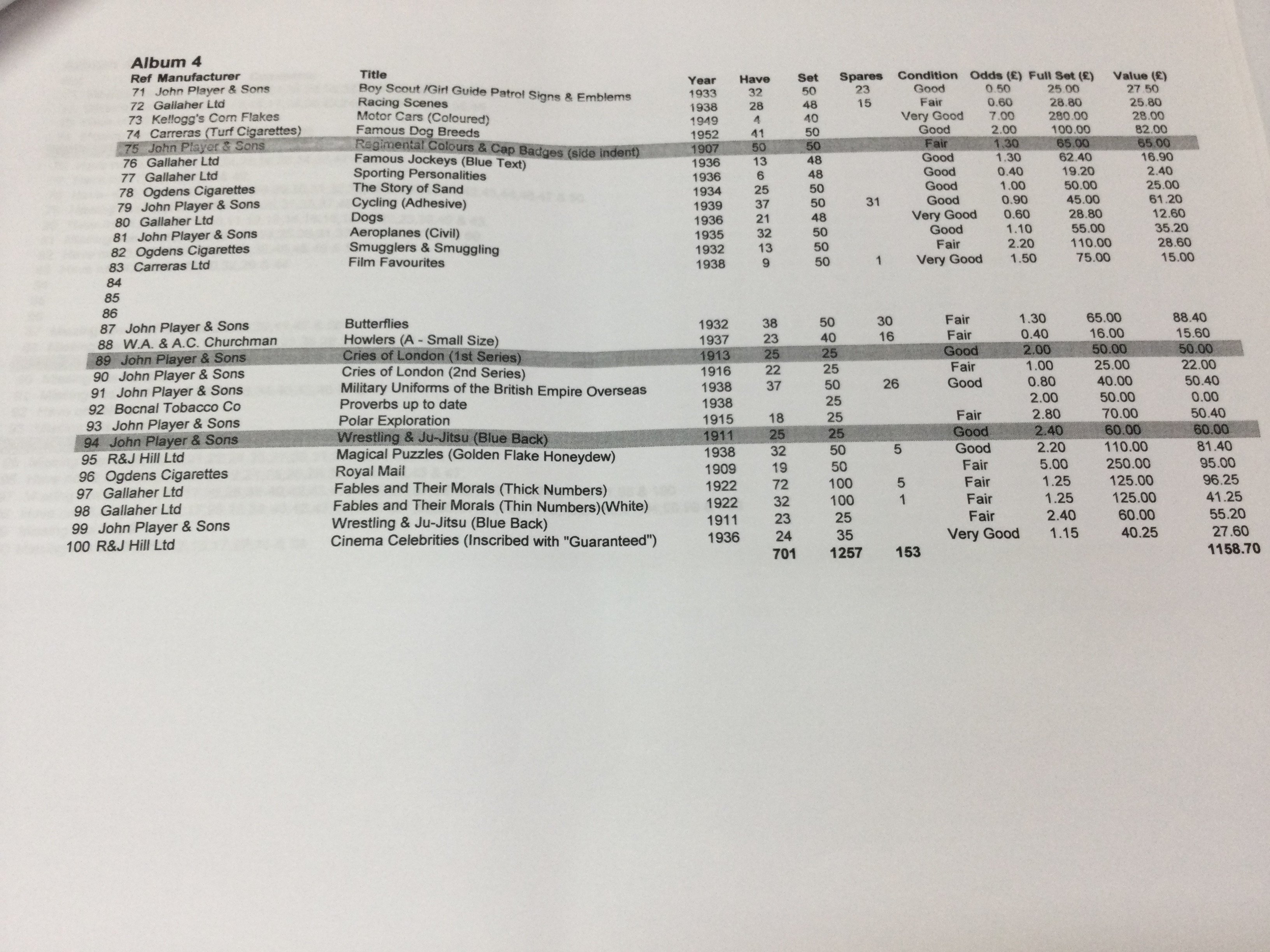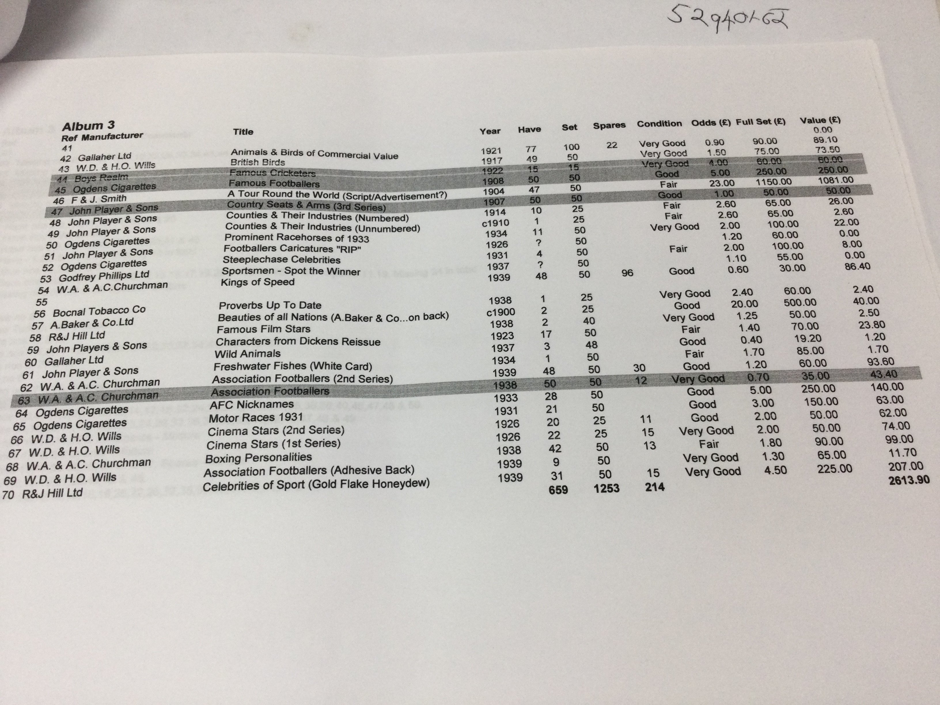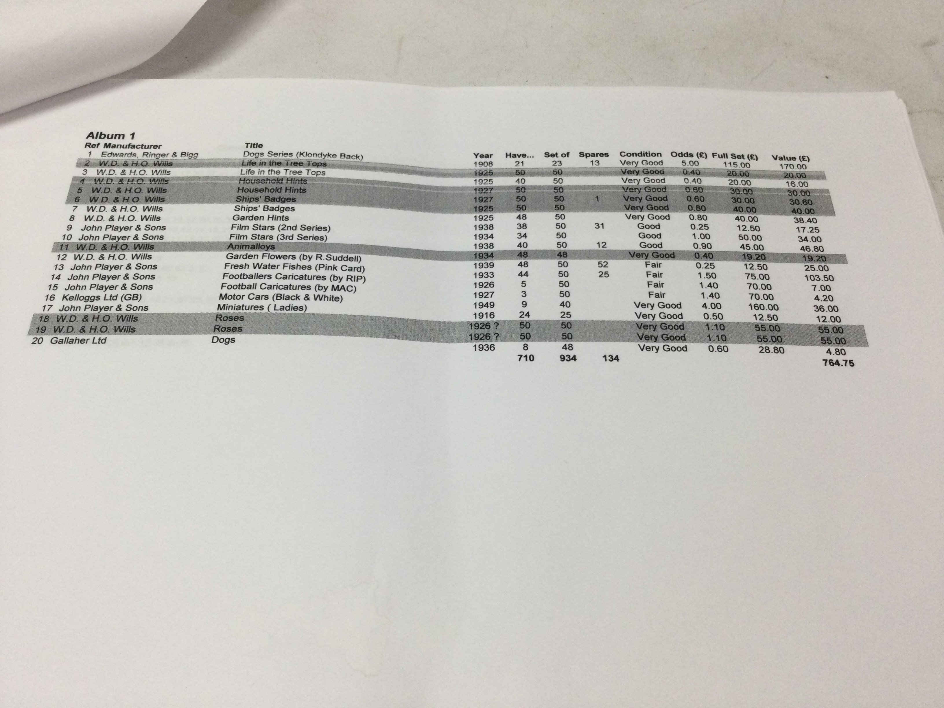 Six albums of cigarette cards comes with a detailed spreadsheet created by vendor of contents (not checked by auctioneers). Postage C