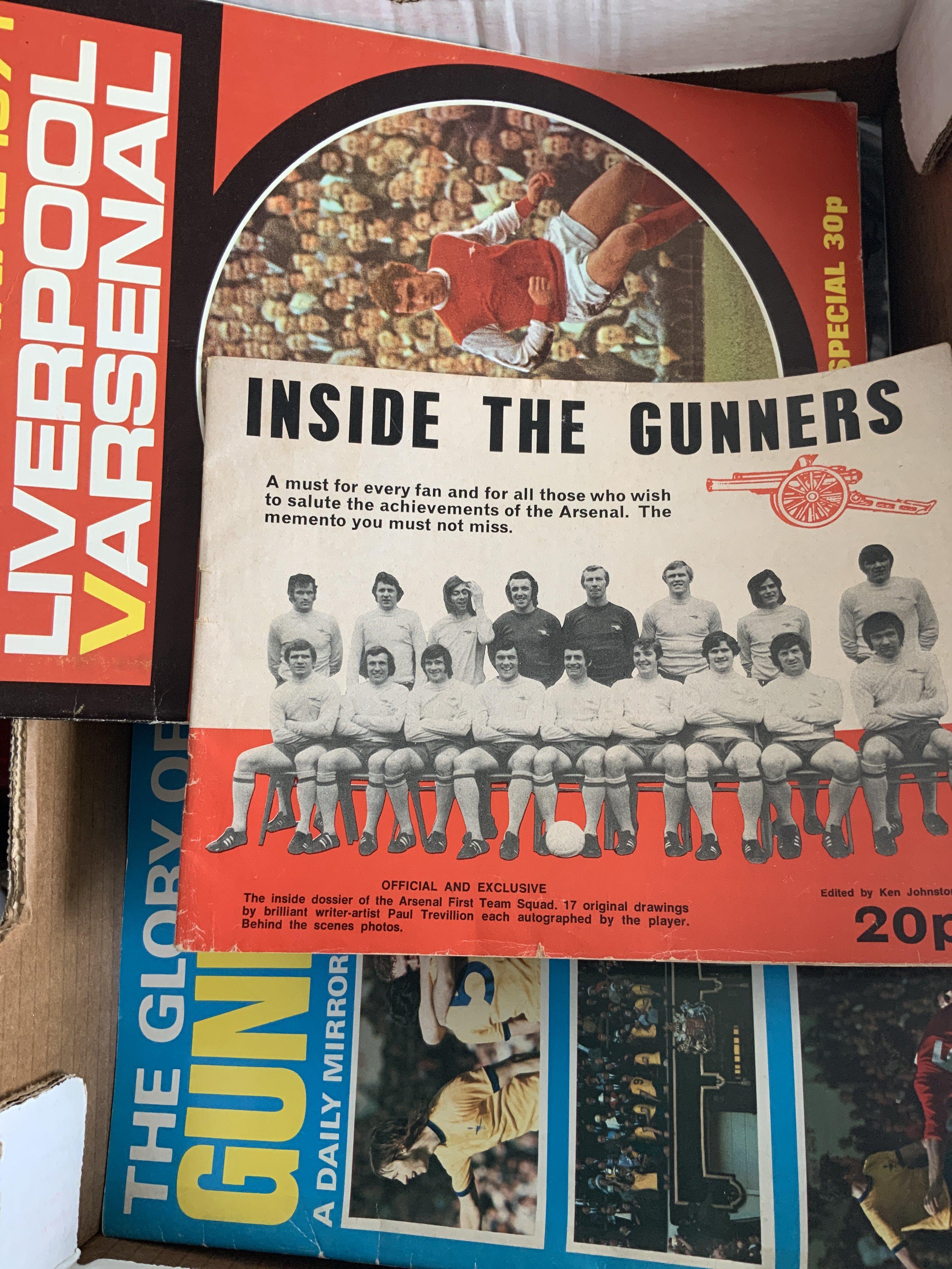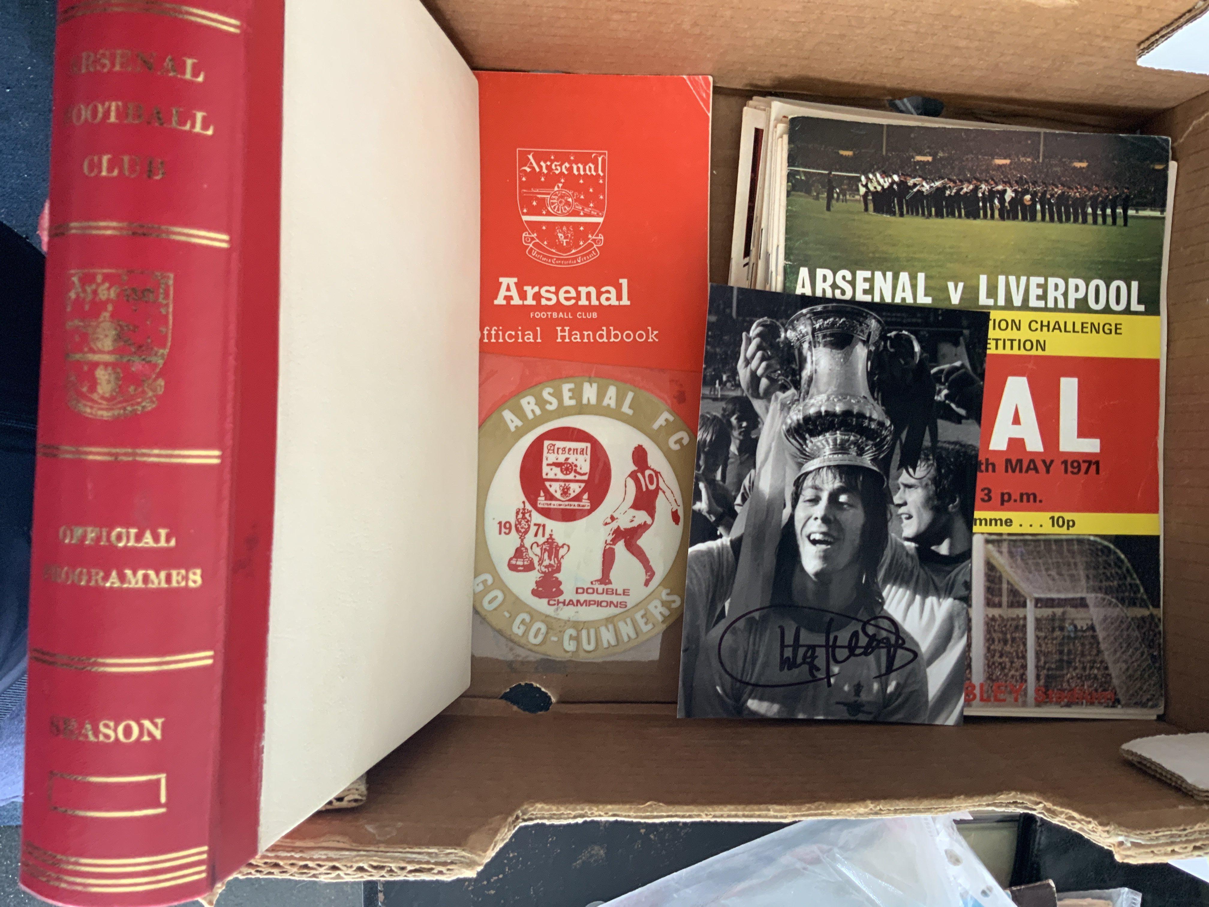 Arsenal 70/71 Home + Away Football Programmes + Memorabilia: 29 home programmes with tokens intact from the double season. There are 19 away programmes including final and semis and title decider at Tottenham. C/W car sticker, papers, magazines programme binder and handbook. (62 items)