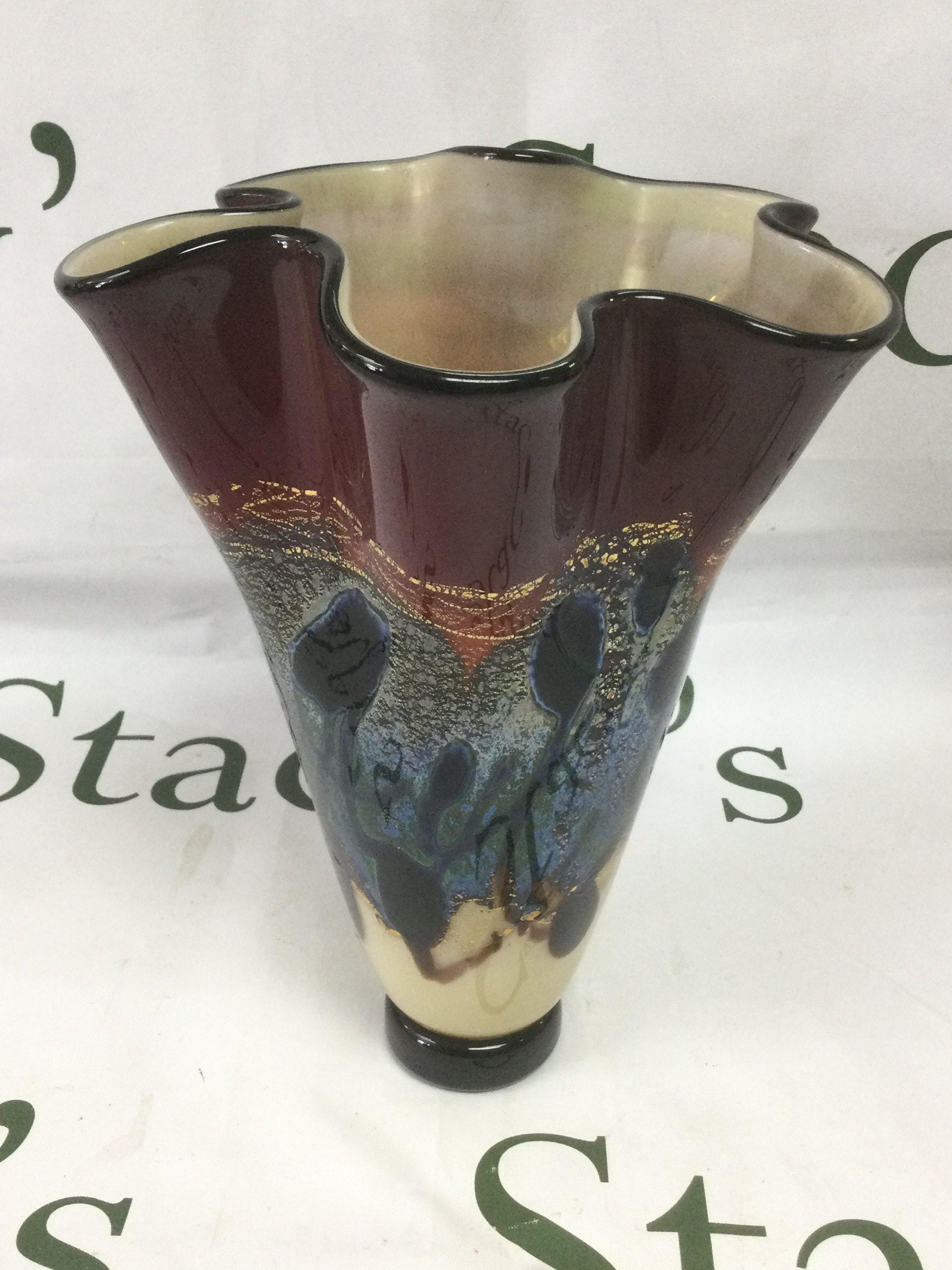 A Michael Nourot art glass vase with flared rim and a mottled iridescent glaze, approx height 22cm. Shipping category D.