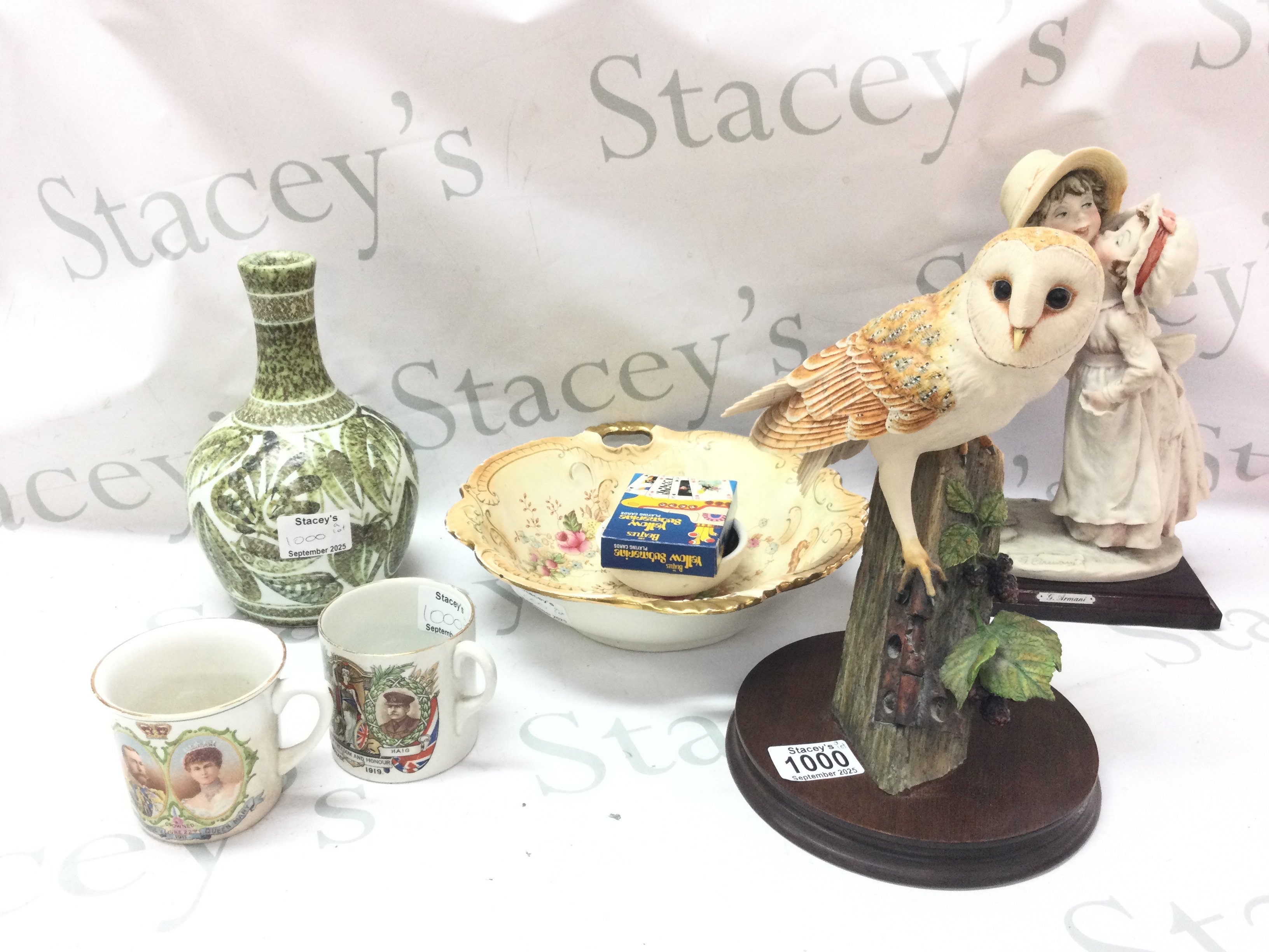 A collection of ceramics including a Crown Devon dish, G .Armani figure group, Bourne Denby vase and a West German Jardiniere with stand. This lot cannot be posted- NO RESERVE