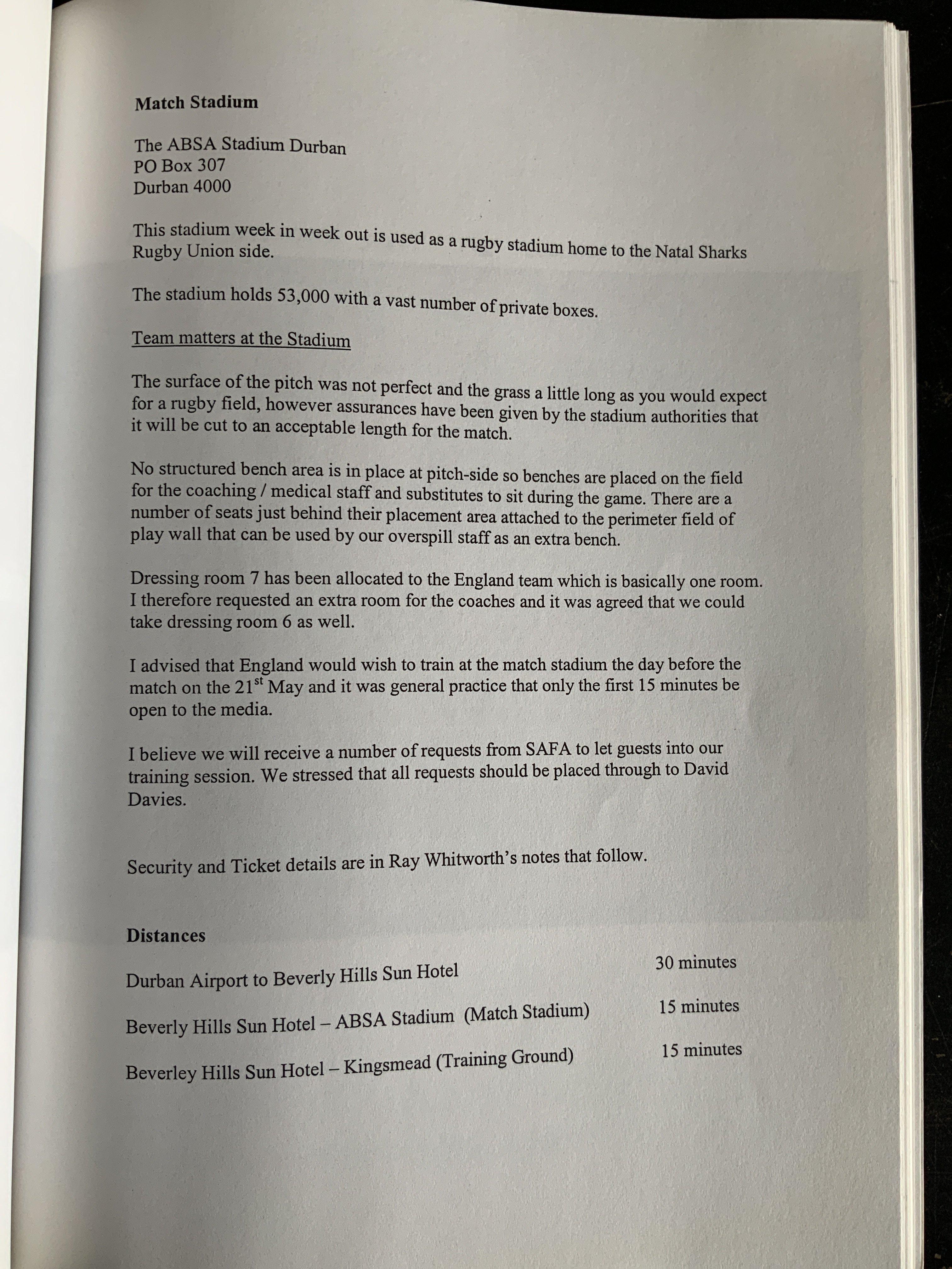 Rare 1999 Youth World Cup Report + More: World Cup reports have been printed for many years but this 1999 FIFA Youth World Cup Report from Nigeria is very unusual and never produced for the public. C/W a very in depth booklet produced for the English FA regarding the 2003 tour to Durban. An incredible insight to include security and pictures of many details including where England fans should be and players entrances, dressing rooms etc and reported in this large document 3 months before proposed match. Interesting. (2)