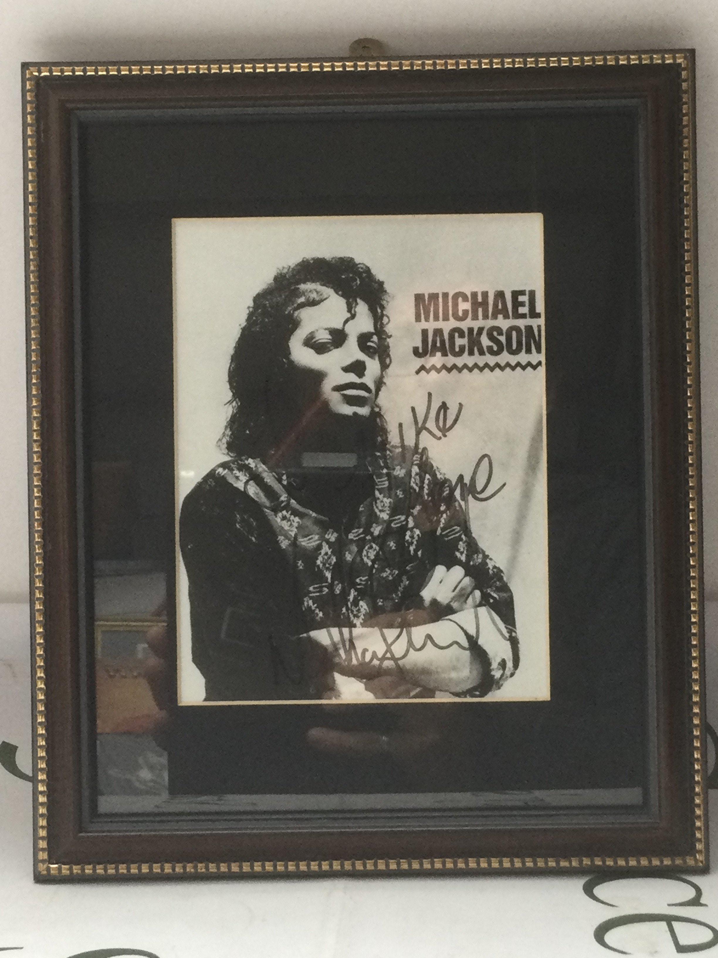 A framed and glazed signed photo of Michael Jackson. No COA.