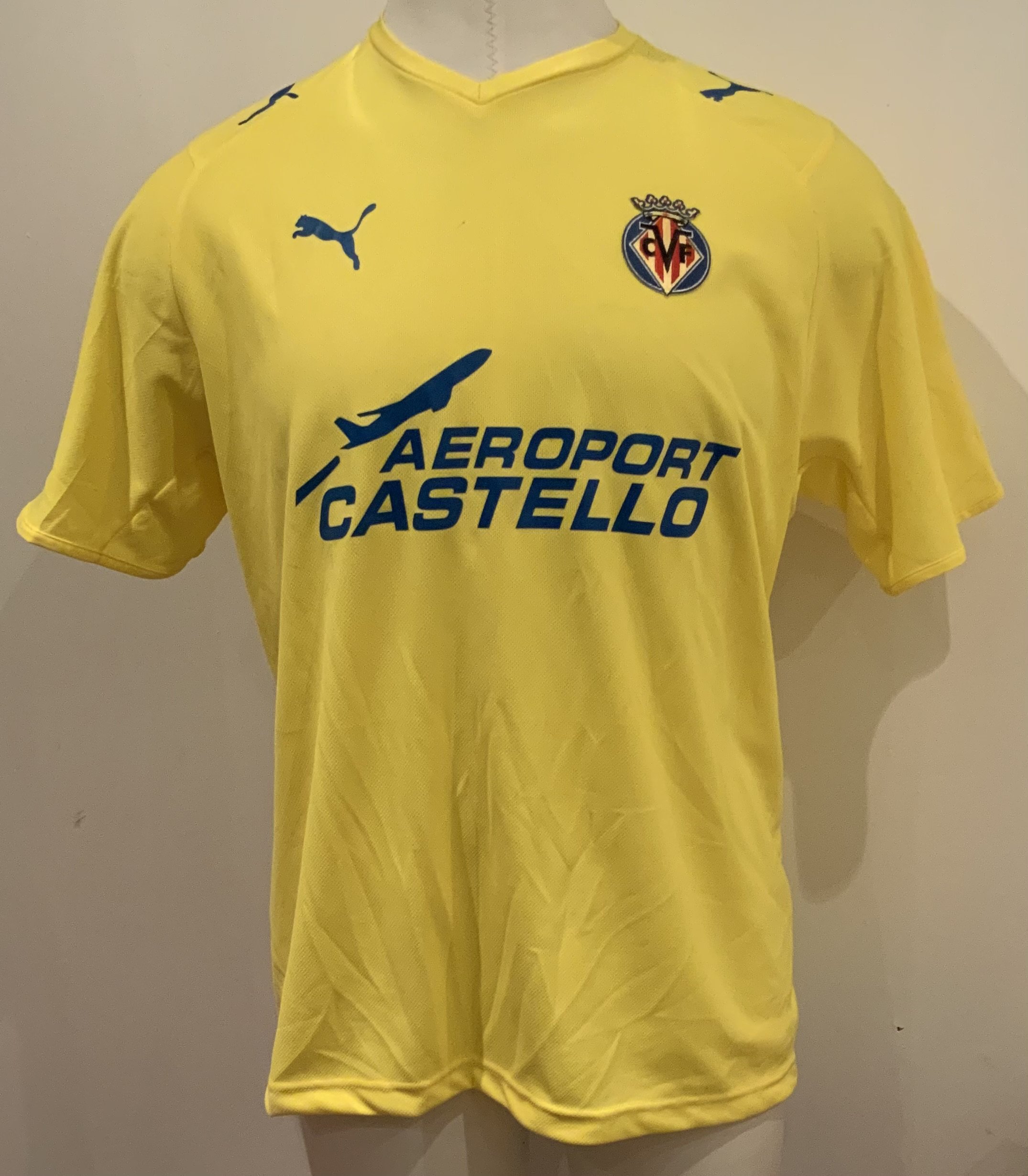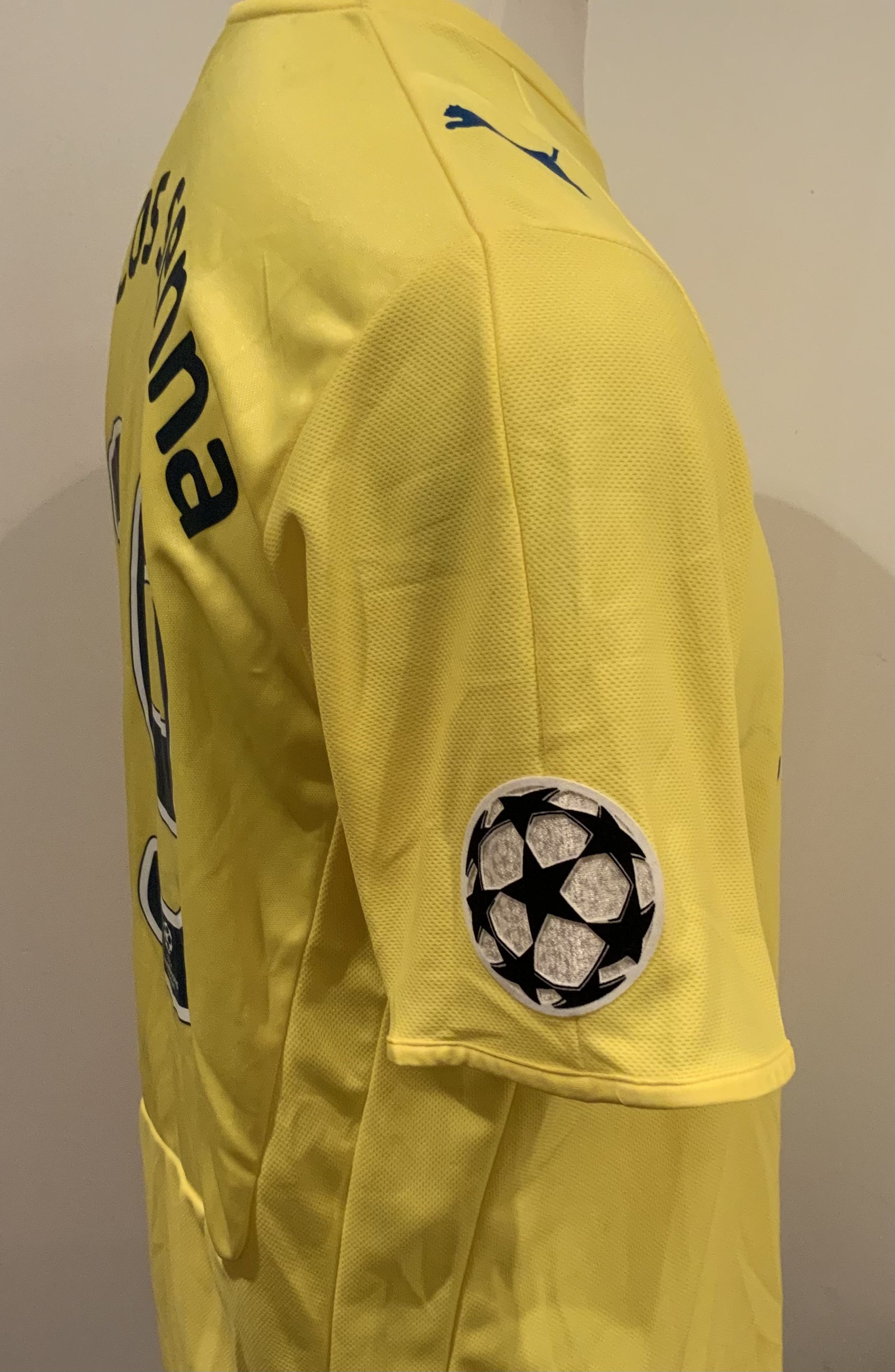 Villarreal Match Worn Football Shirt: Yellow short sleeve number 19 Puma shirt worn by Marcos Senna. Good condition with Champions League badge to right sleeve and Champions League detail to numbers.