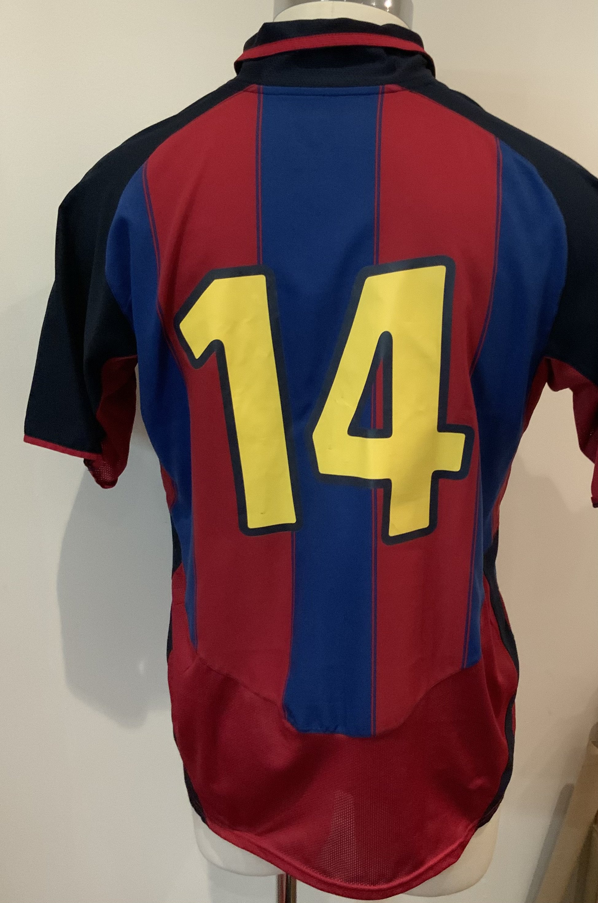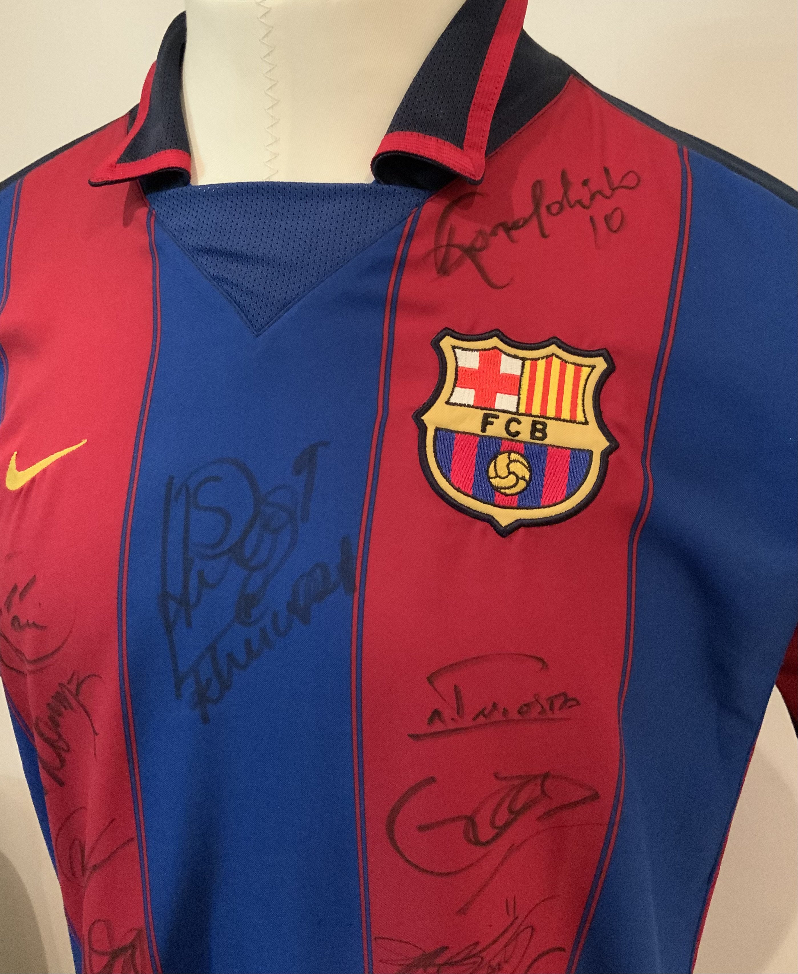 Barcelona Multi Signed Match Worn Football Shirt: Nike number 14 shirt signed by 12 worn by Gerard Lopez, in the Opening Match at the City of Manchester Stadium, 10th August 2003, between Manchester City and FC Barcelona. The shirt has been signed by twelve members of the Barcelona team, most notably Ronaldinho. The shirt was obtained by Clive Wilkes, Former Premier League Referee, who was Fourth Official in this fixture. Gerard Lopez made six appearances for the Spanish national team.
