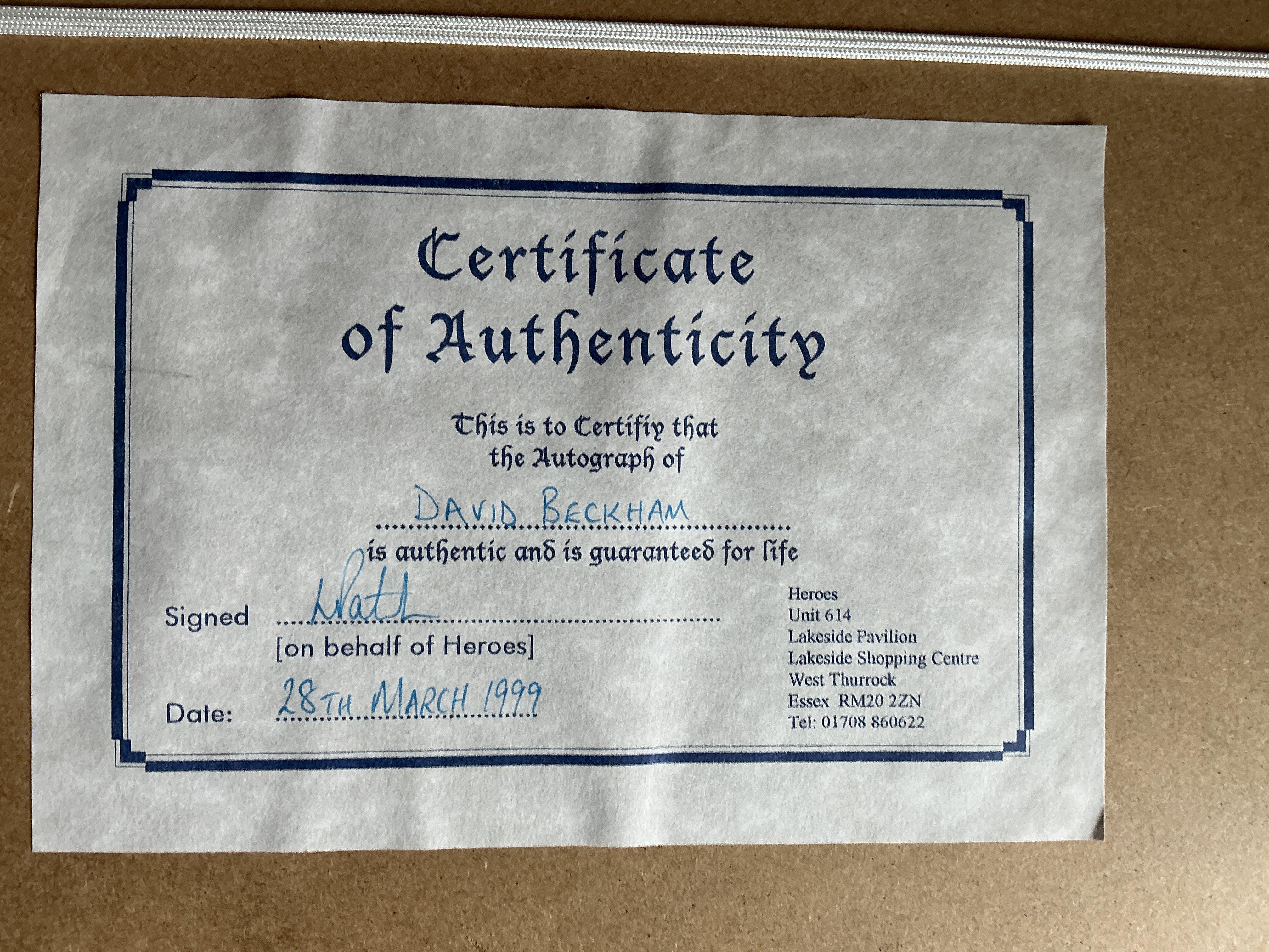 David Beckham Signed Framed Manchester United Photo: Treble season photos nicely framed with clear undedicated signature. COA to rear. Measures 21 x 17 inches.