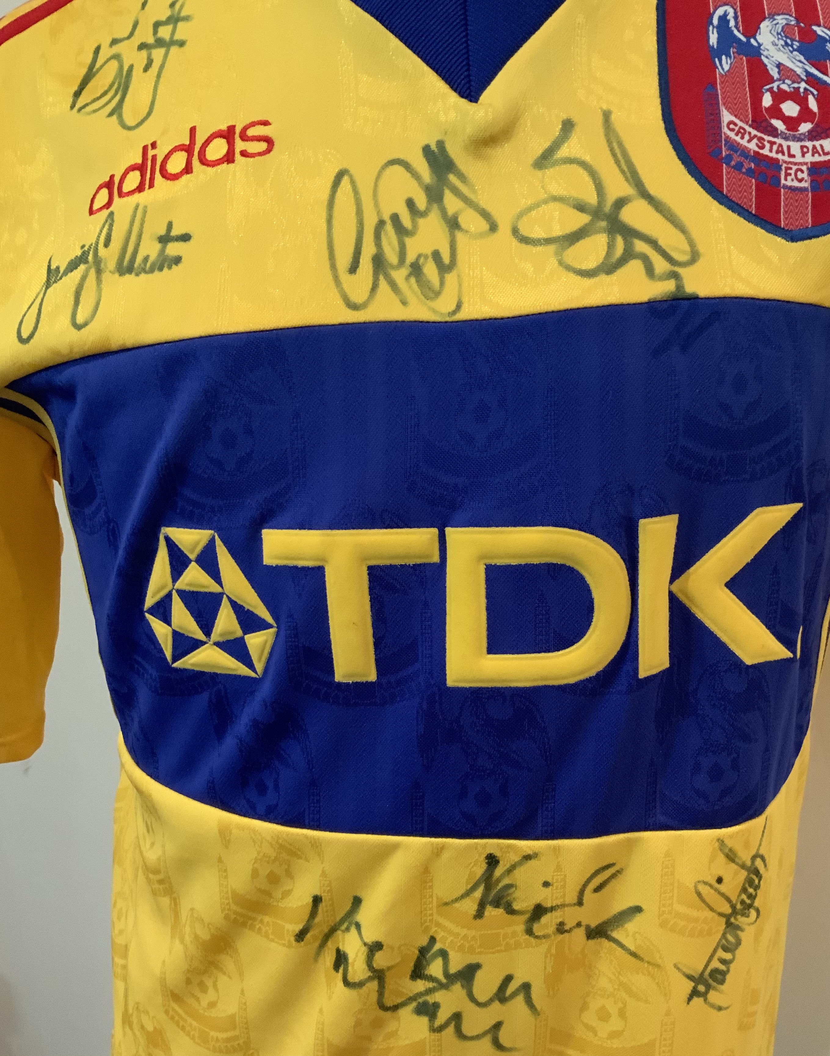Crystal Palace Signed Football Shirt: Crystal Palace 96/97 season multi signed replica away shirt with 9 signatures. Includes Ray Houghton, Neil Shipperly, Gareth Davies plus others. Good condition.