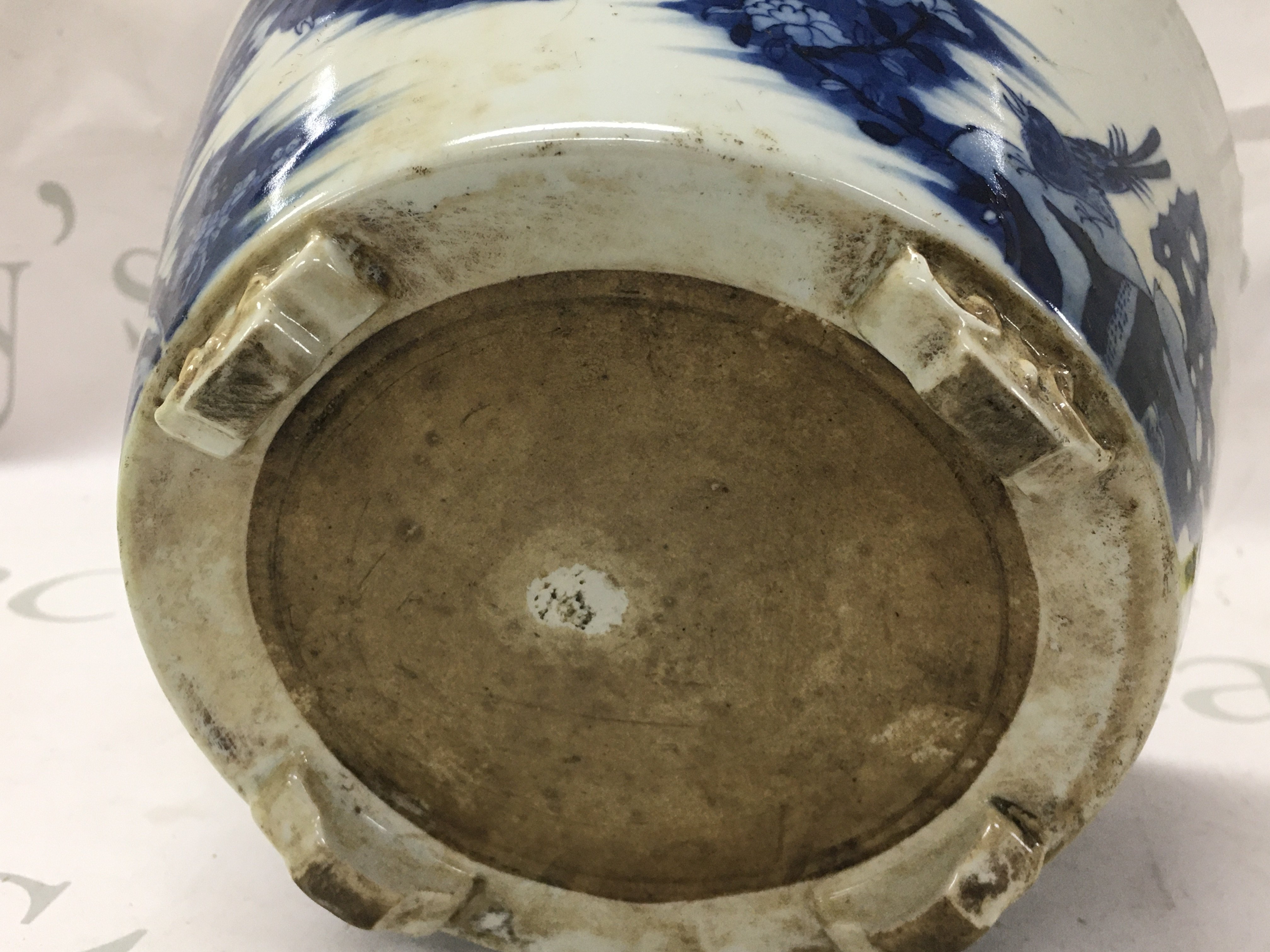 A Chinese blue and white planter bowl decorated with birds perched on cherry blossom trees. 11.5cm tall 21cm wide Approx . This lot cannot be posted
