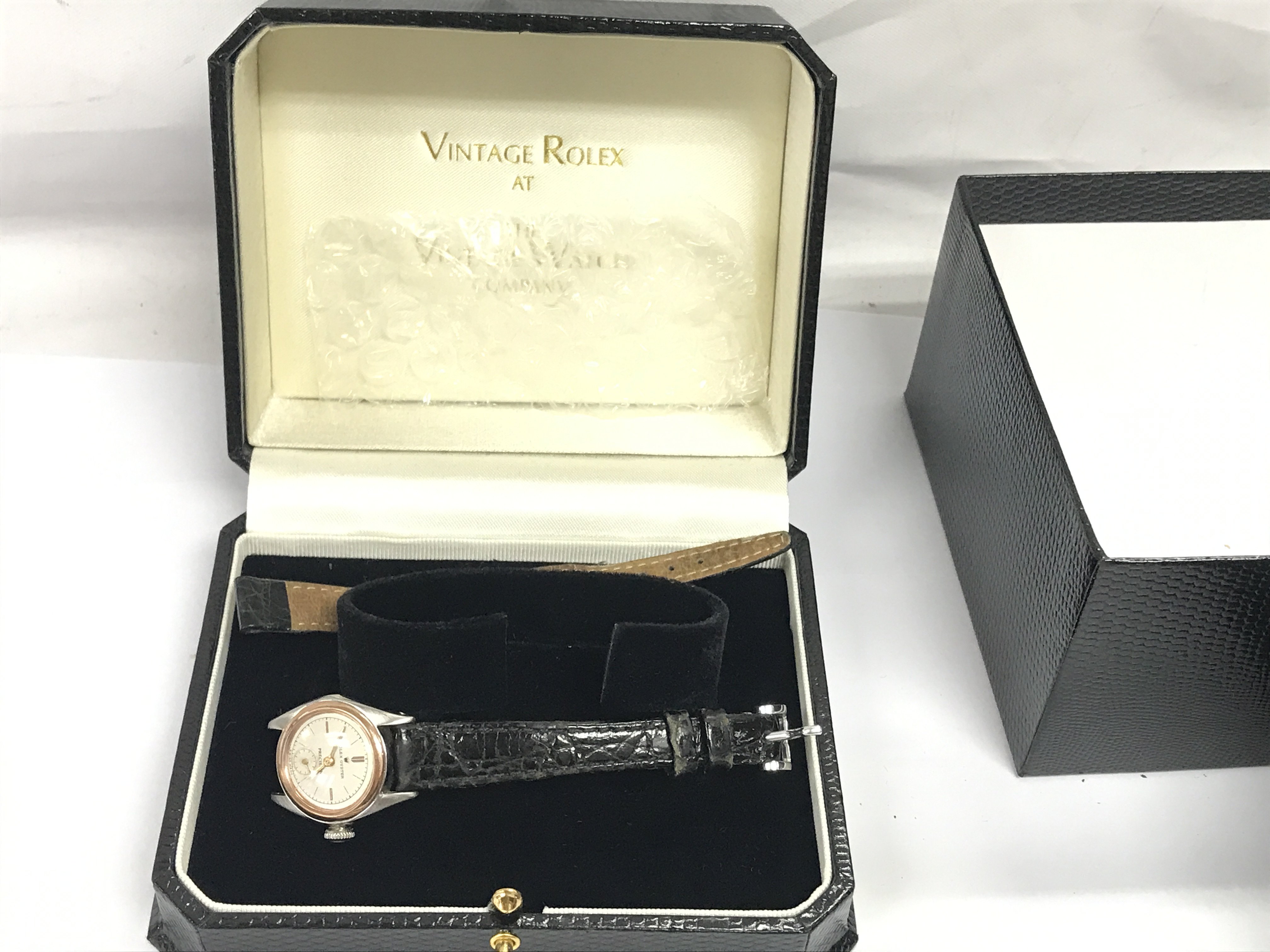 A vintage Rolex ladies Oyster Precision watch. Approximately 24mm case. Black leather strap. Comes with aftermarket box. Not seen running.