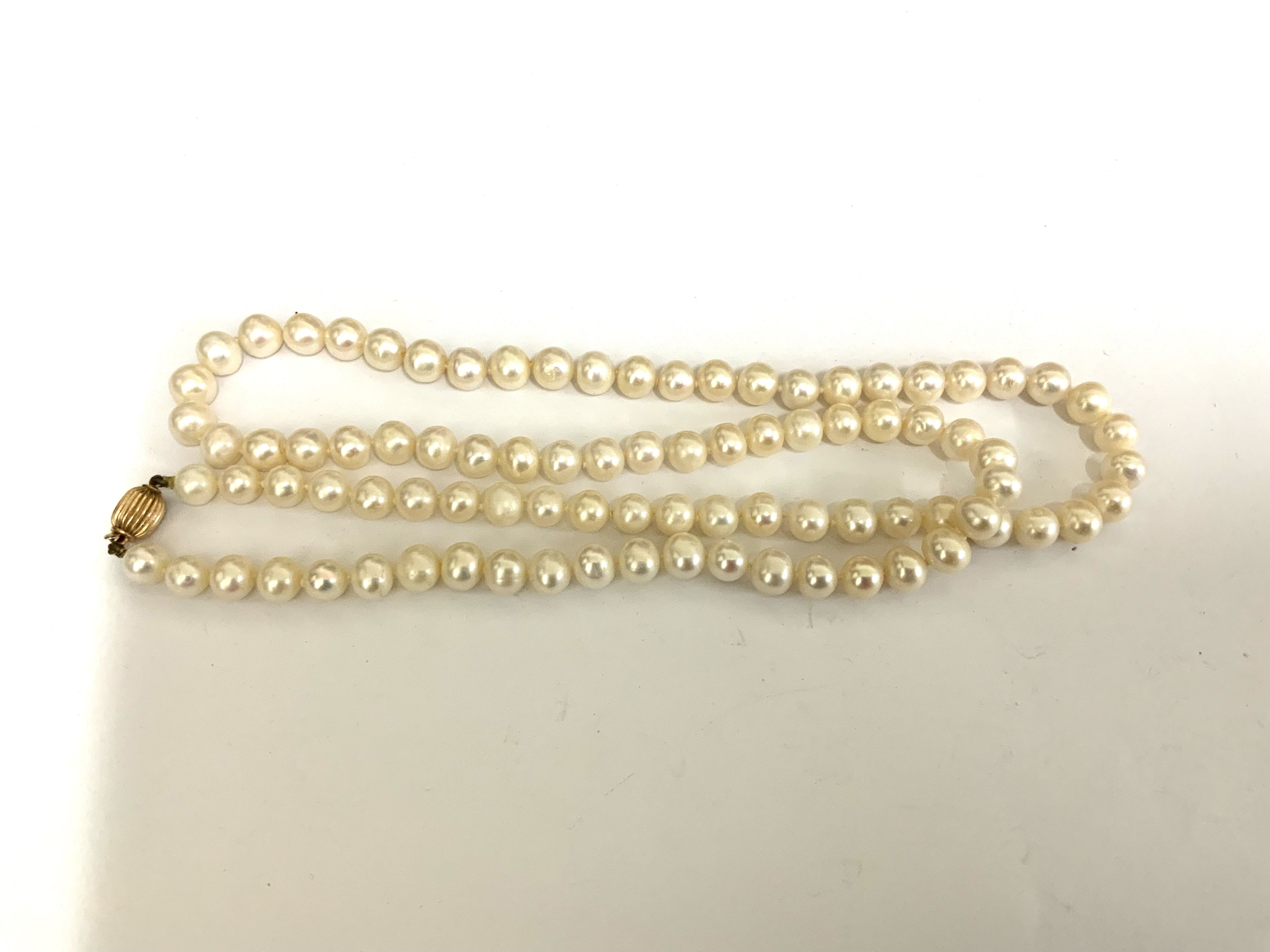 A pearl necklace with a 9ct gold fluted clip clasp. 32cm