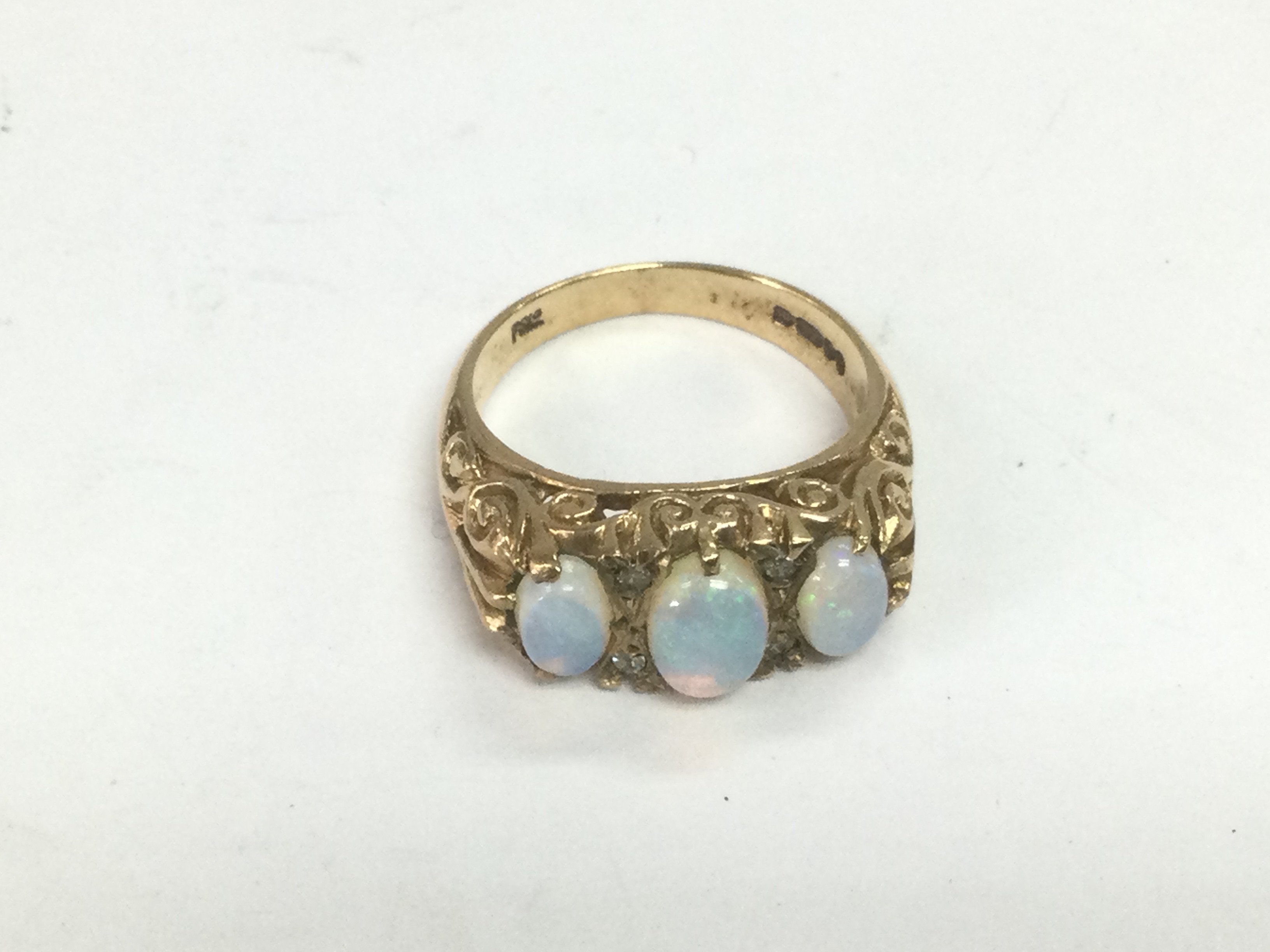 A 9ct gold three stone opal ring, approx 5.2g and approx size M-N. Shipping category A.