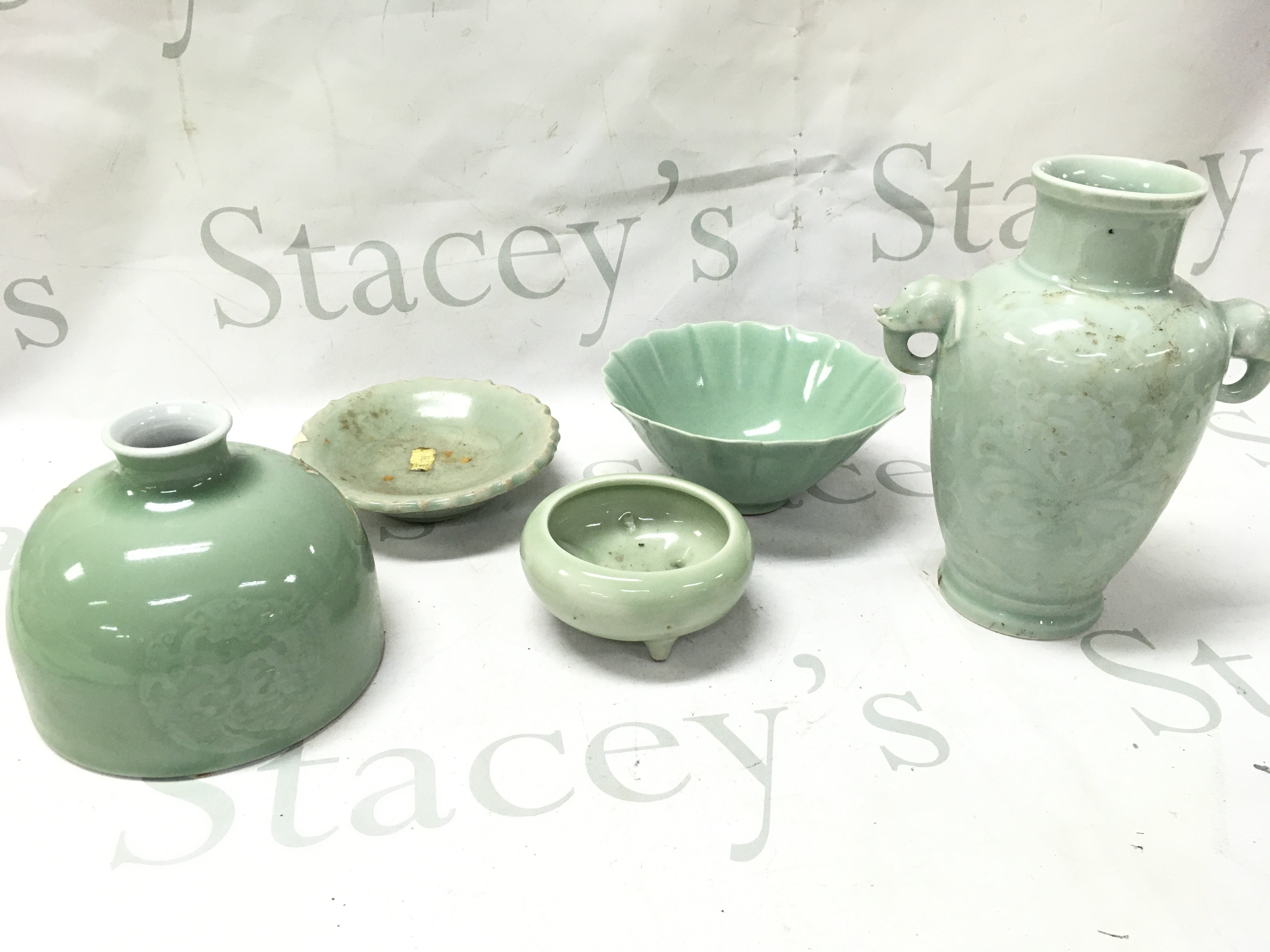 Chinese Celadon glazed ceramics including a water vase with six character mark at the base, dishes/ bowls and a elephant head handled vase (18.5cm tall ). This lot cannot be posted