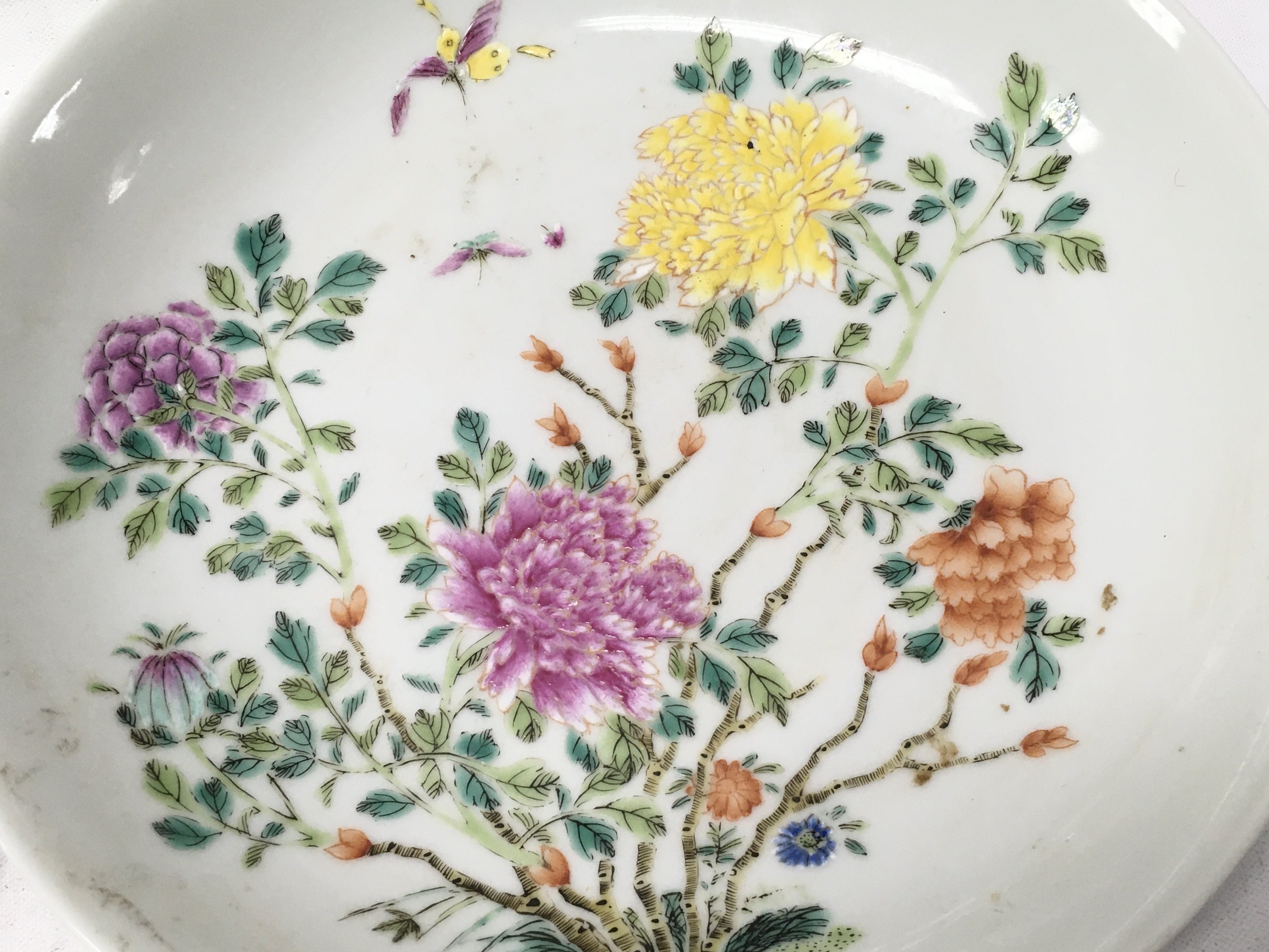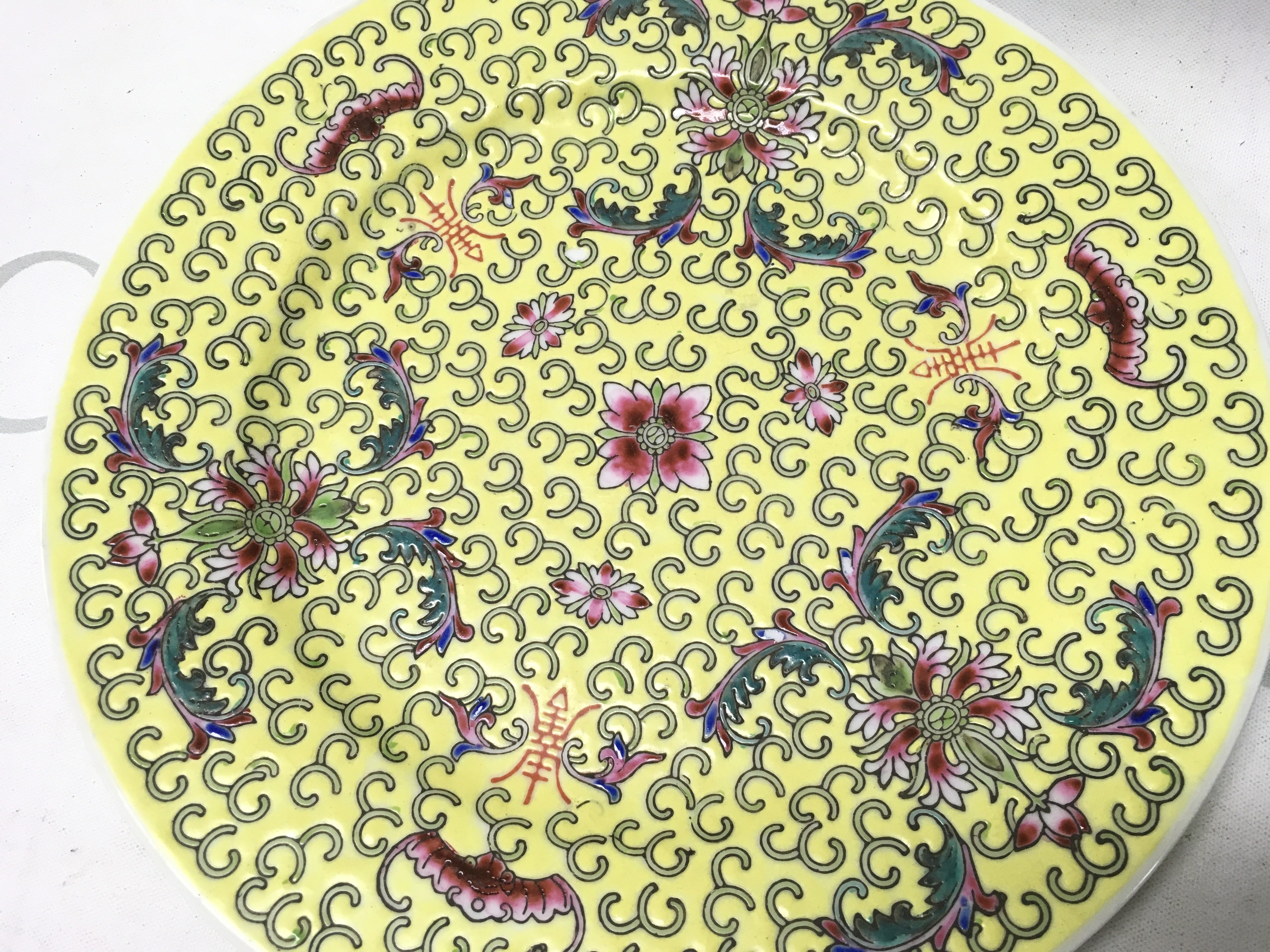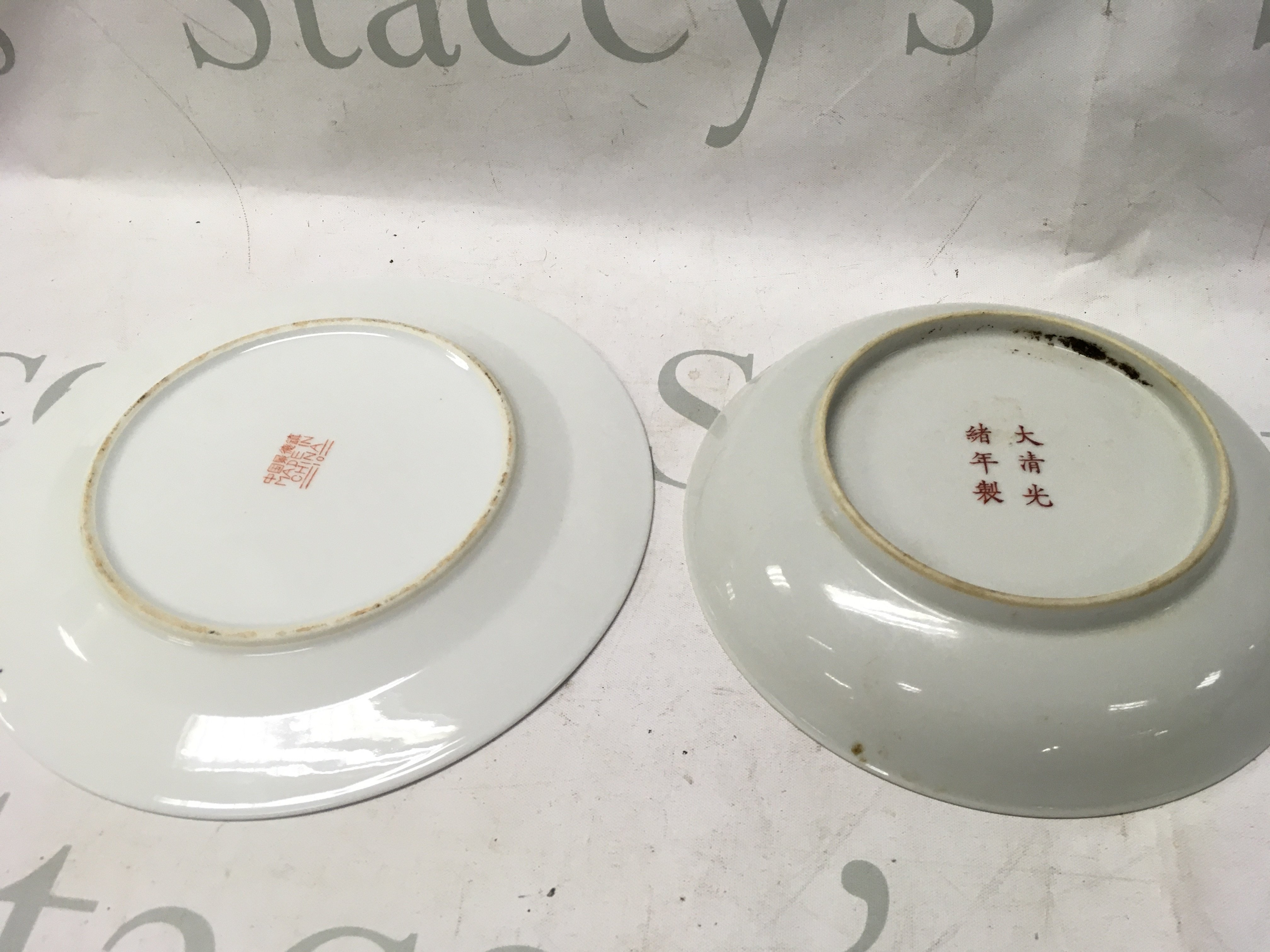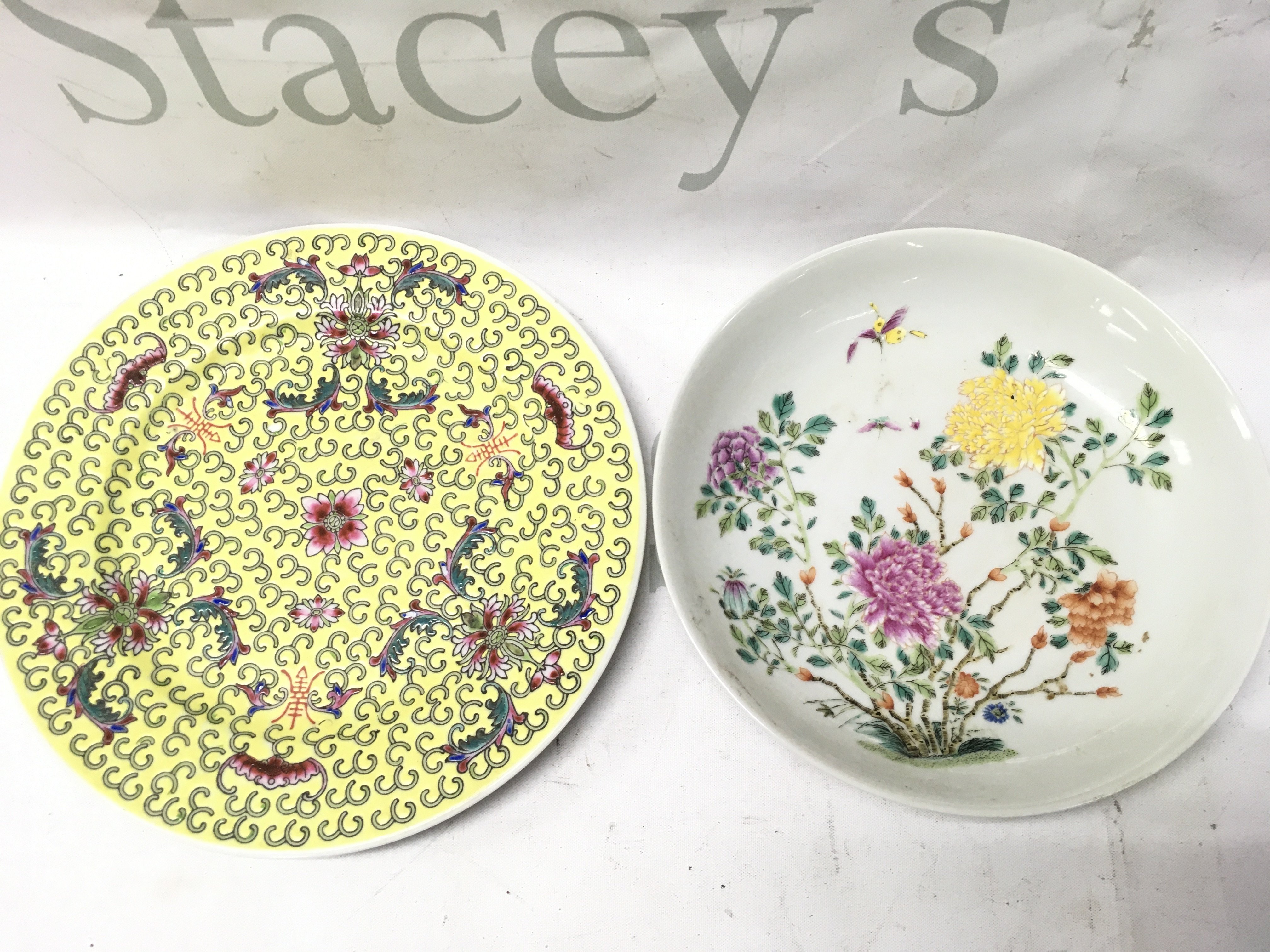 Two Chinese Famille rose dishes one with red glaze six character mark and one yellow. 21 & 18cm wide approximately. This lot cannot be posted