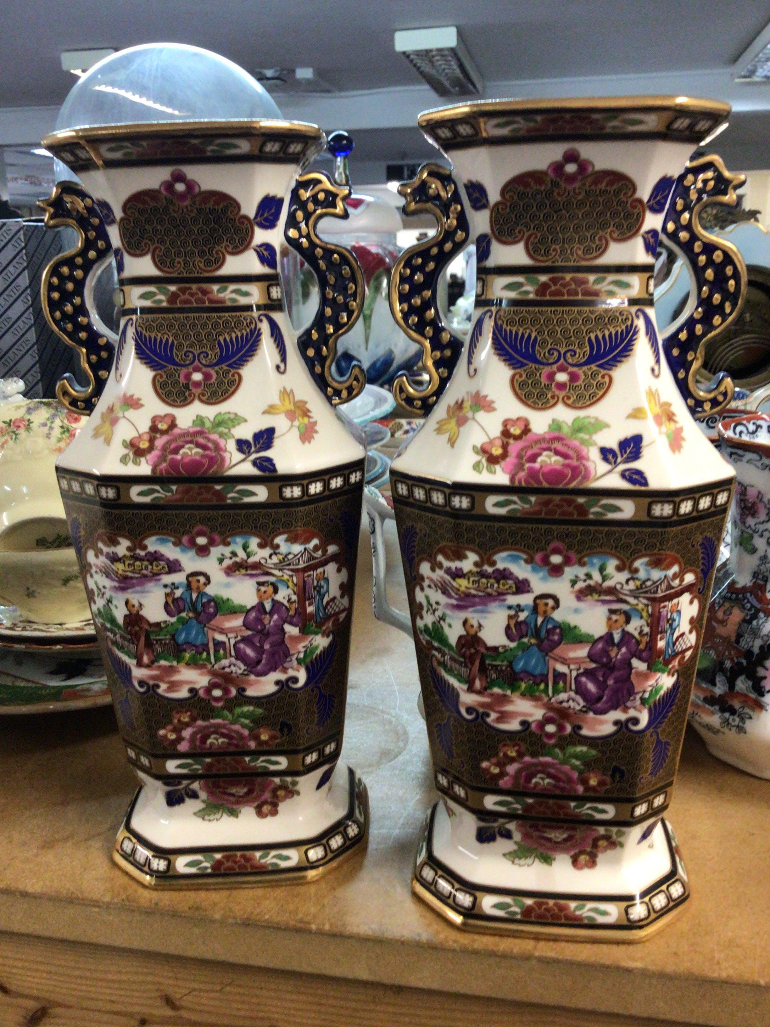 A pair of Chinese style limited edition 20th century Mandarin Vases and a quantity of Masons and other Victorian Ironstone china vases and jugs. NO RESERVE