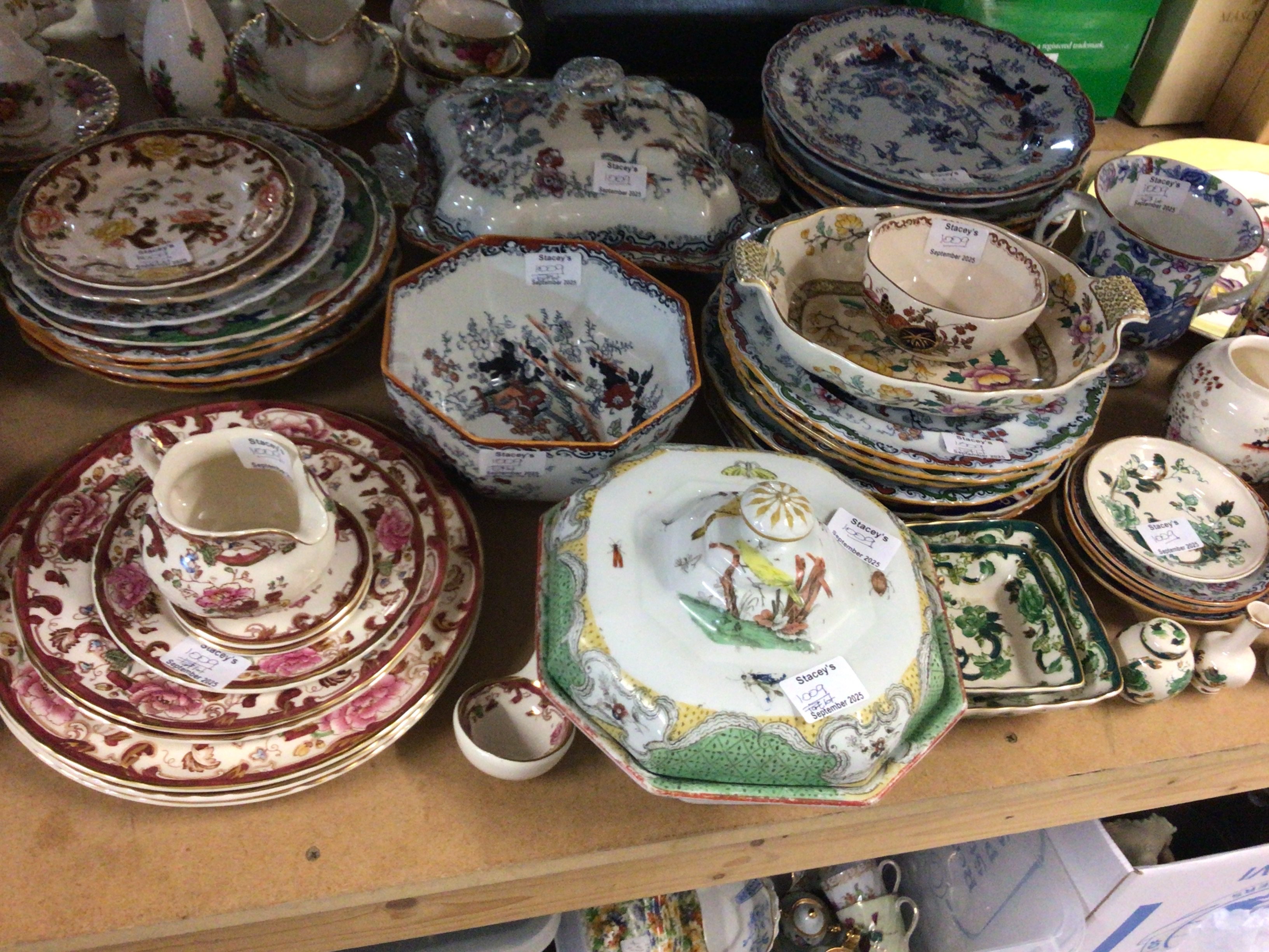 A collection of Victorian and later Ironstone china comprising a large selection of plates jugs shaped dishes a two handled cup tureens etc. NO RESERVE
