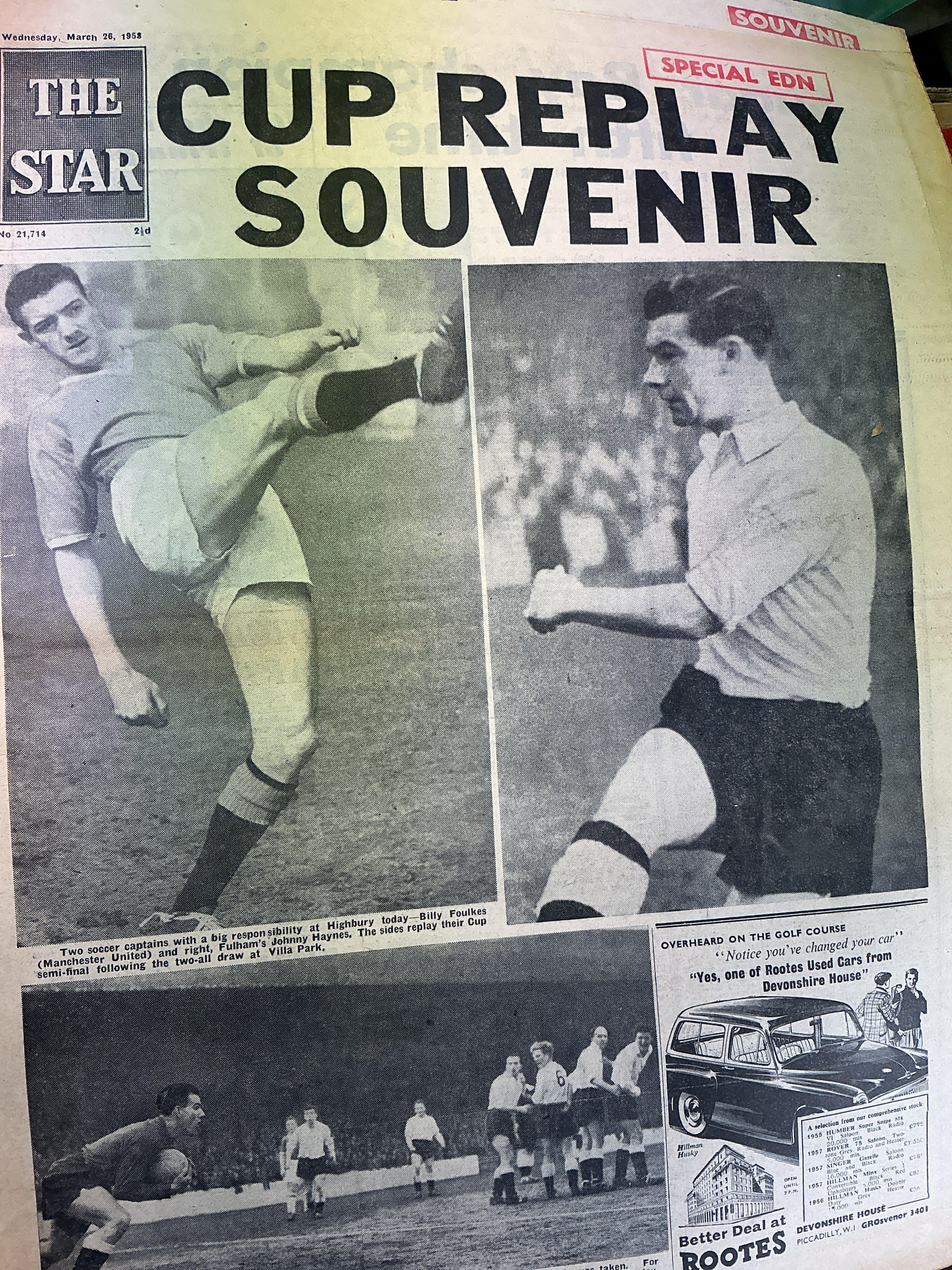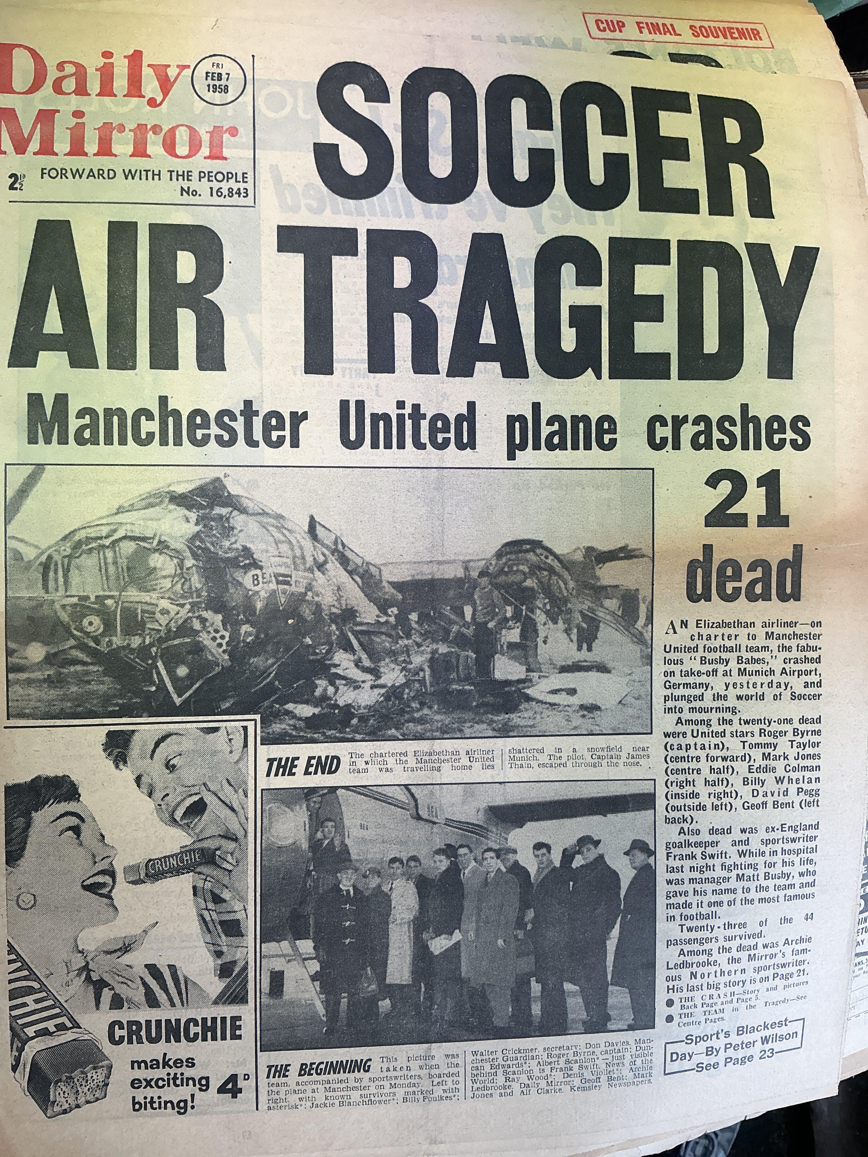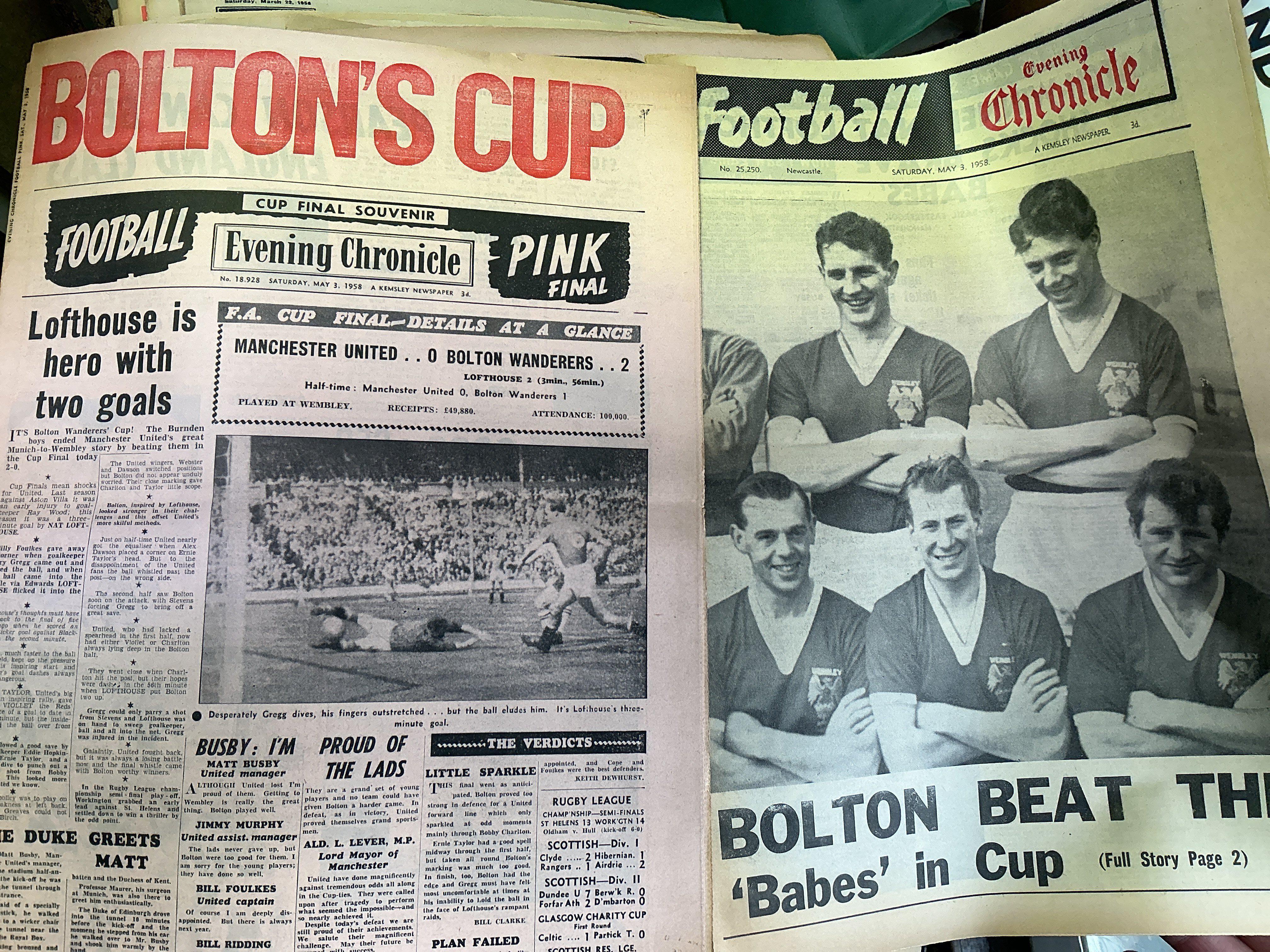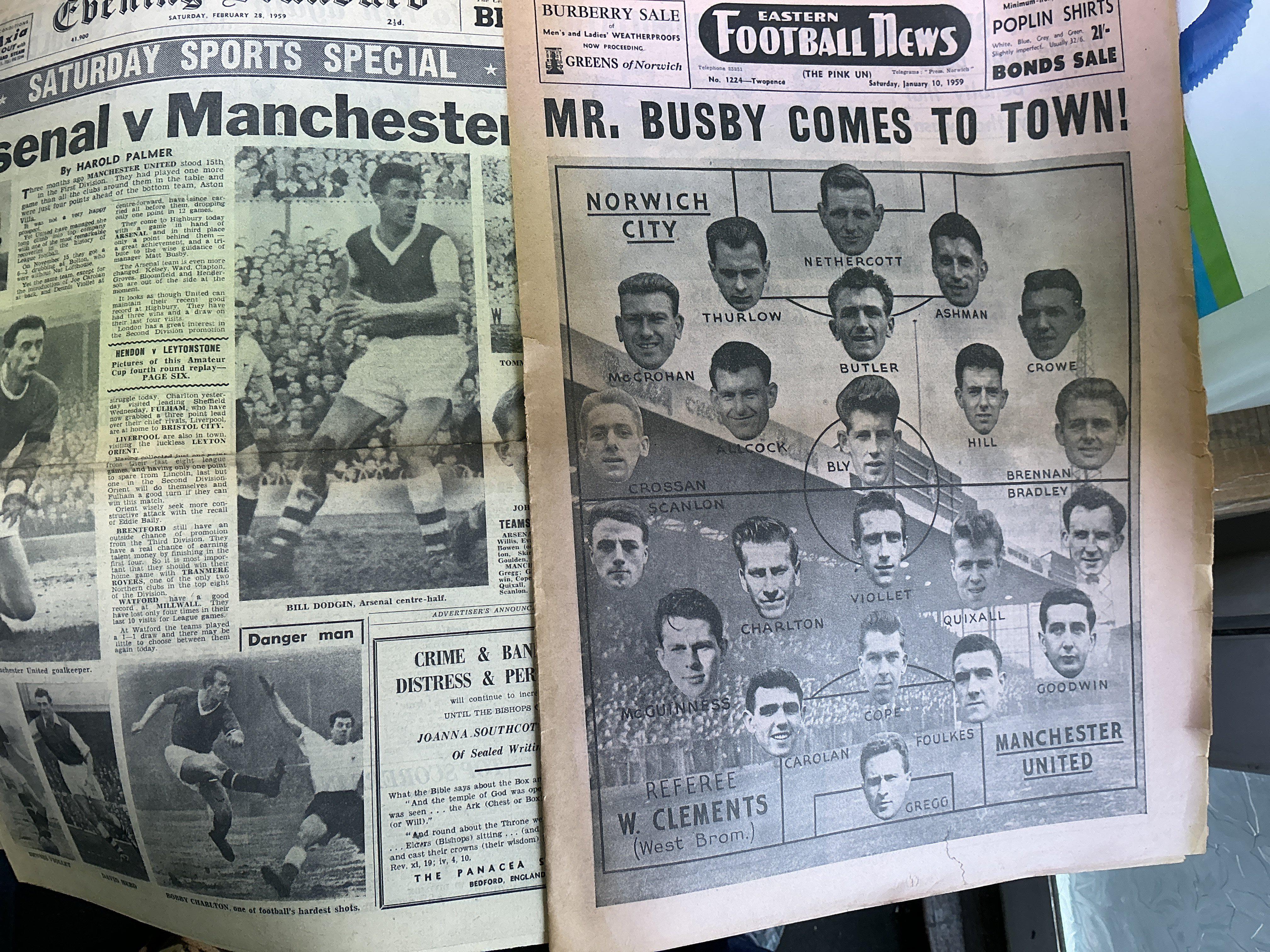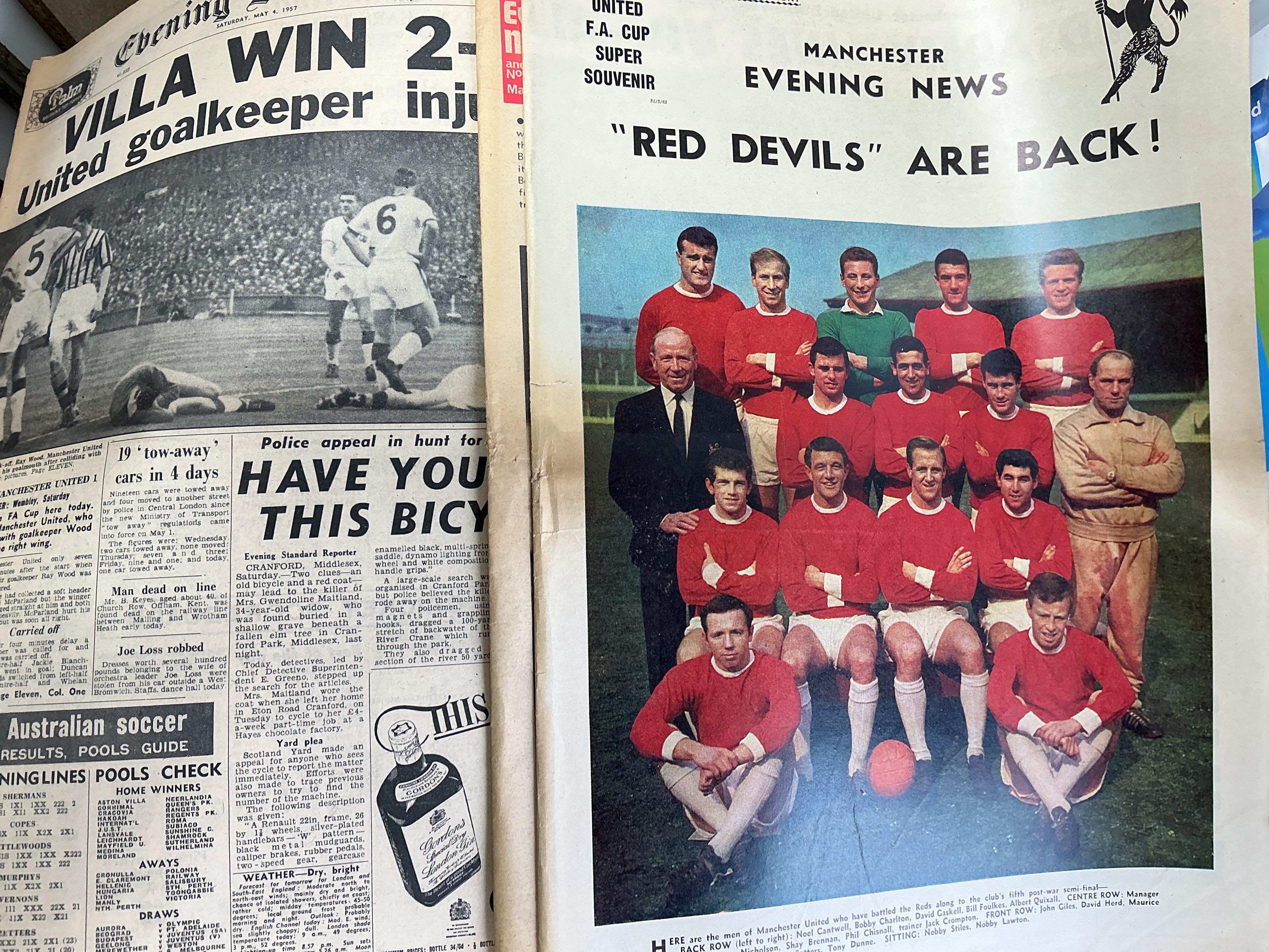 Manchester United Late 1950s Football Newspapers: Mainly full newspapers to include 1st Feb 1858 which is a build up to the match at Arsenal which ended 4-5 but was more known to be the last match of the Busby Babes in the UK. 1958 FA Cup final and semi final + replay, Munich disaster, 1957 FA Cup final, 1968 European Cup Final and more. 15 full newspapers plus many cuttings.