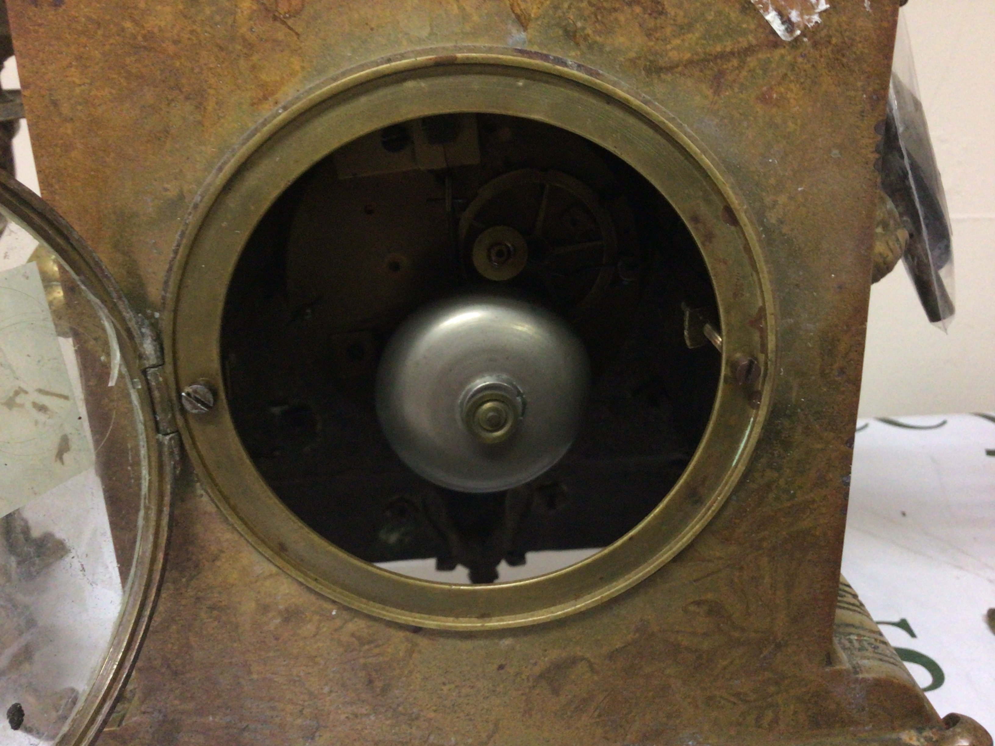A brass cased late 19th century French clock the case surmounted with loin masks and ring ornamentation and surmounted with a classic urn. With side ornaments key and pendulum. Height 42cm