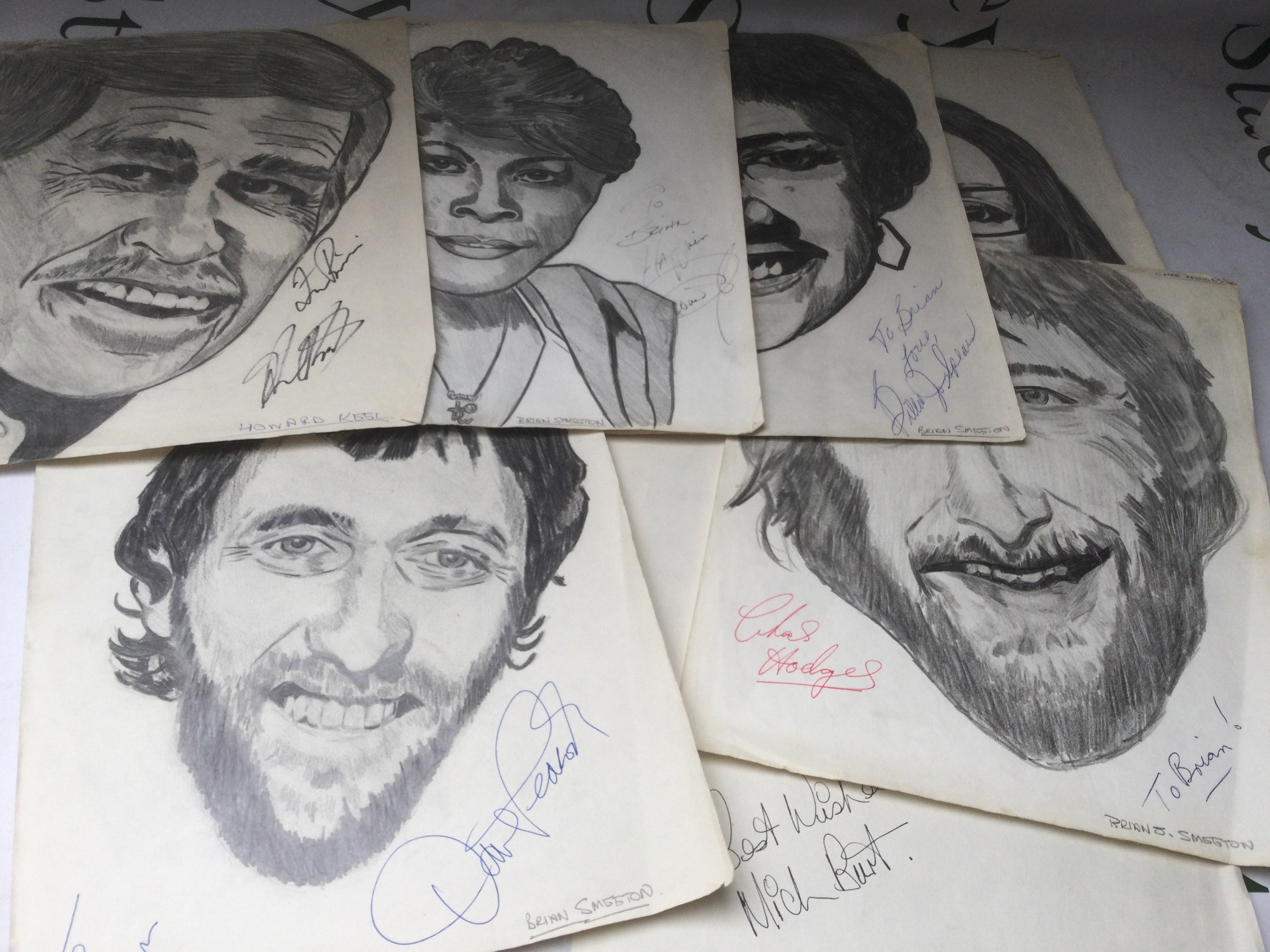 A collection of autographs by various actors and musicians including Charles Bronson, Honor Blackman, Chas n Dave and others.