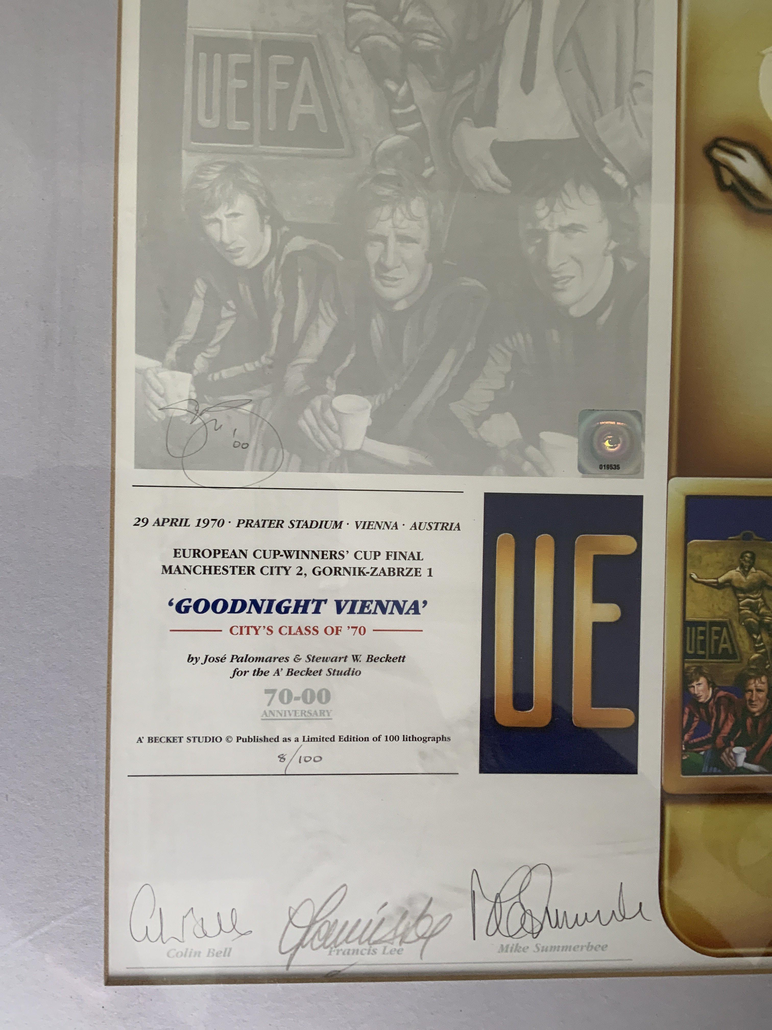 Manchester City 1970 ECWC Final Signed Football Print: Stunning limited edition print number 8/100 aptly named Goodnight Vienna with reference to Citys 1970 win in Austria over Gornik Zagreb. Print comes from reputable Becket Studio and is signed in pencil by Lee Summerbee and Bell. Tastefully framed in matching gold measuring 27 x 24 inches.