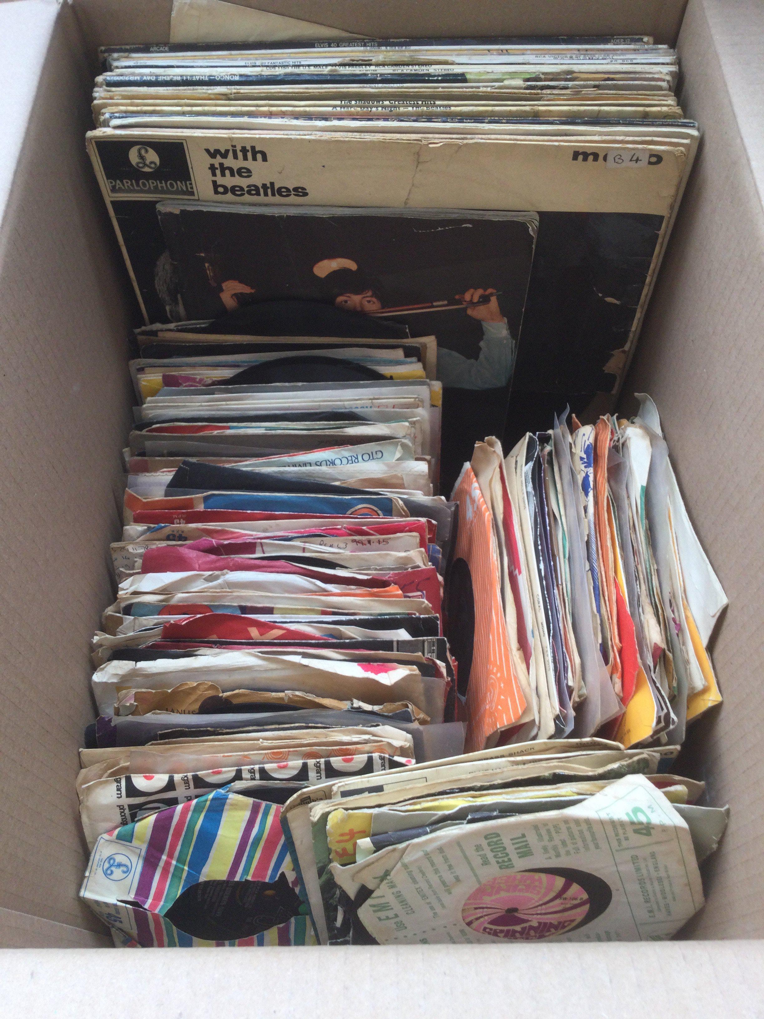 A box of LPs, EPs and 7" singles by various artists including The Beatles, Elvis Presley and others plus a 1965 Beatles book.