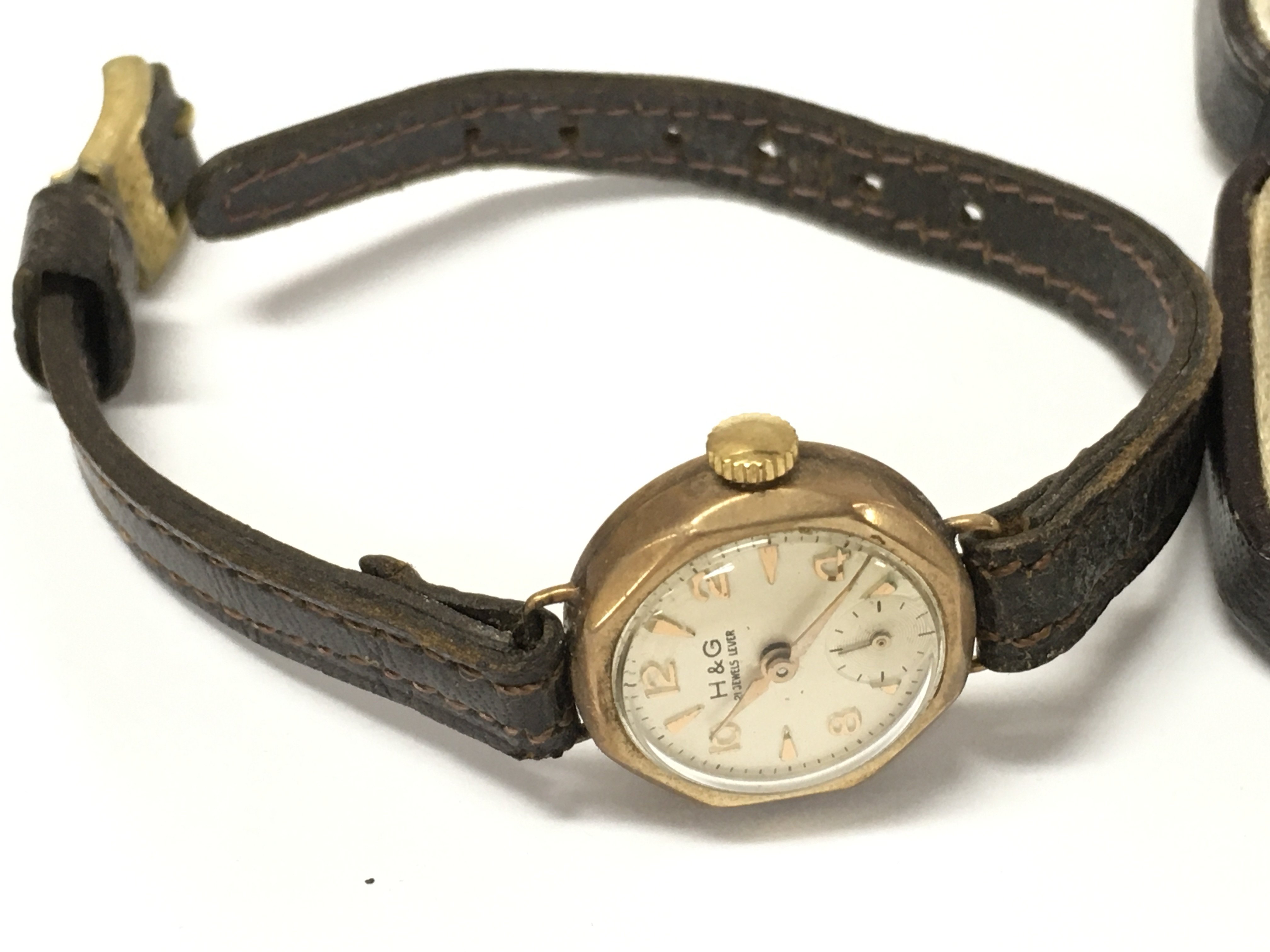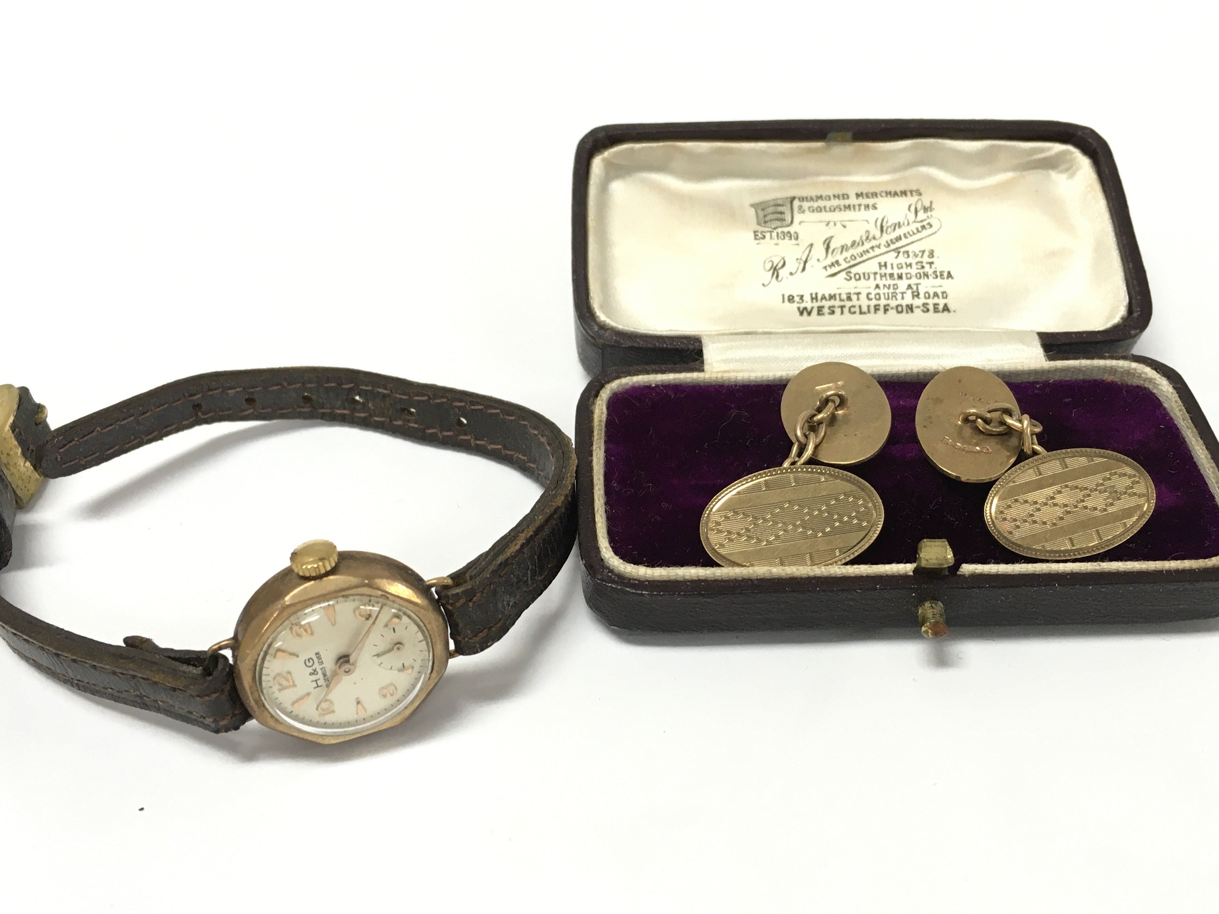 A pair of 9ct gold cufflinks (total weight 6.9g) and a gold cased H&G watch (11.1g total weight ,seen working) , postage category A