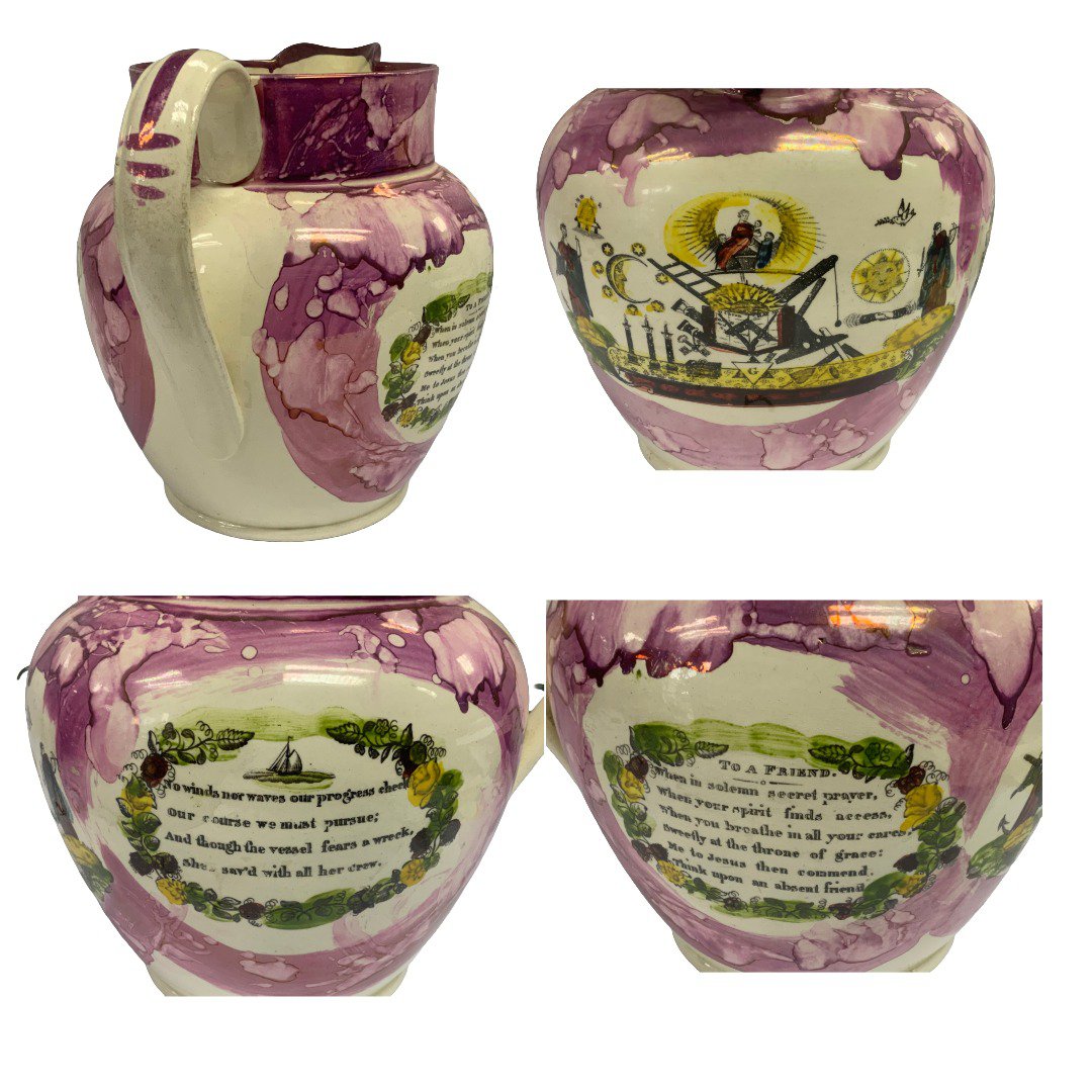 A superb example of a Sunderland Lustre pottery jug with a Masonic transfer to the front of and verses to the sides. 24cm. (Catagory D. Postage not available in house).