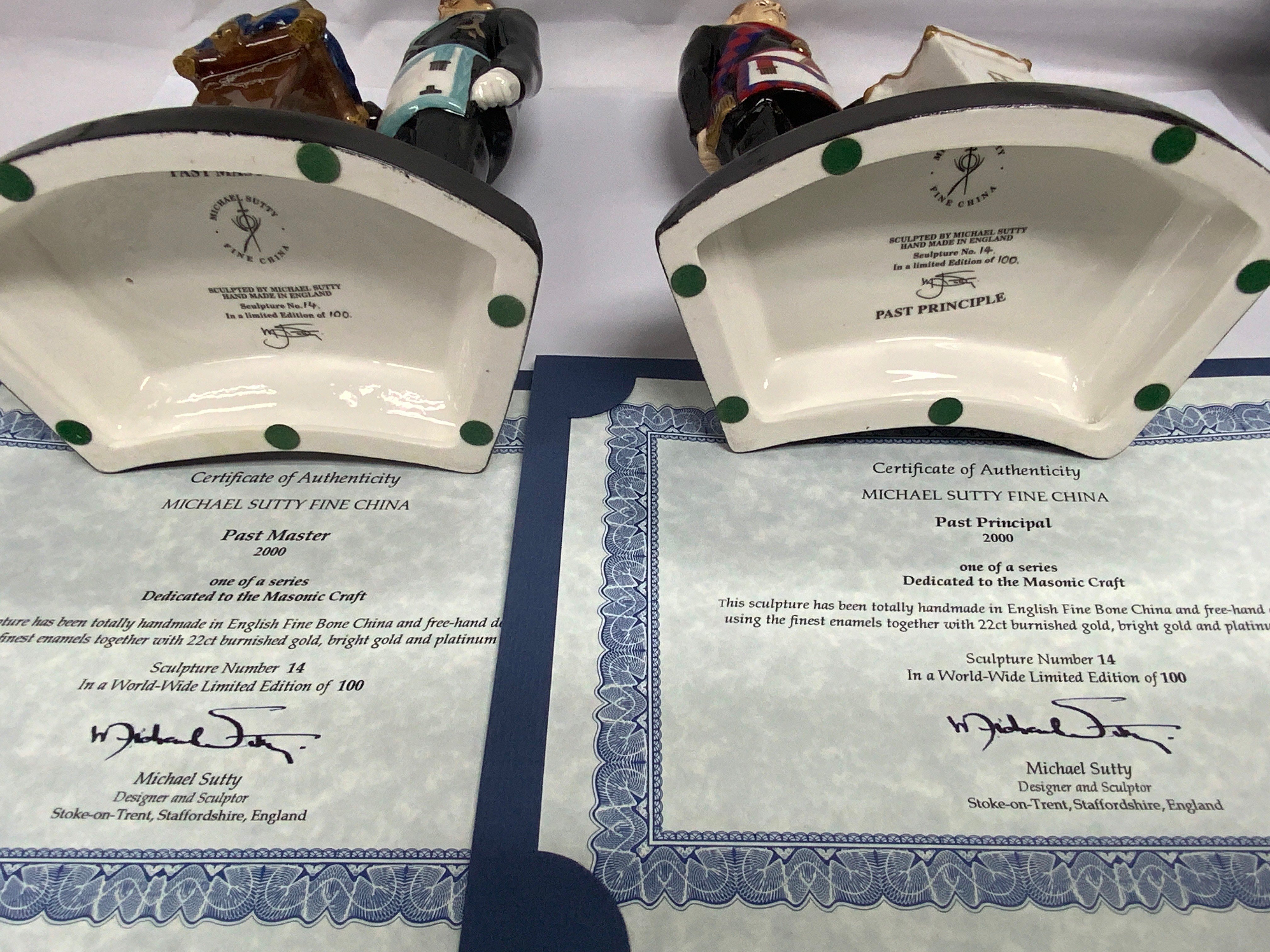 Michael Sutty, 2 limited edition porcelain figures. 14/100 titled Past Principle, Past Master 14/100 both with certificates. (D)