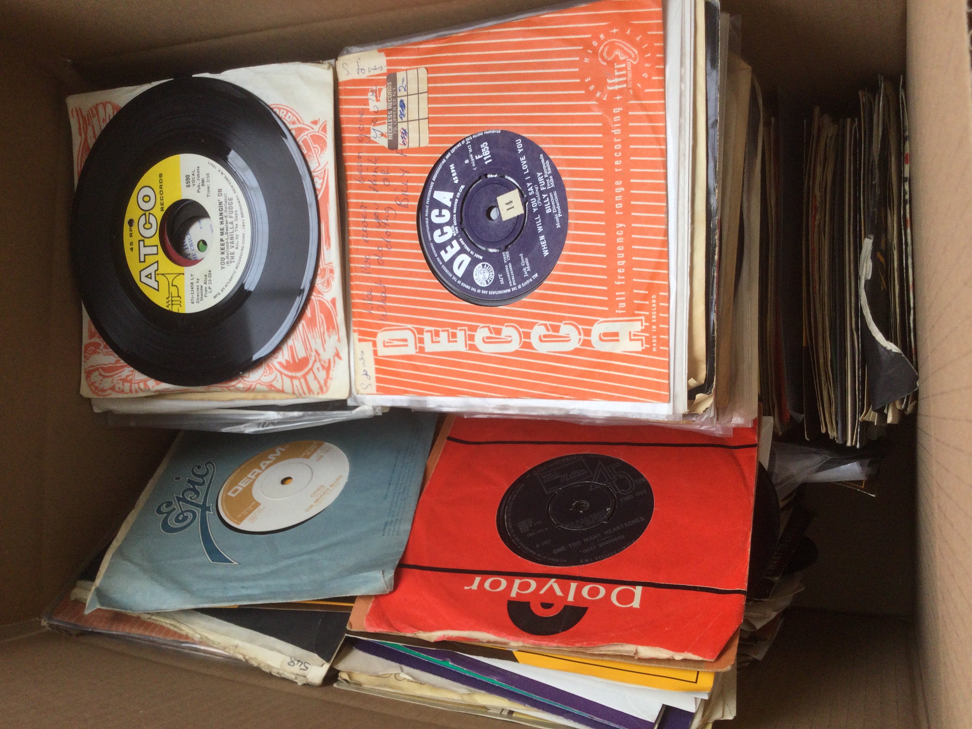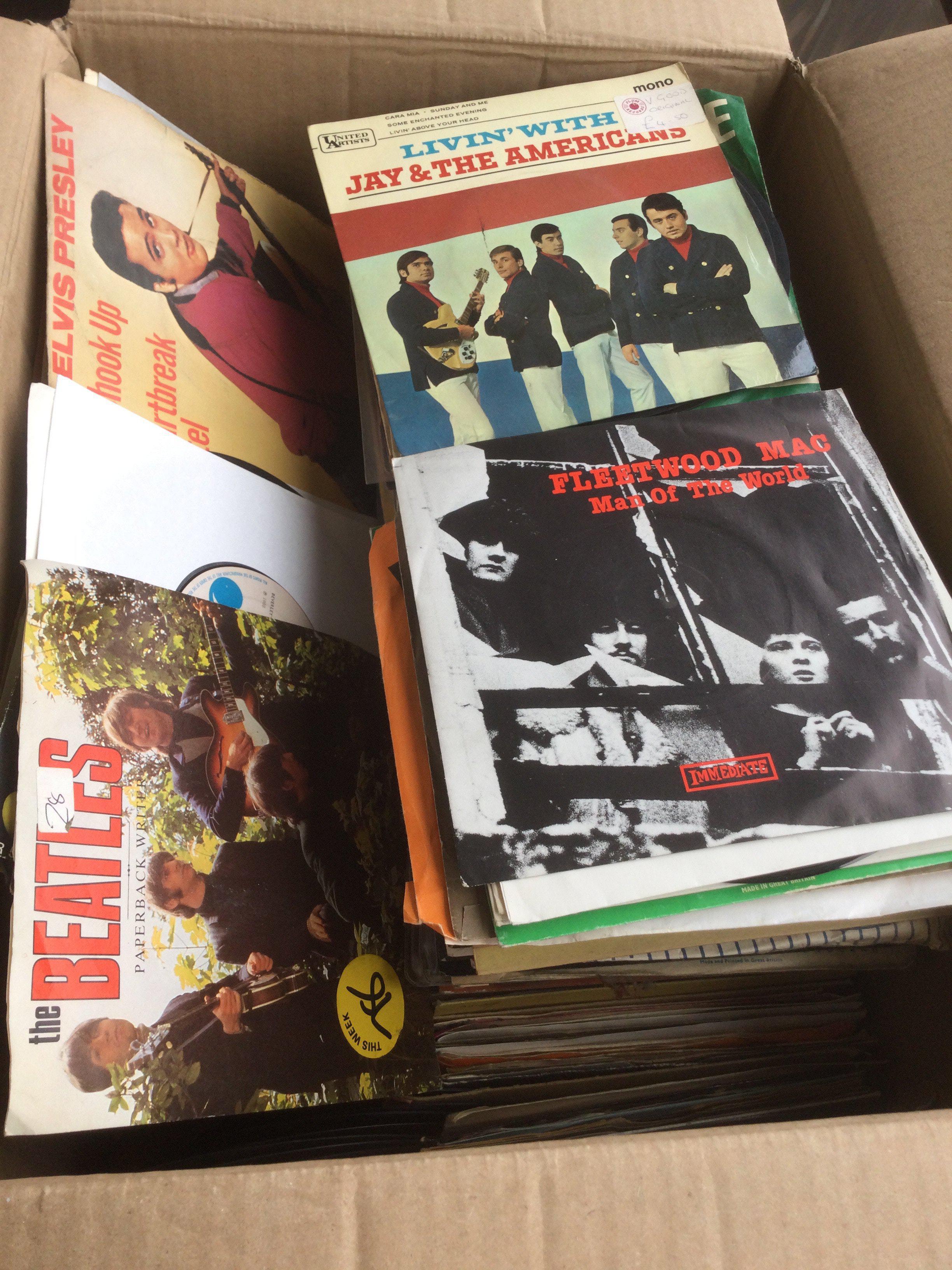 Two boxes containing 7" singles and EPs by various artists including Jimi Hendrix, David Bowie, The Beatles and many more.