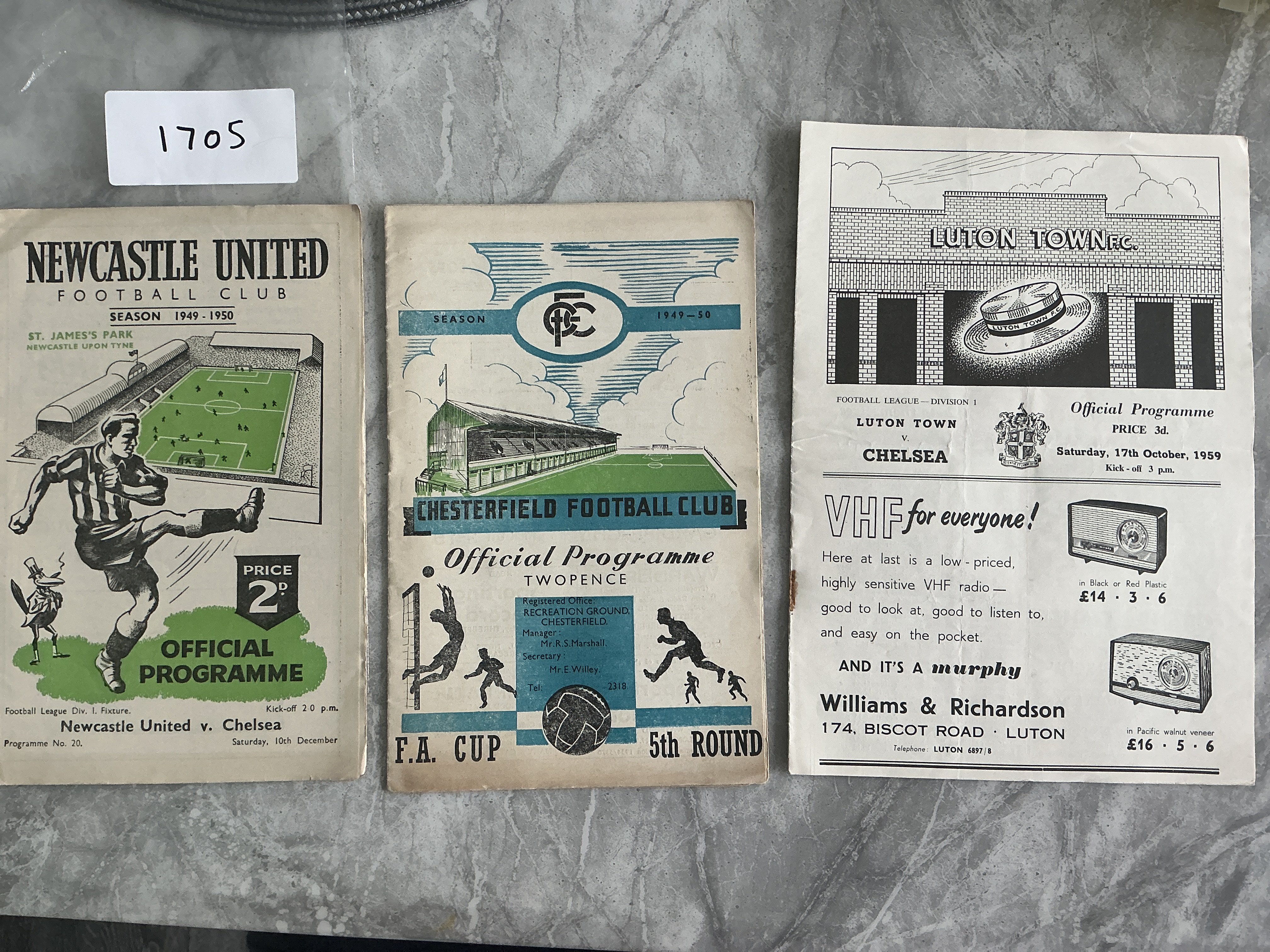 49/50 Chesterfield v Chelsea FA Cup Football Programme: Good condition with no team changes. C/W Chelsea aways at 49/50 Newcastle and 59/60 Luton. Good. (3)
