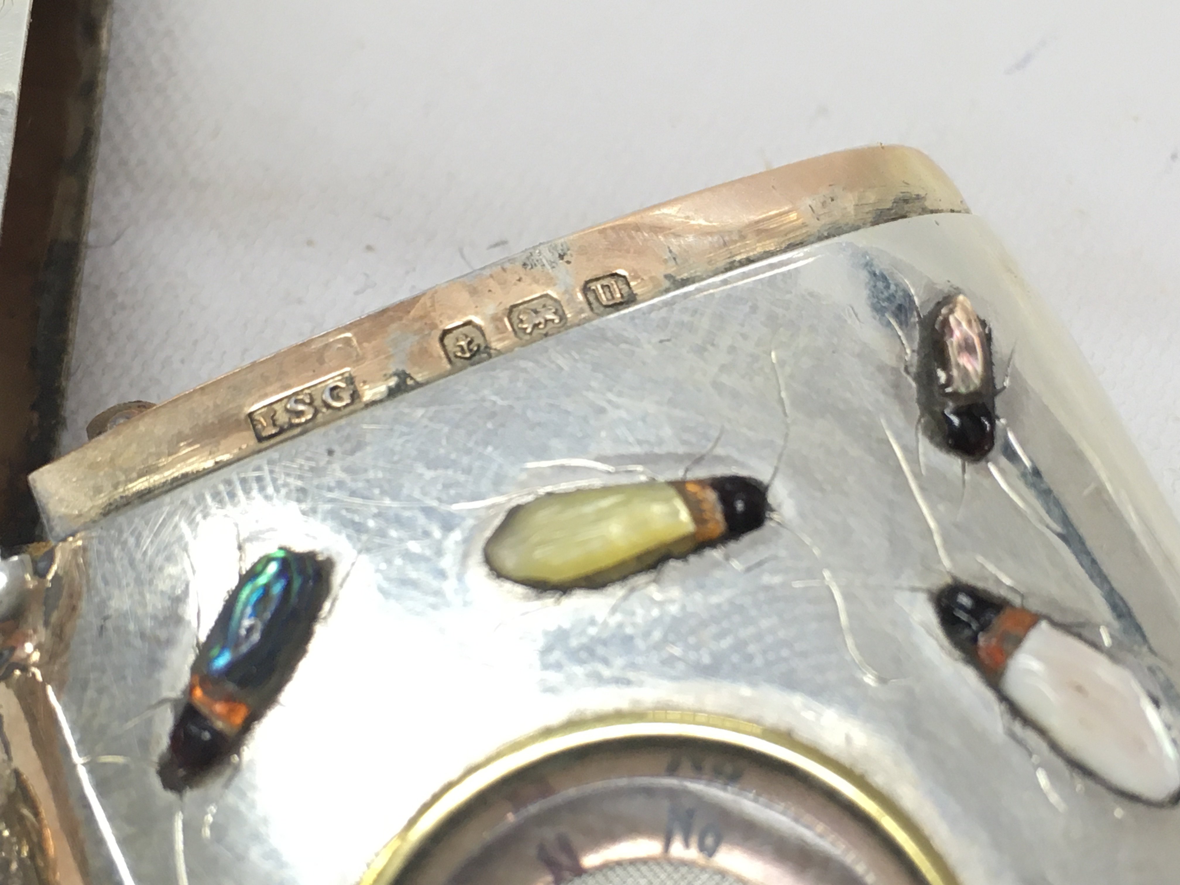 A silver vesta case set with shibyama bugs and compass. postage category A