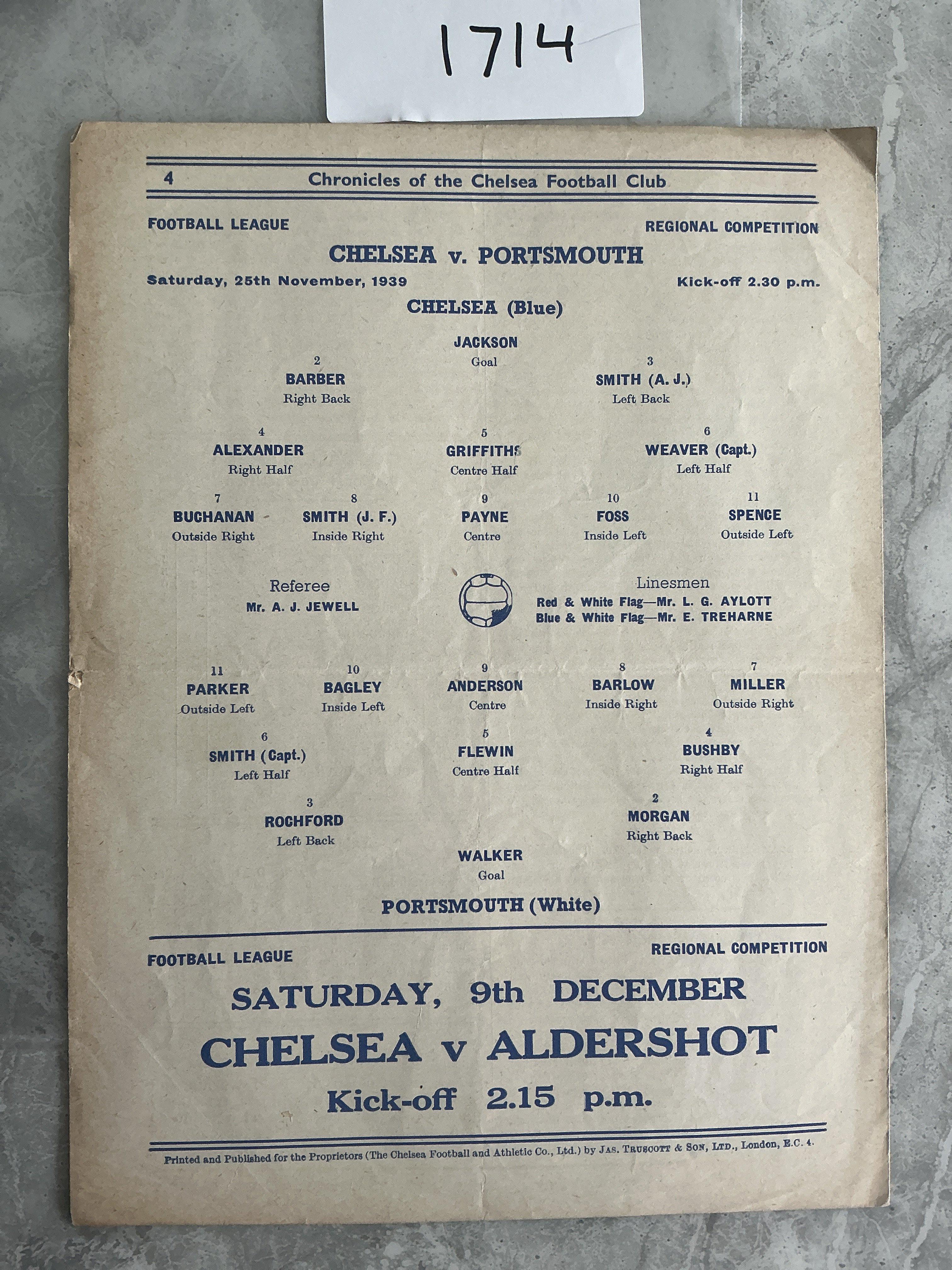 39/40 Chelsea v Portsmouth Football Programme: Very good condition with no team changes dated 25 11 1939.