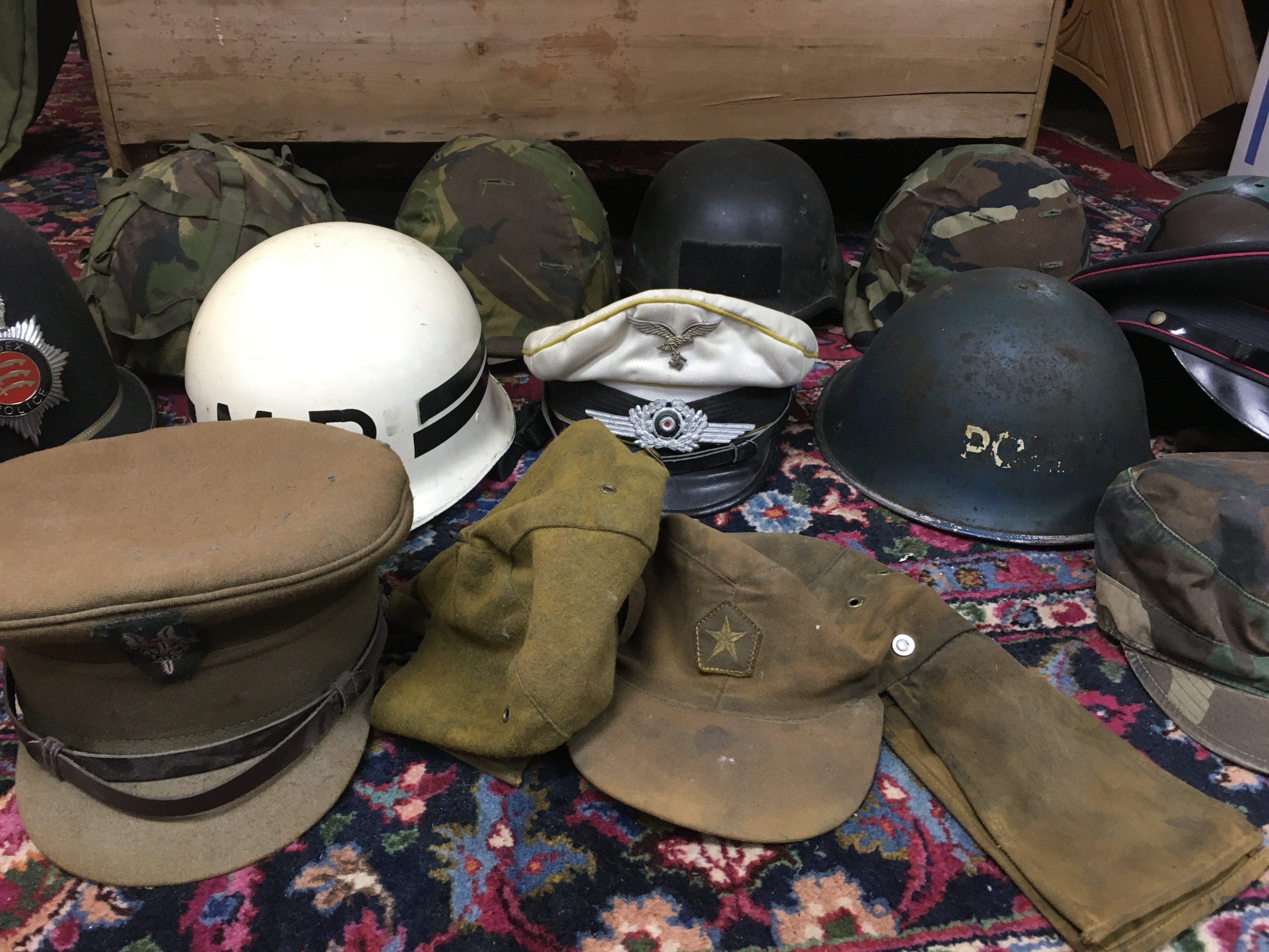 A collection of retrospective military helmets and hats including a Luftwaffe white topped cap, soviet Afghanistan hat