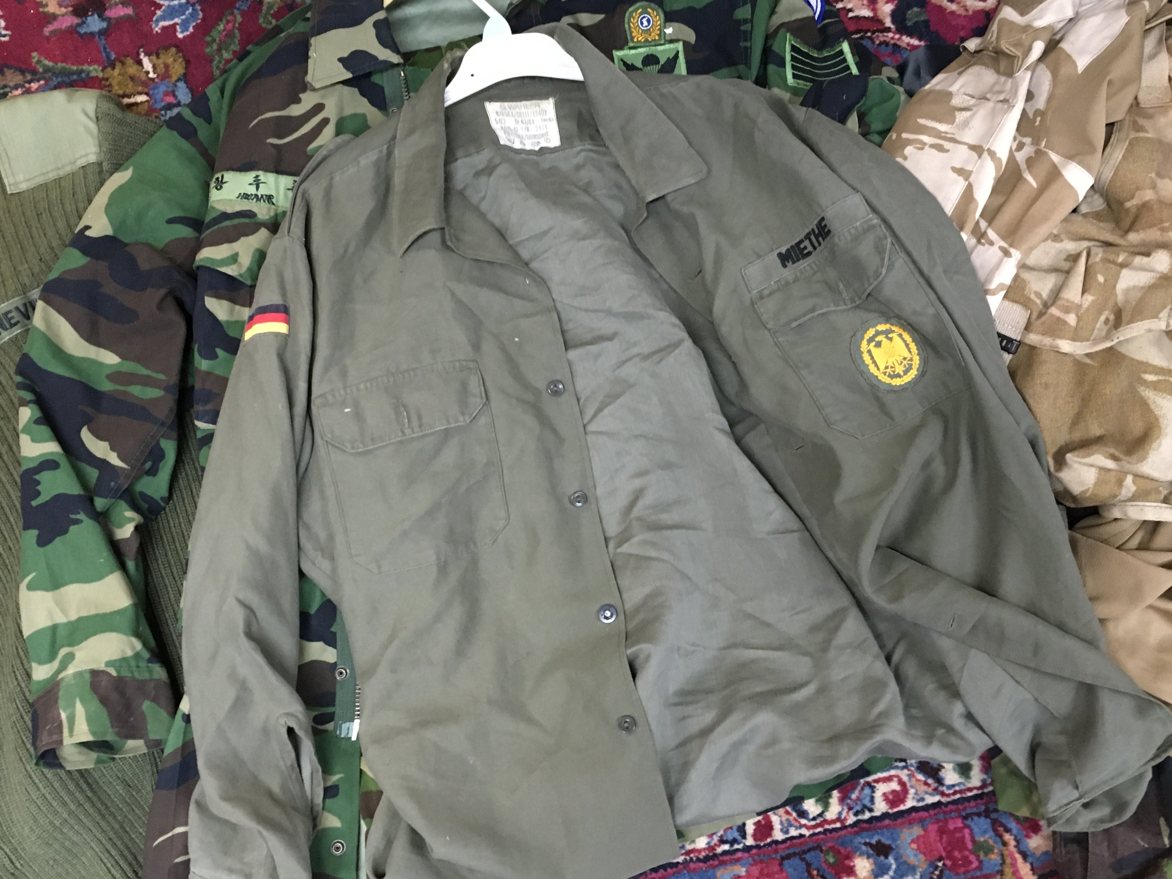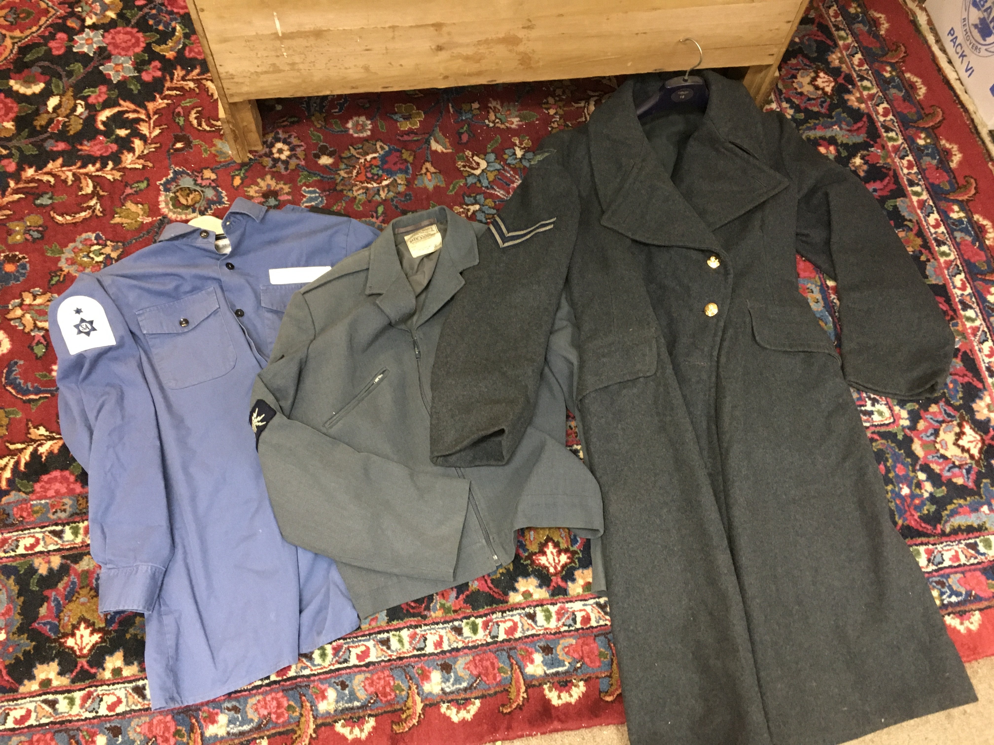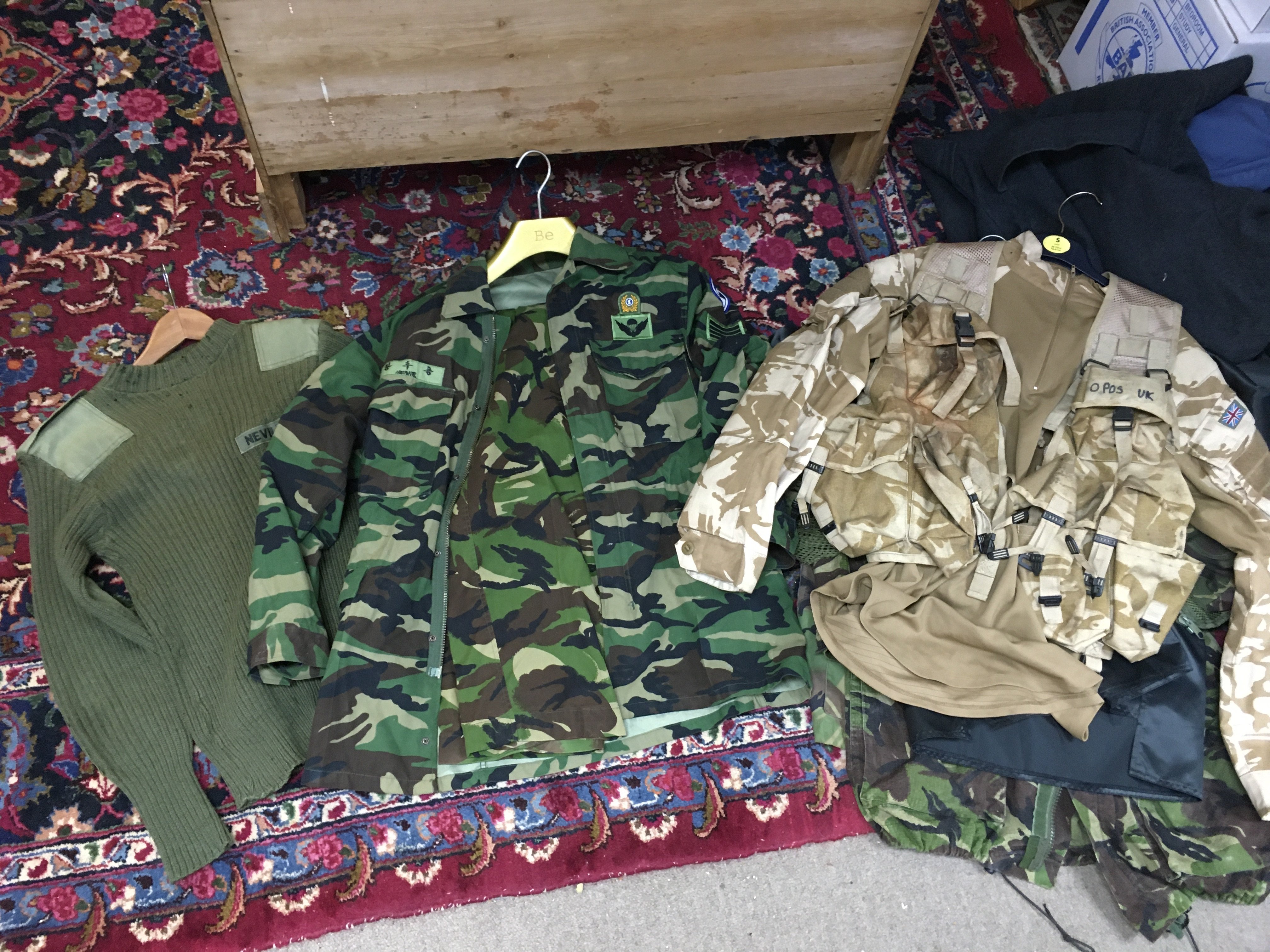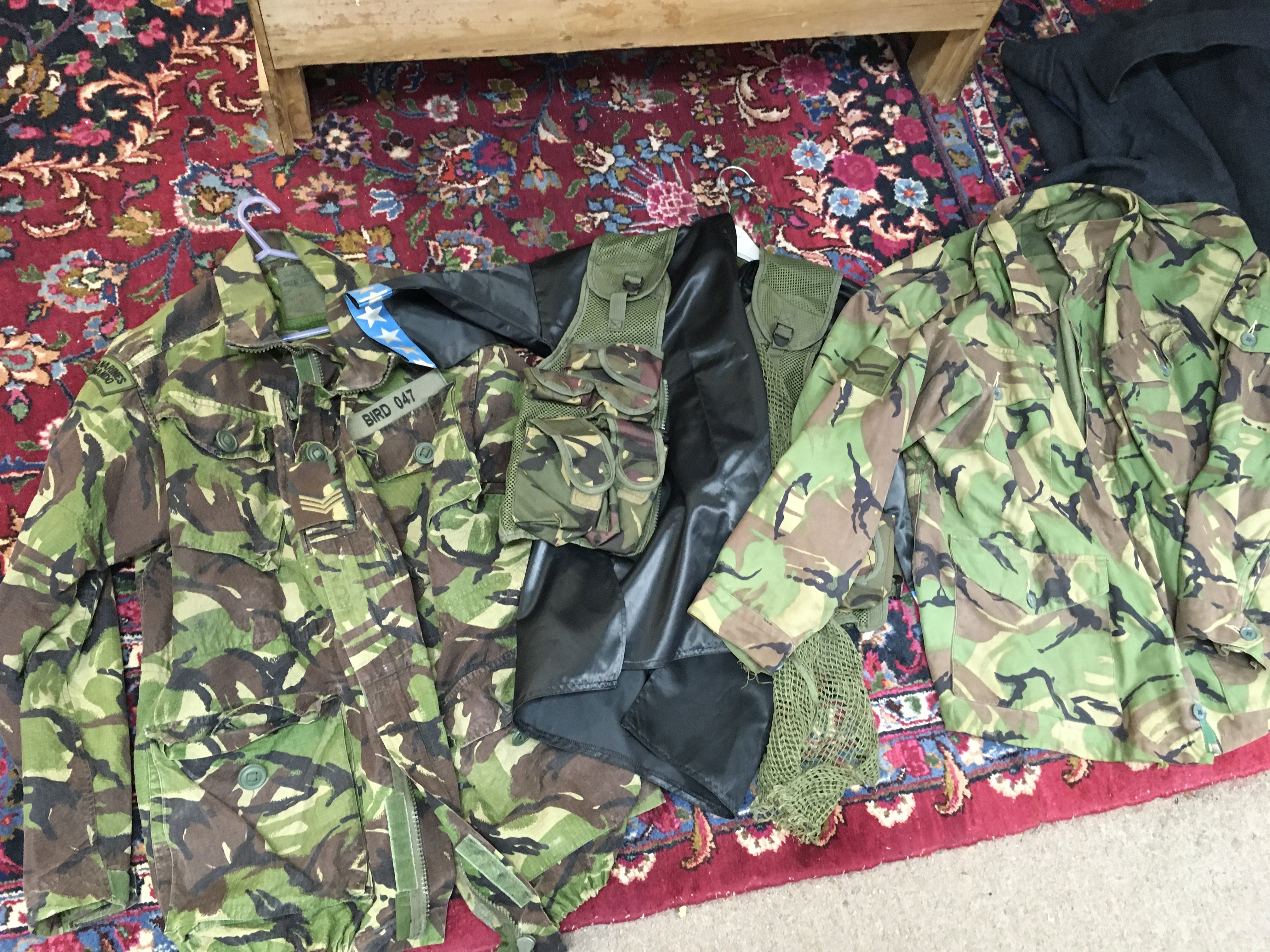 A collection of retrospective military uniforms including RAF jacket, Kriegsmarine jacket ,RAF Long coat, Royal Marines commando camo jacket etc