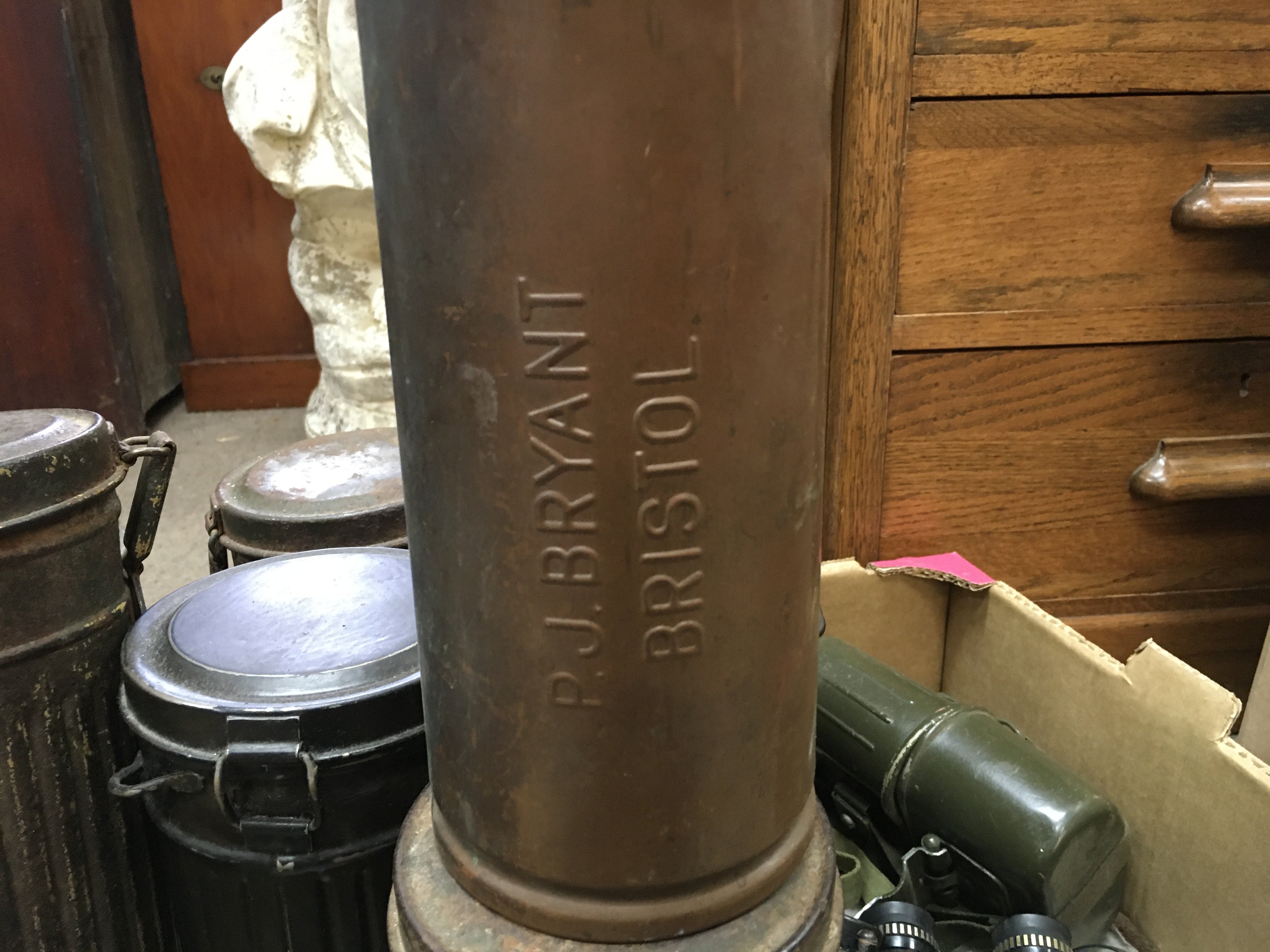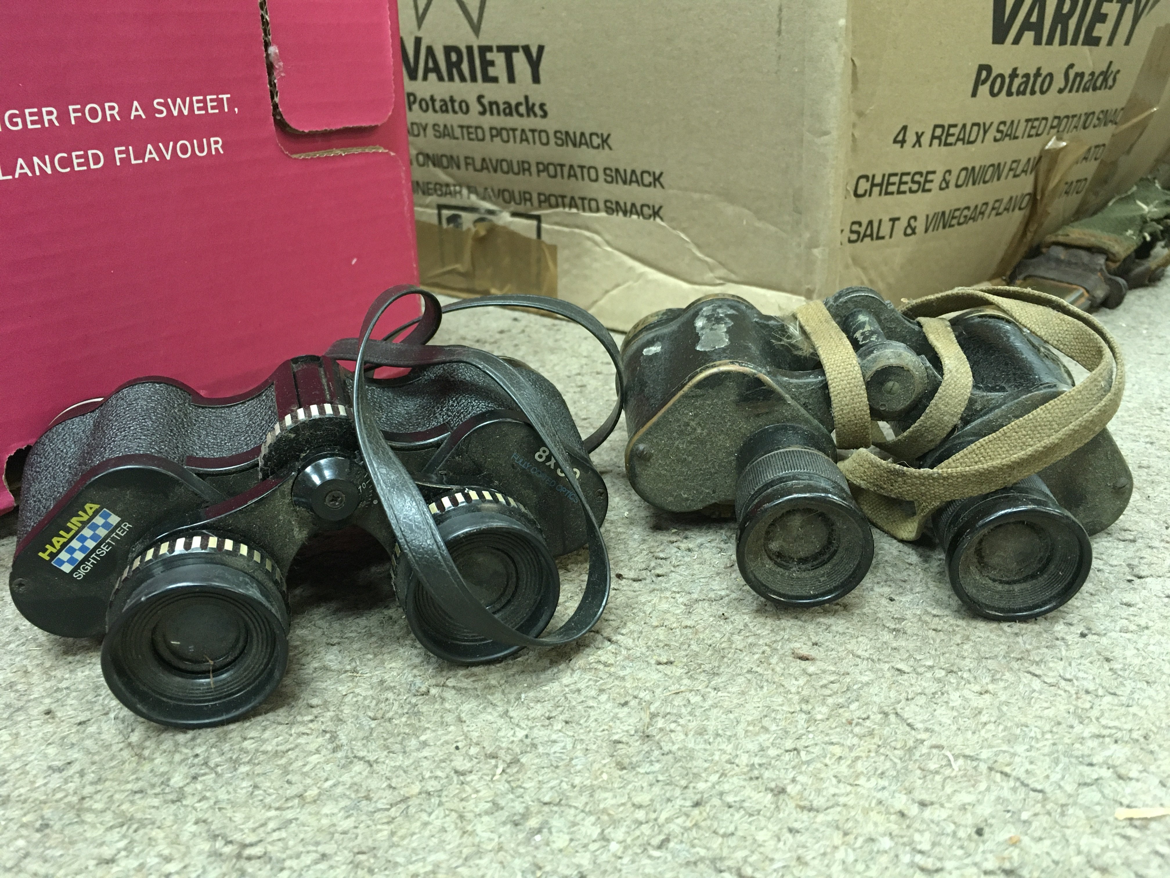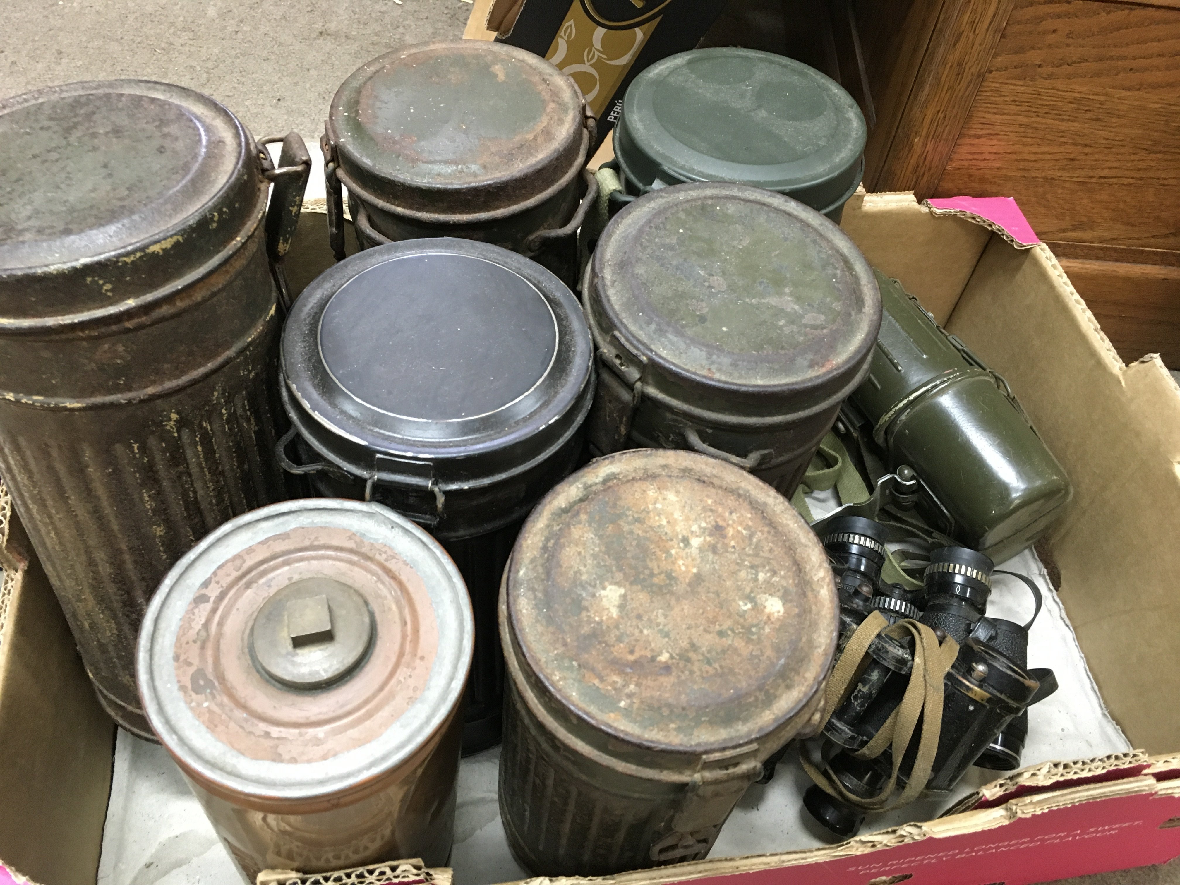A collection of German gas mask cans , Bristol gas lamp cans, binoculars. no reserve