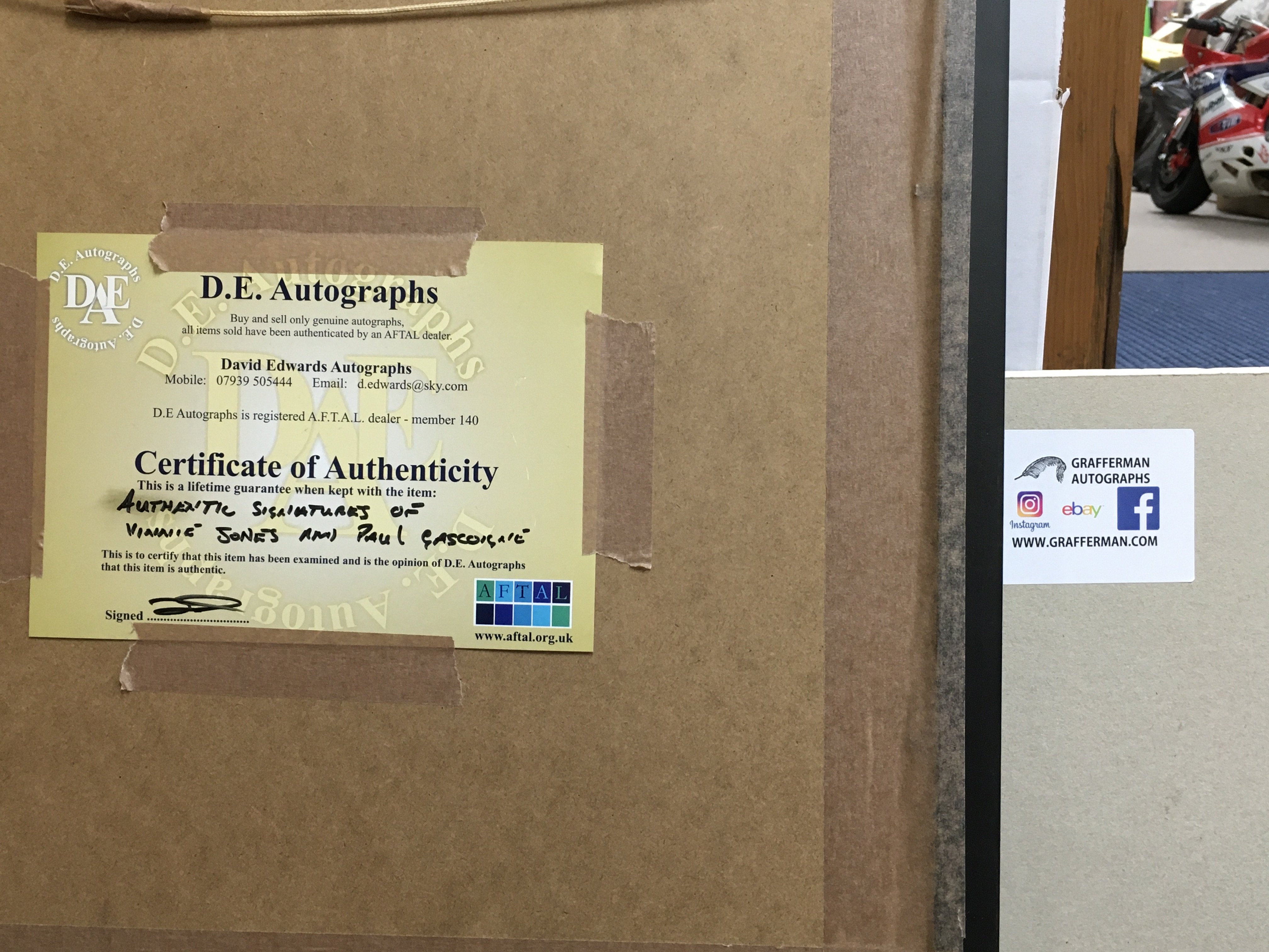 Framed and signed Vinnie Jones and Paul Gascoigne print with COA (46x56cm frame size) and a Nevill Southall autograph. This lot can be posted without the glass frame. Postage category B