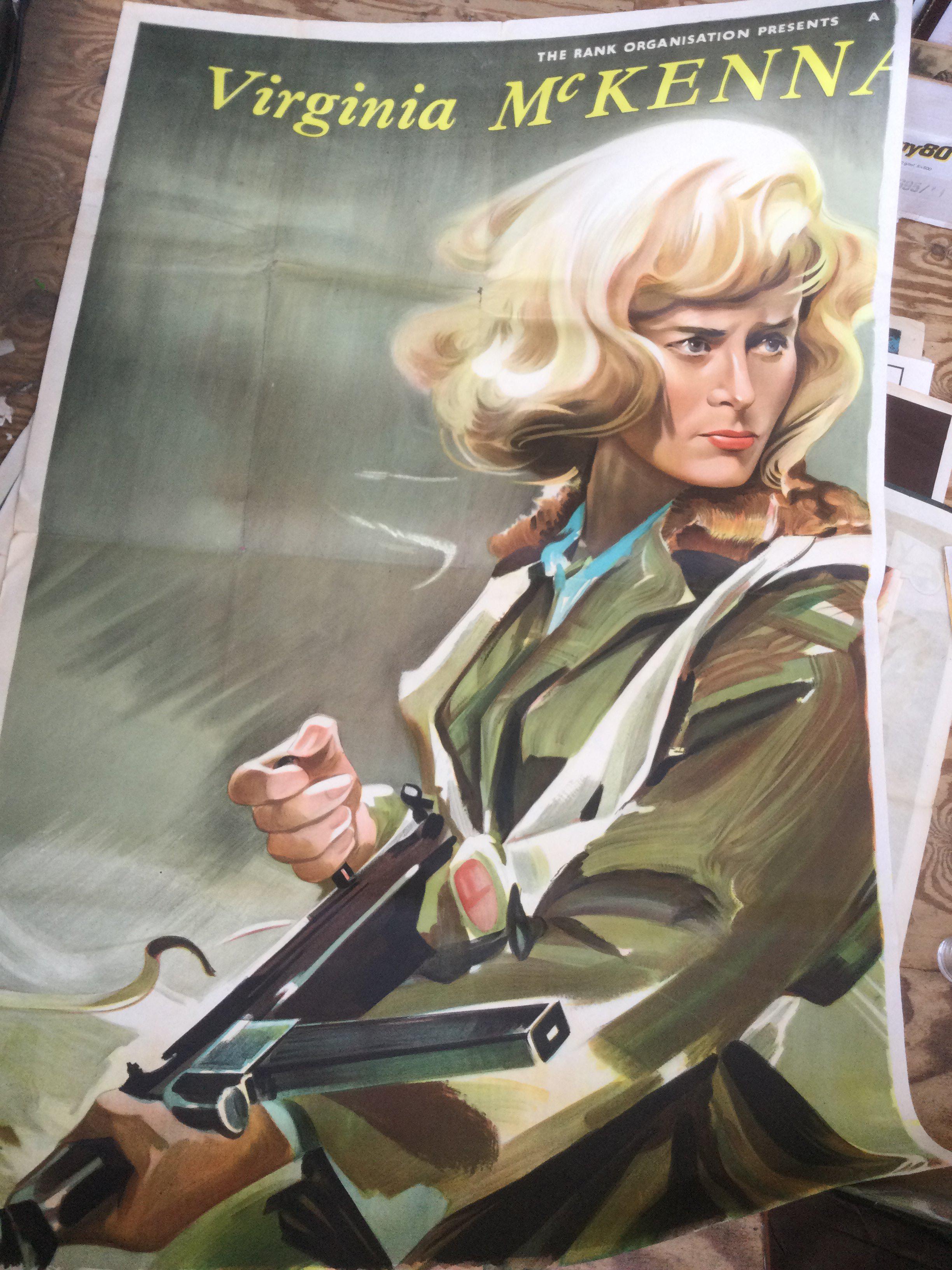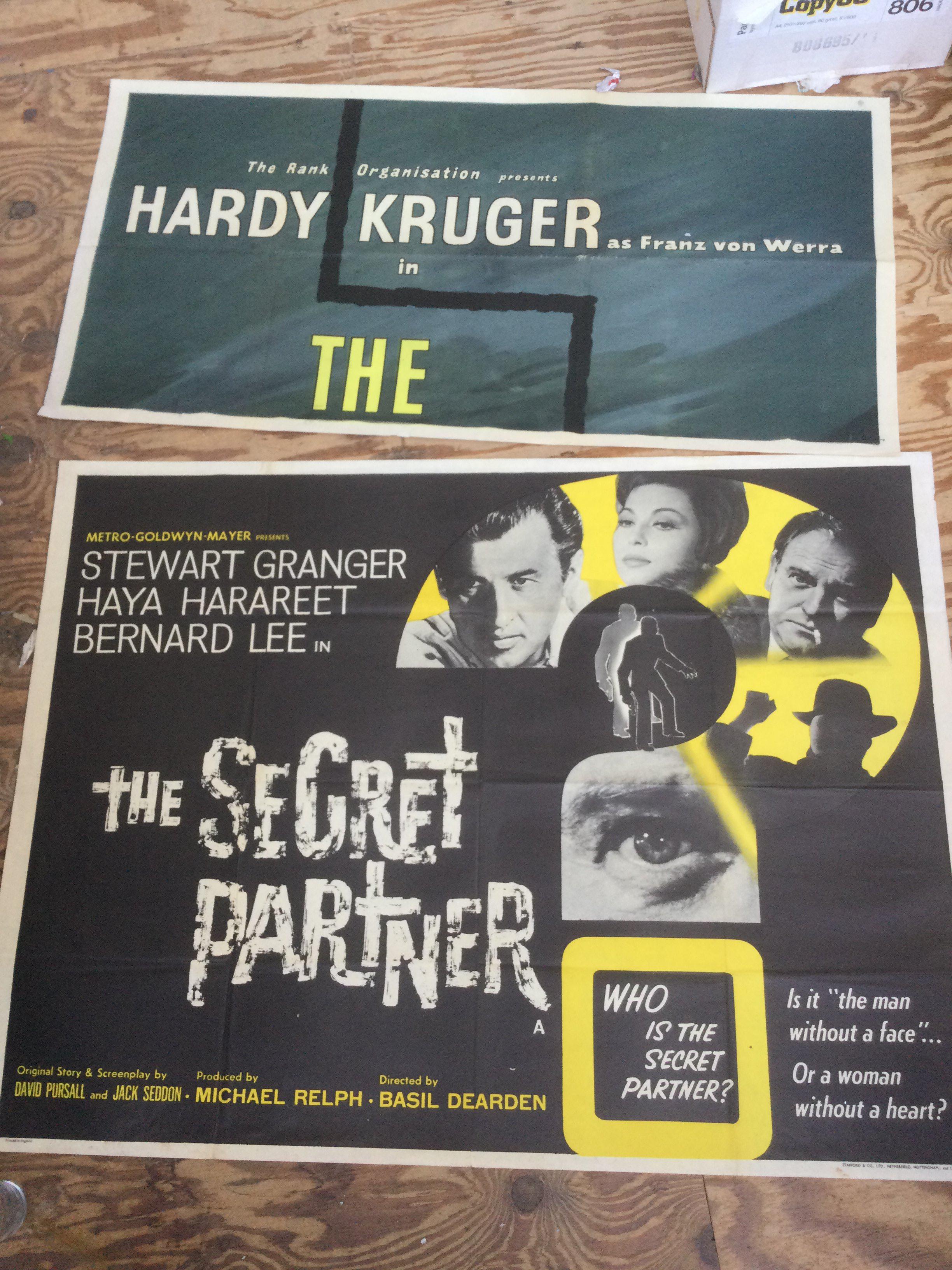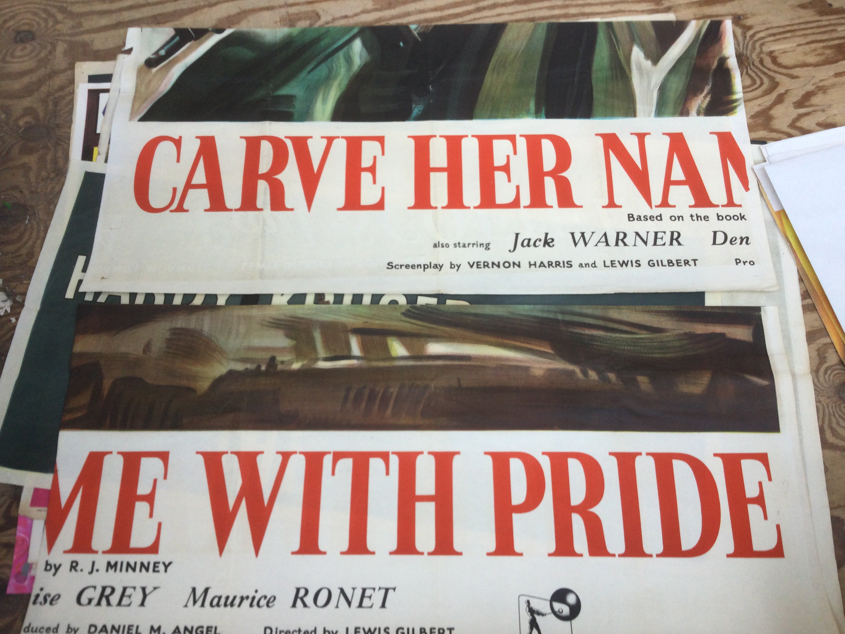 A collection of vintage film posters including various sections of billboard posters including Carve Her Name With Pride, Never Let Go and others.