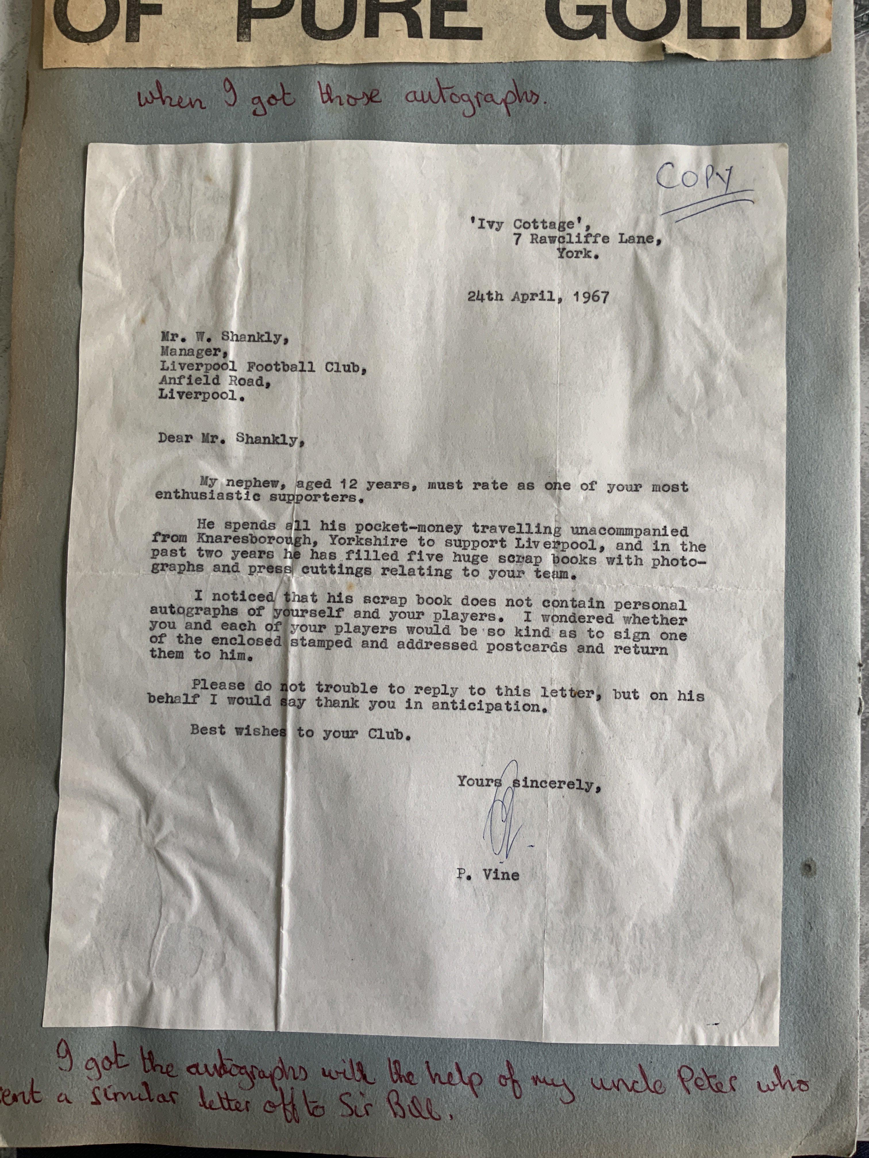 Liverpool 1967 Football Autographs: White postcards signed in 1967 with correspondence between recipient in the form he sent to Bill Shankley asking for the autographs for his nephew and a further letter to the nephew to say they are enclosed. The 12 postcards are hand signed and clipped into scrapbook with removable plastic to each one. Includes Shankley St John Callaghan Hunt Thompson Byrne Hughes Milne Lawrence Lawler and others.