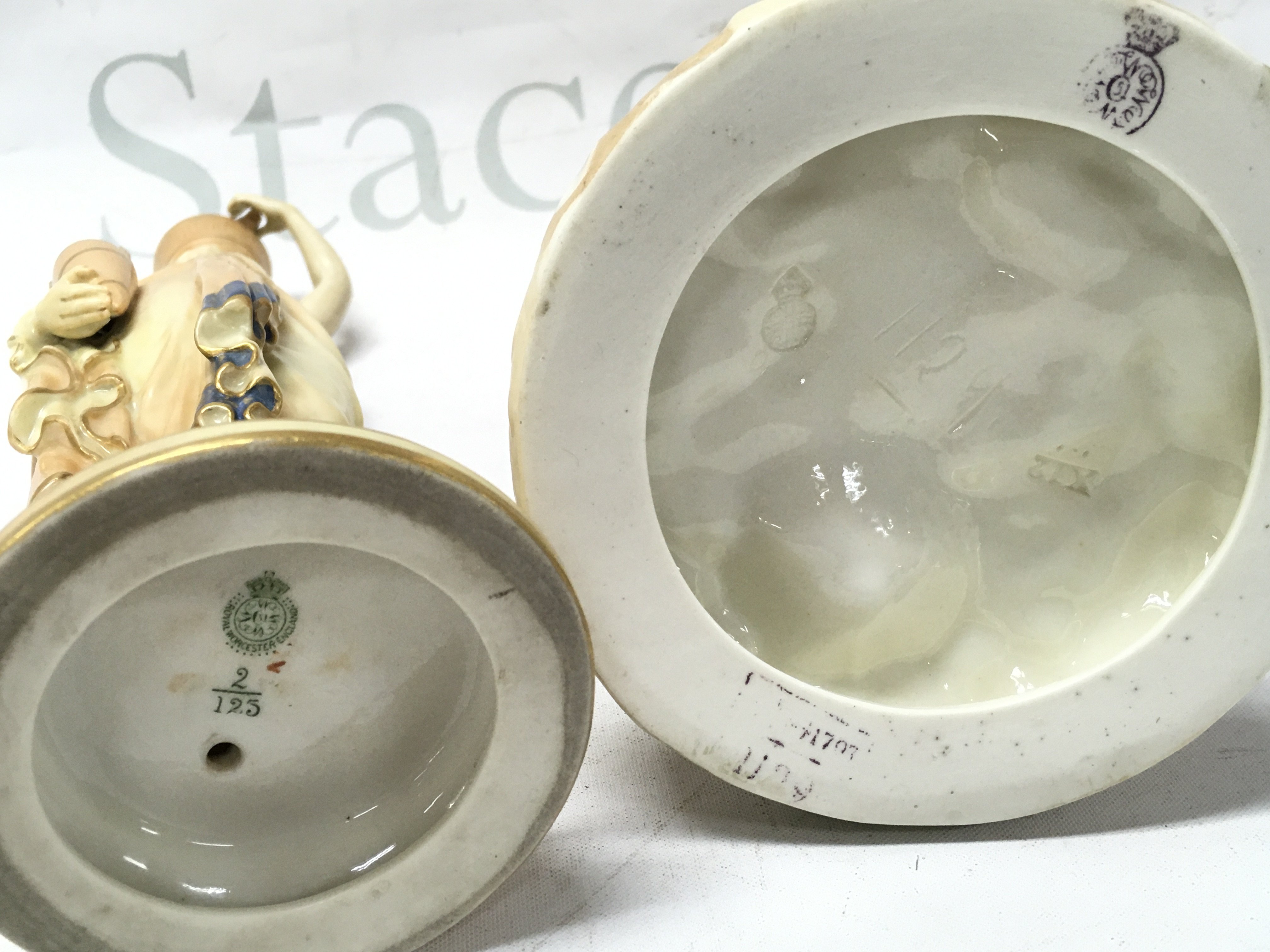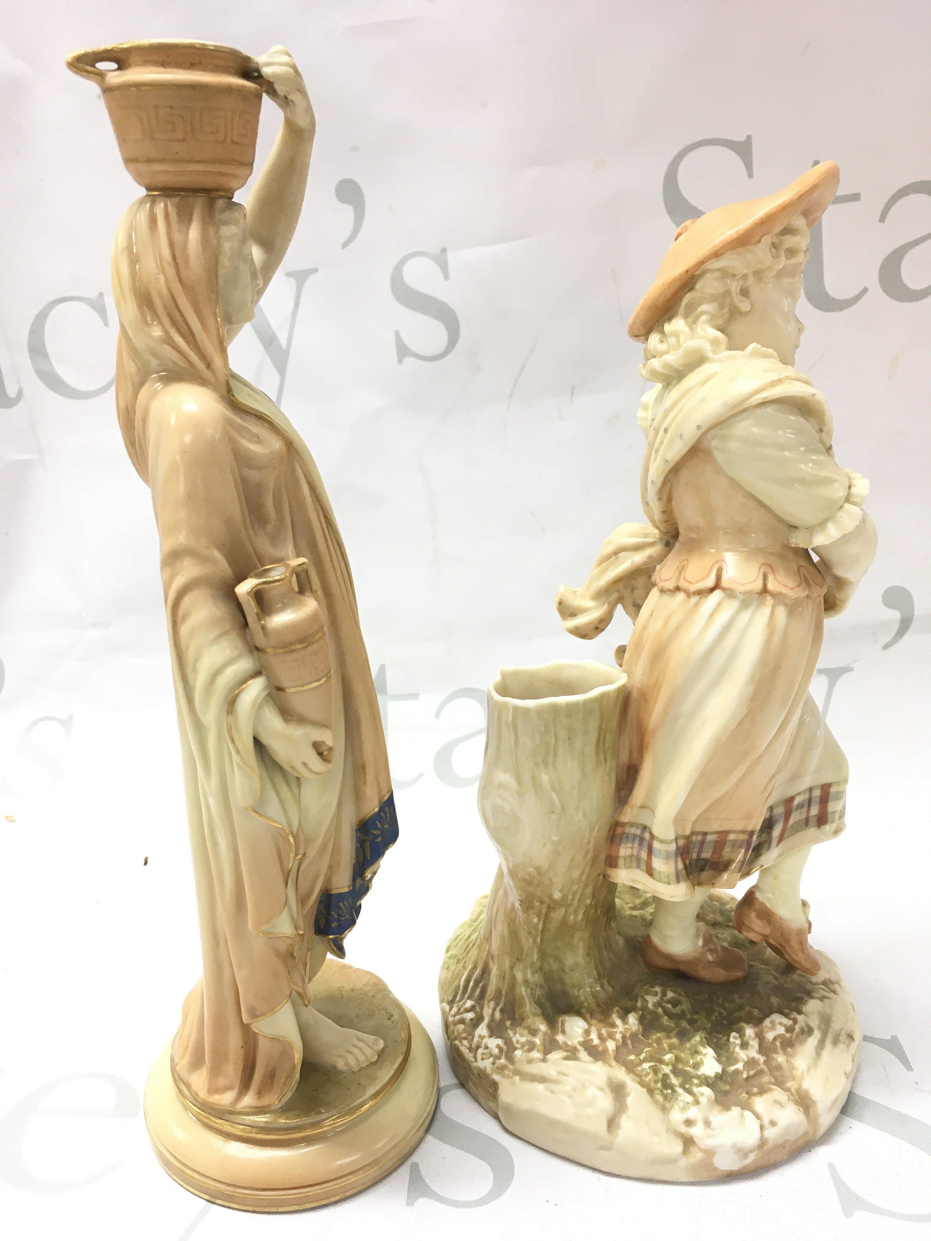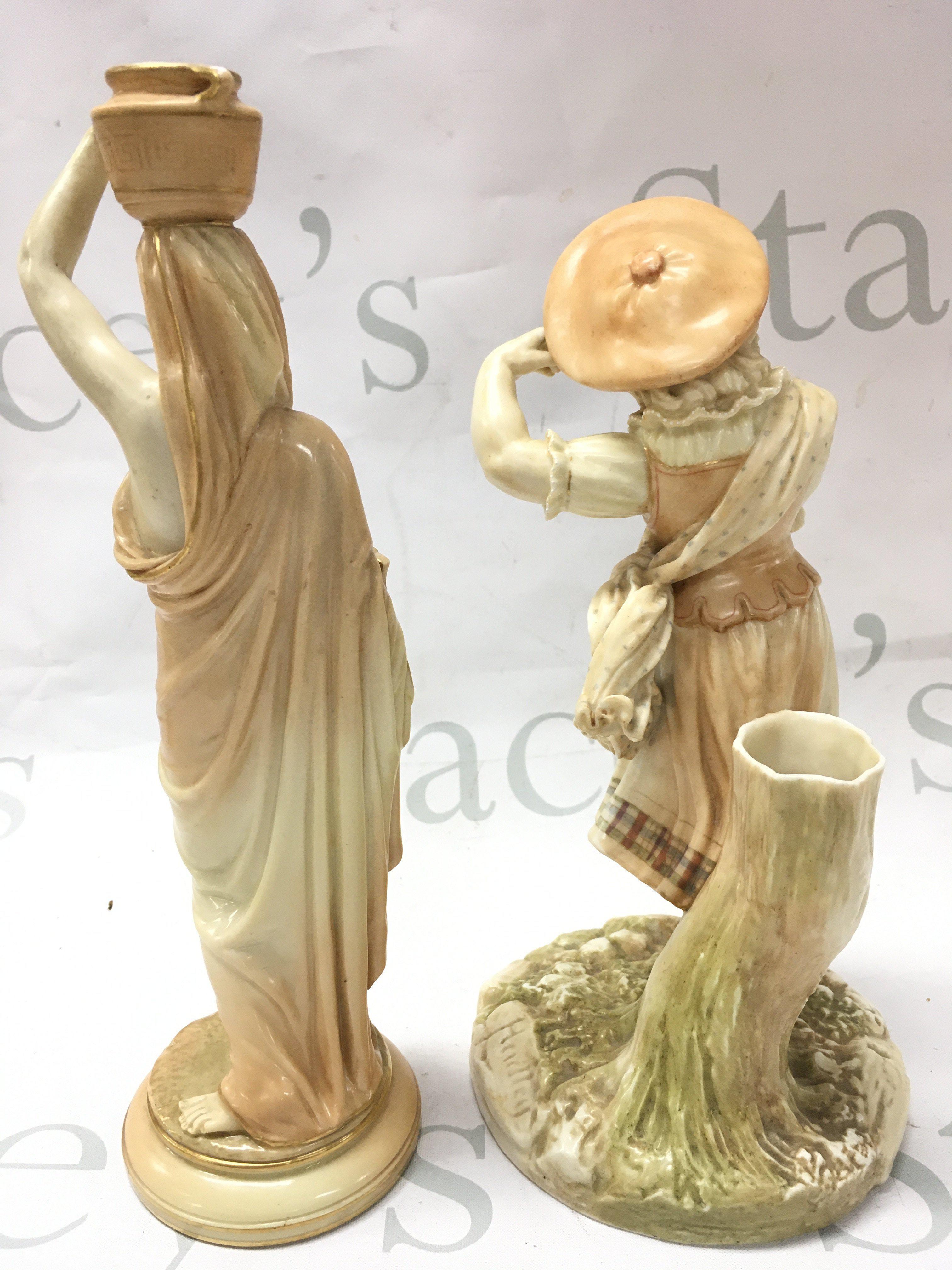 Two Victorian blushed Ivory Royal Worcester porcelain figures , female water carrier and a young girl signed Hadley. 25 and 23cm tall. This lot cannot be posted