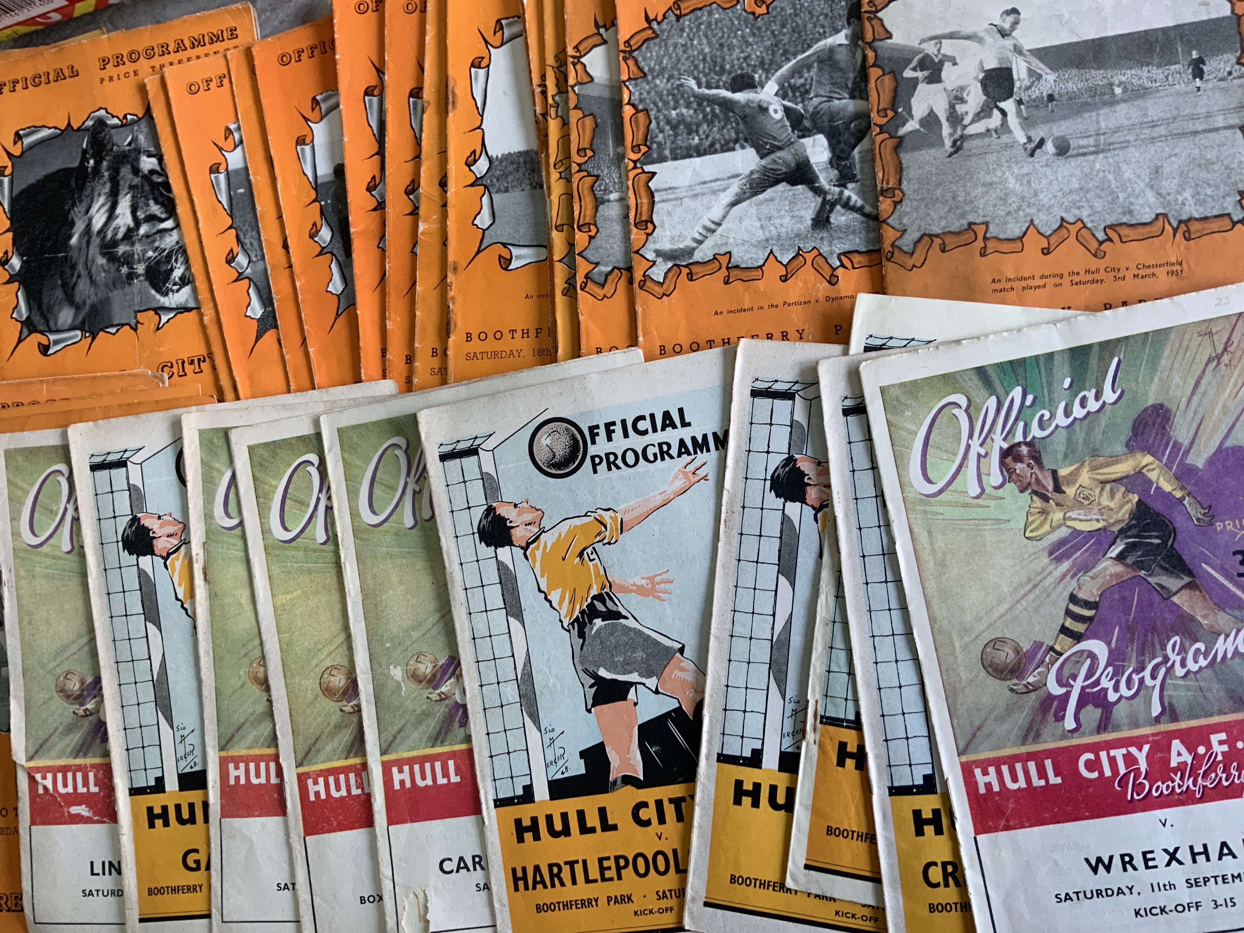 Hull City Home Football Programmes: From 1947 to 1954 in fair overall condition. Programmes v 48/49 Wrexham Hartlepool Chester Southport Crewe Gateshead and some others are very good. The 50s programmes tend to have rusty staples. (54)