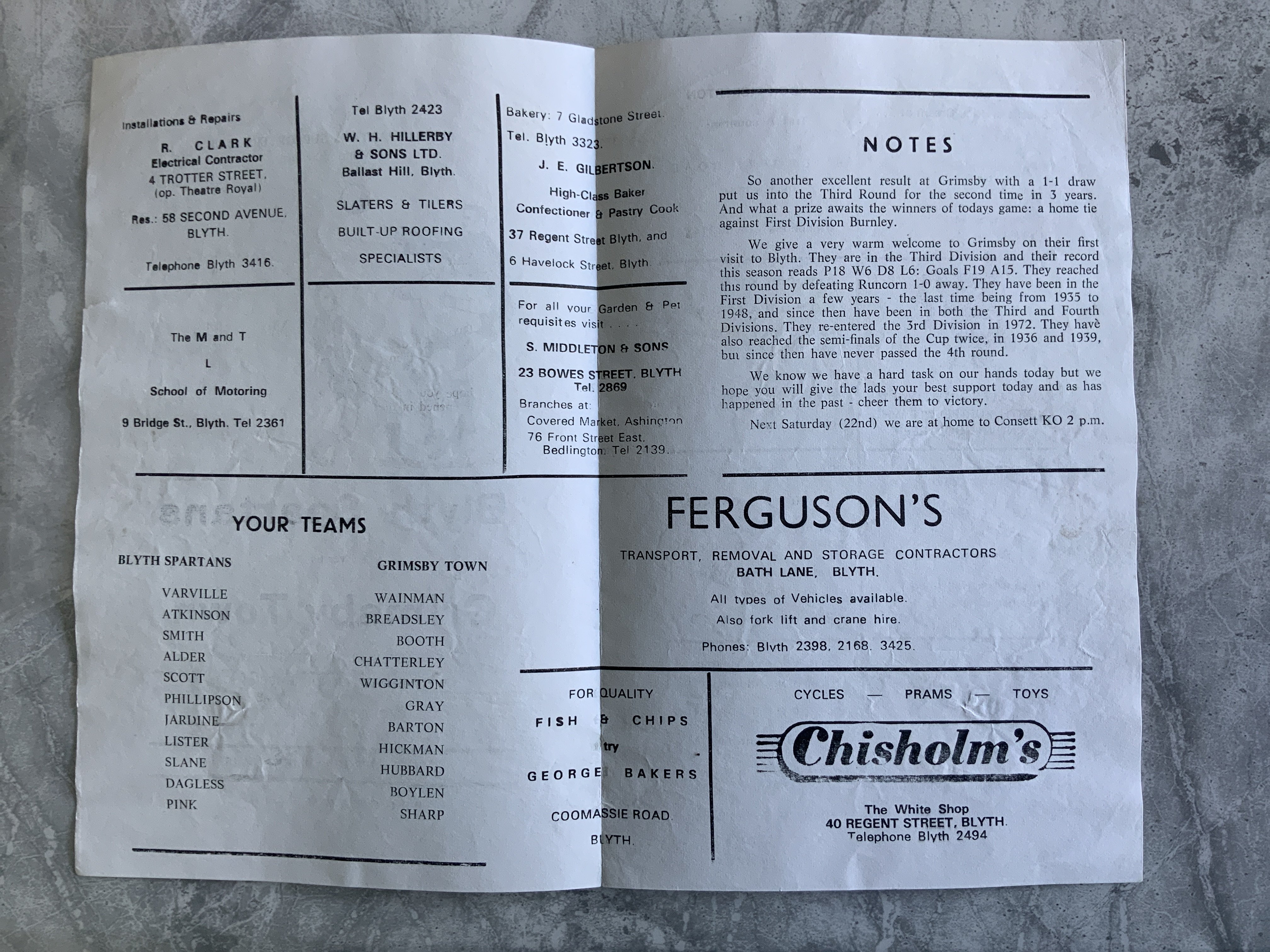 73/74 Blyth Spartans v Grimsby FA Cup Replay Football Programme: Hard to obtain 4 page programme we are informed quickly produced for a Wednesday afternoon match. Good with no team changes.