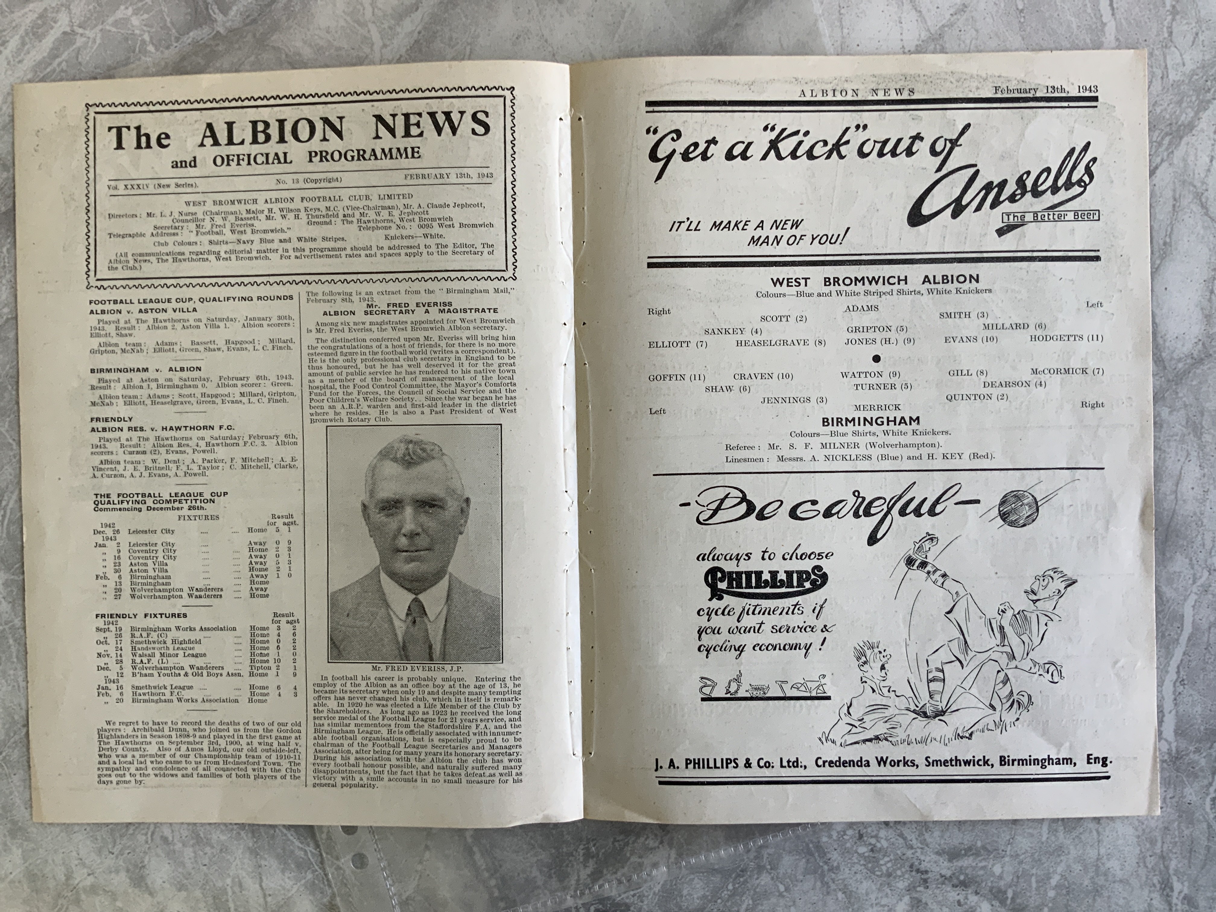 42/43 West Brom v Birmingham Football Programme: Excellent condition ex bound with no team changes dated 13 2 1943.