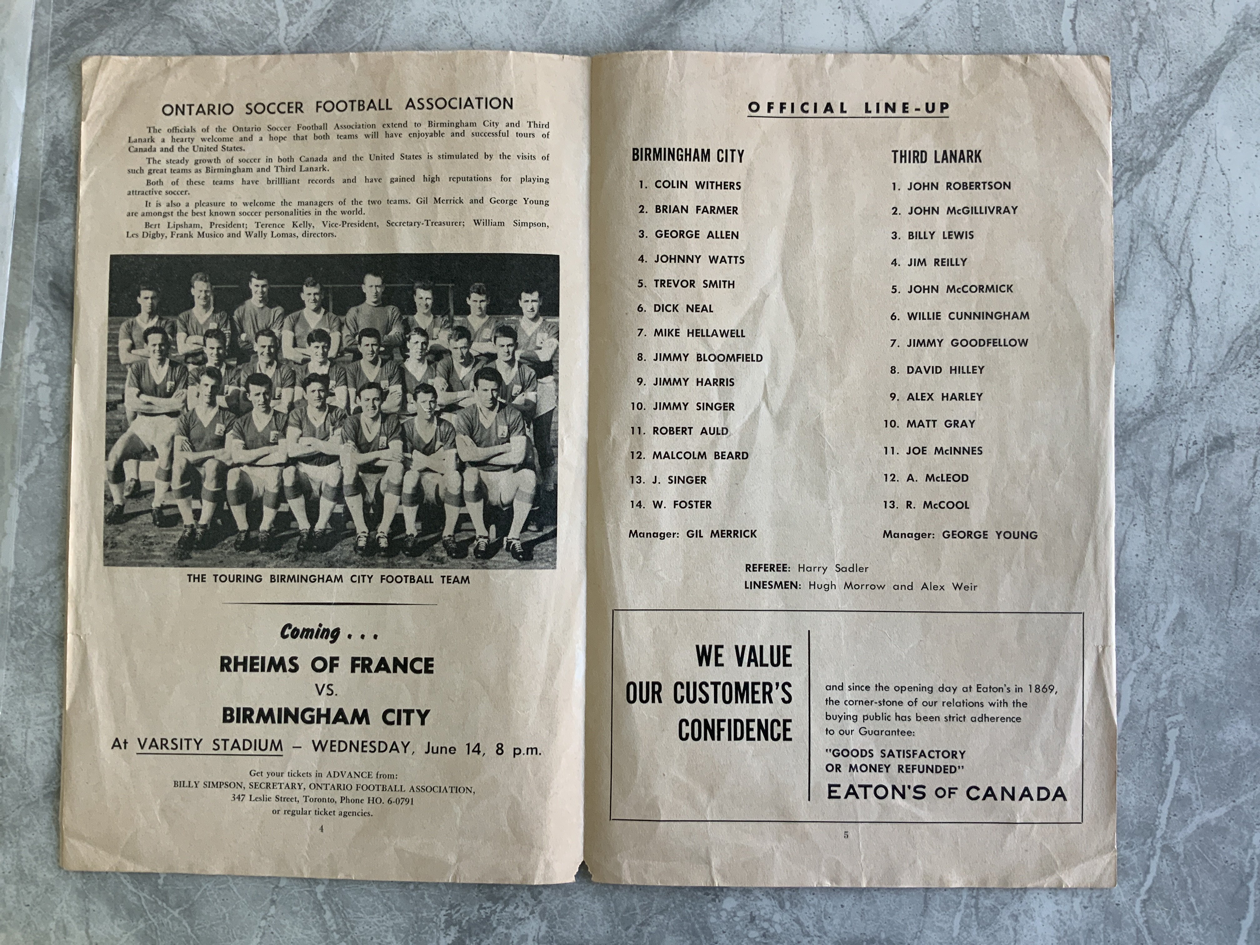 1961 Birmingham v Third Lanark Canada Tour Football Programme: Fair condition with creasing dated 27 5 1961 played in Toronto. No team changes.