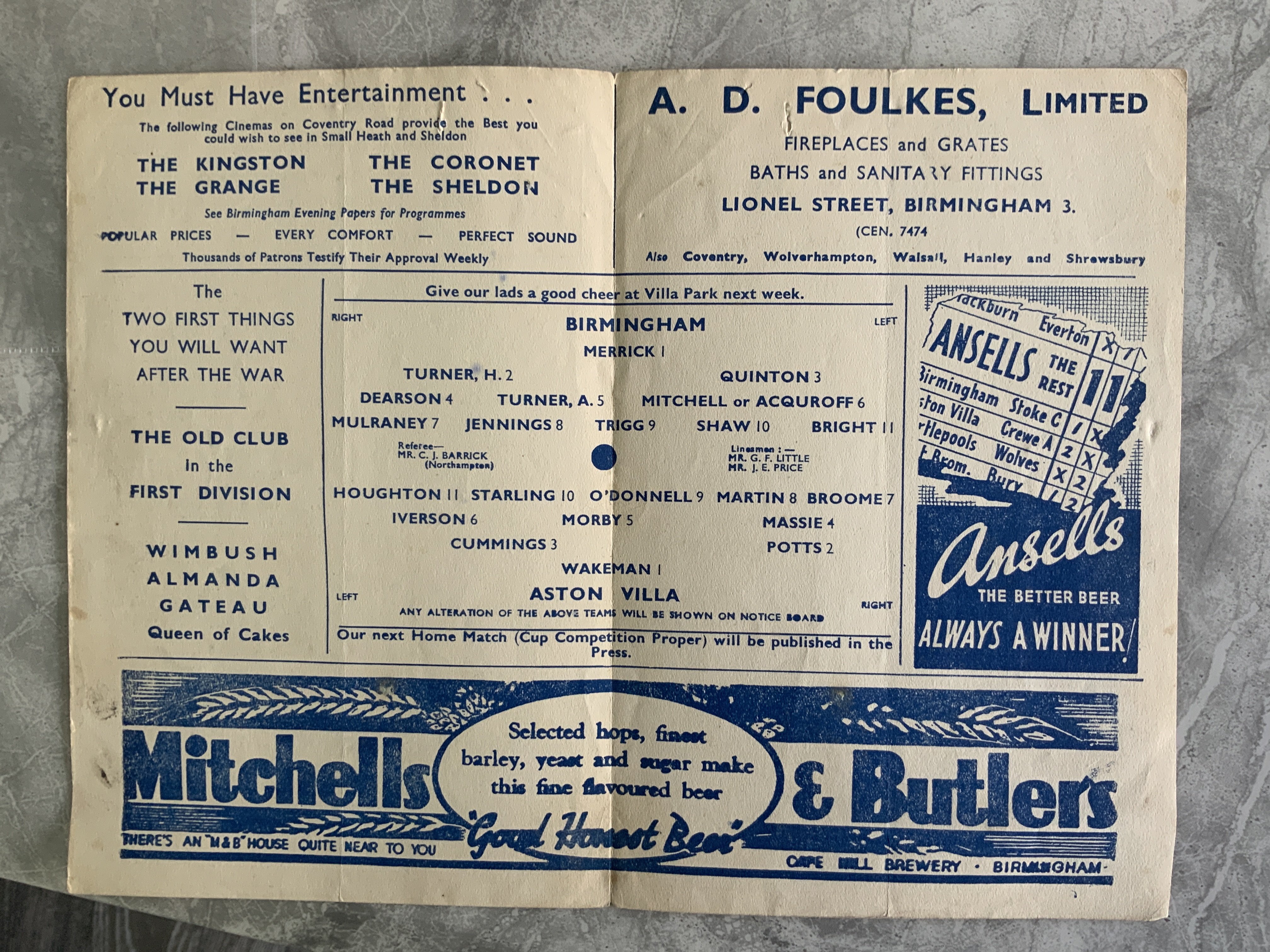 43/44 Birmingham v Aston Villa Football Programme: Good condition 4 pager with no team changes dated 19 2 1944.