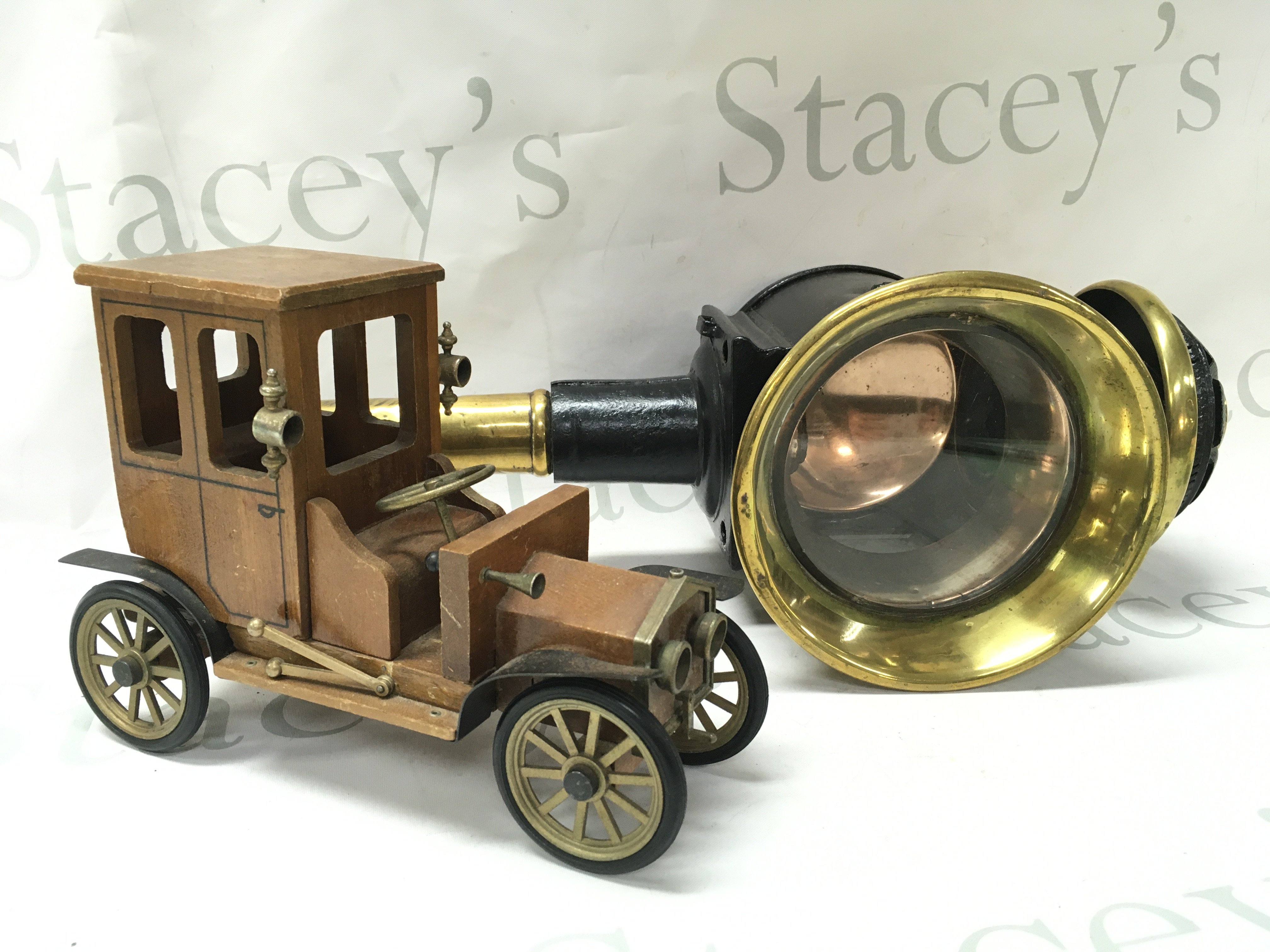A carriage lamp and a vintage wooden car . This lot cannot be posted