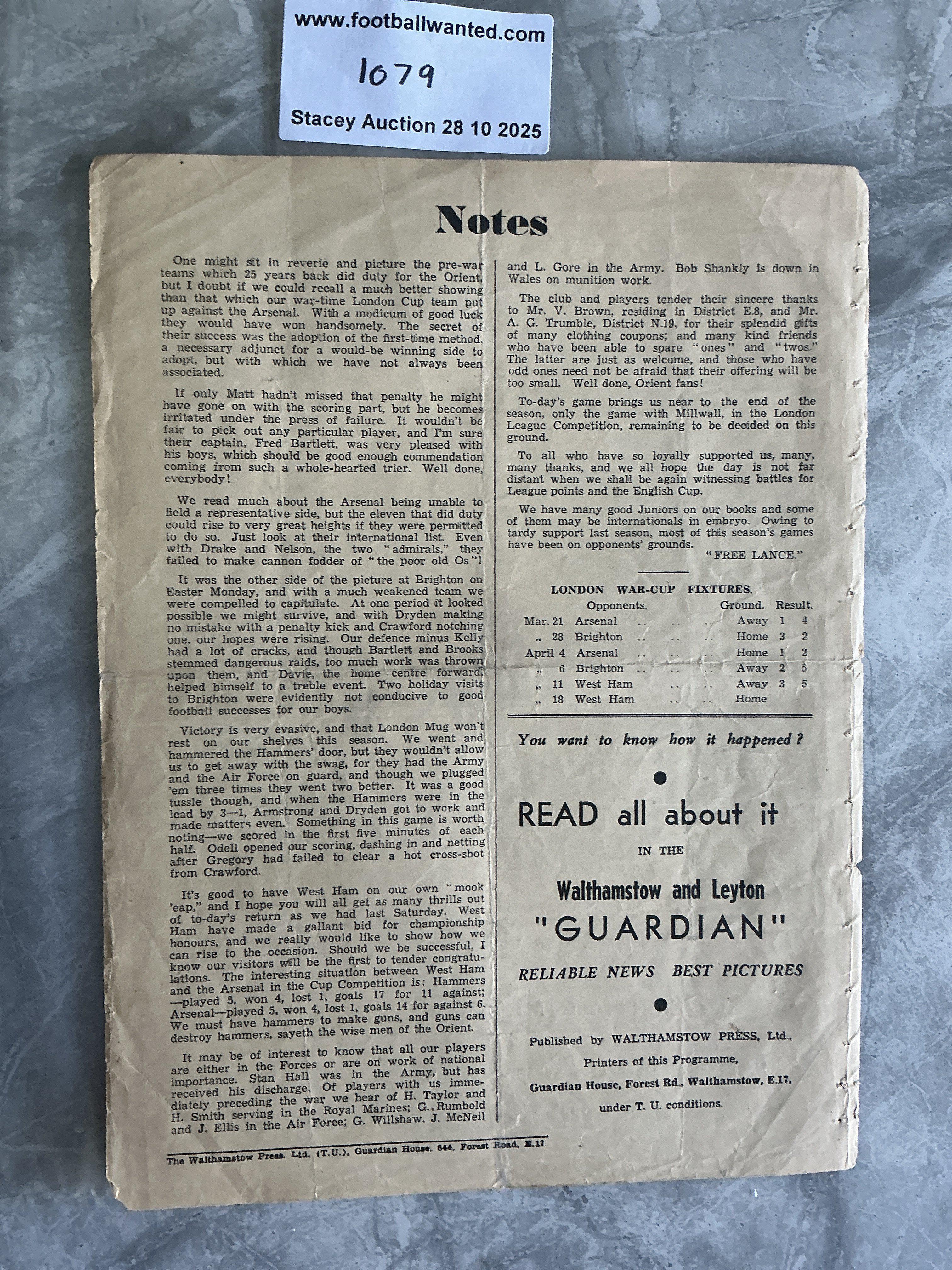 1941 - 1942 Orient v West Ham Football Programme: Ex bound single sheet London Cup match dated 18 4 1942. Tram changes score and folding.