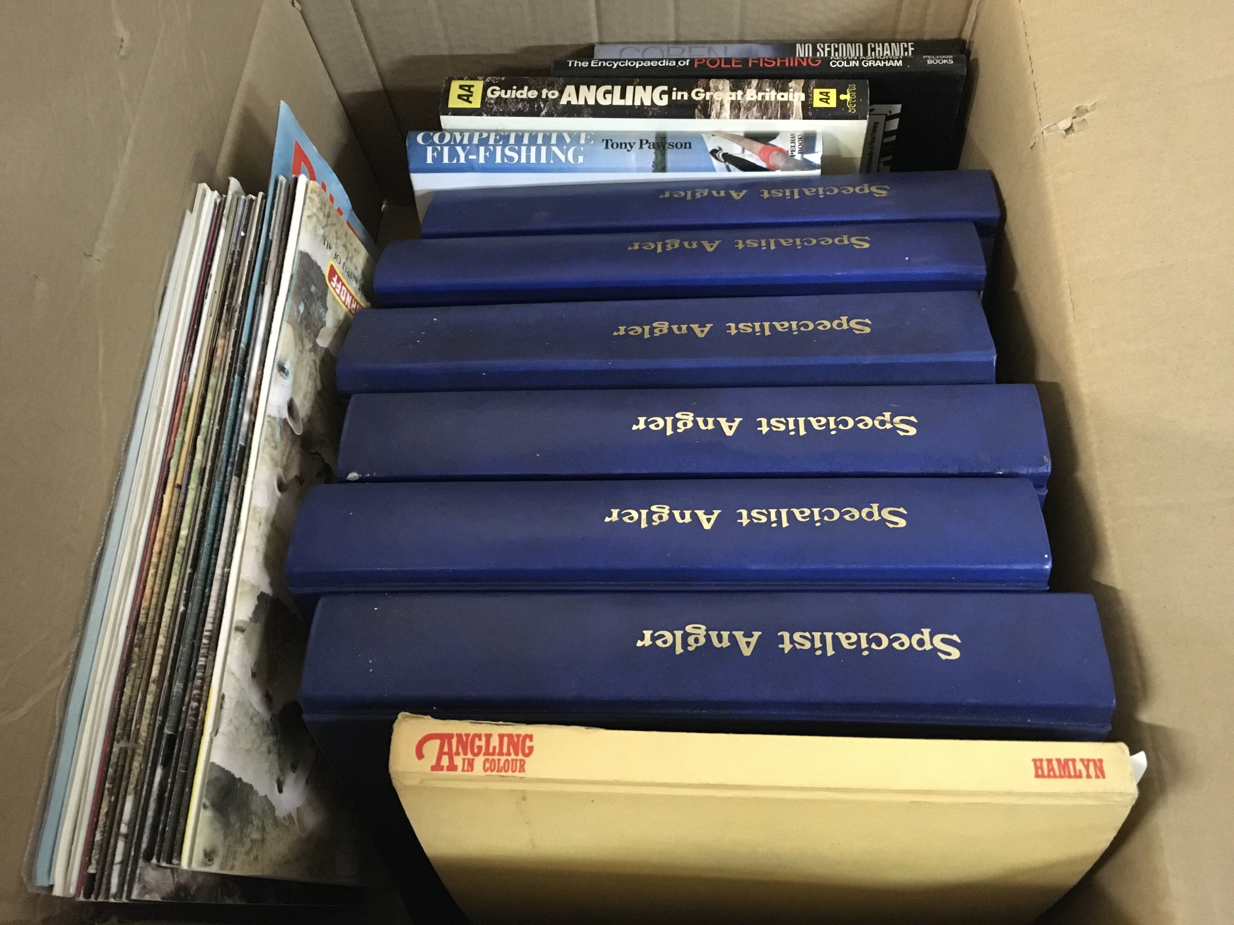 Fishing books including the specialist Anglia bound volumes including the sort after volume 3, Angling in colour by Hamlyn, vintage pike and rainbow runner magazines etc