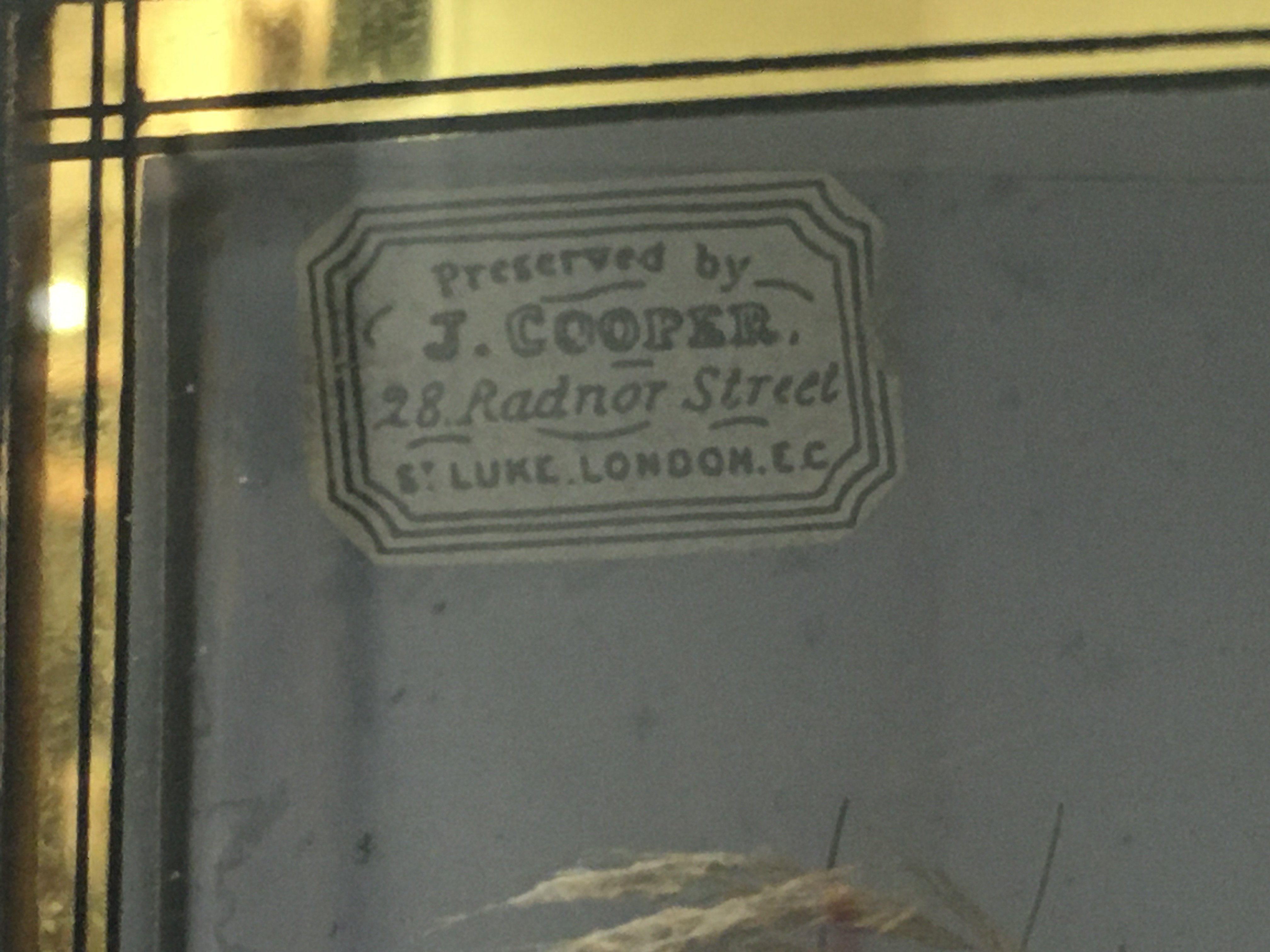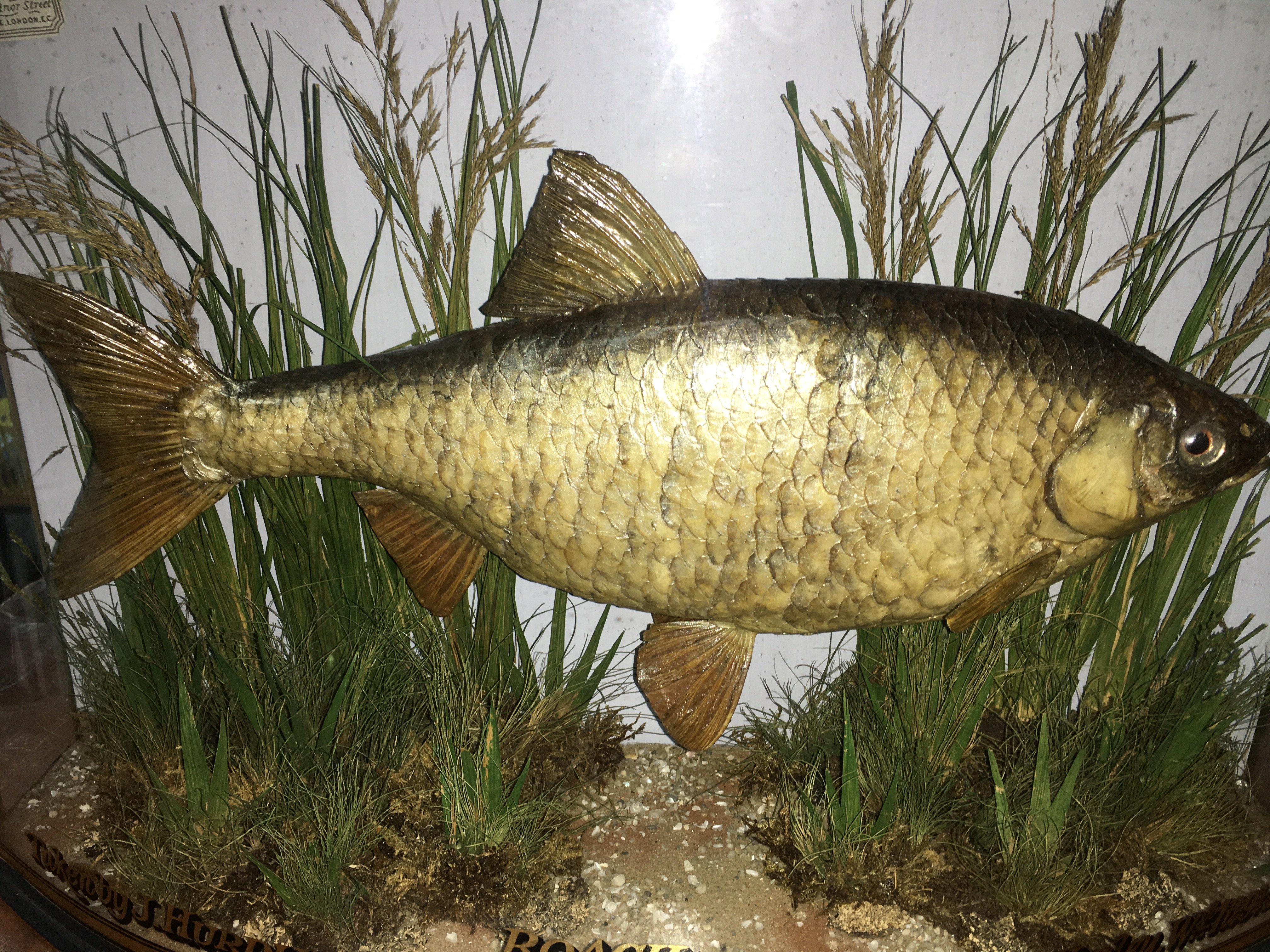 A cased taxidermy Roach , the label reads Taken by J.Hurdly Jan 30th 1887 in River Thames at Henley. Preserved by J. Cooper 28 Radnor Street St Luke London. Case dimensions 45cm wide 29cm tall 14cm deep. This lot cannot be posted